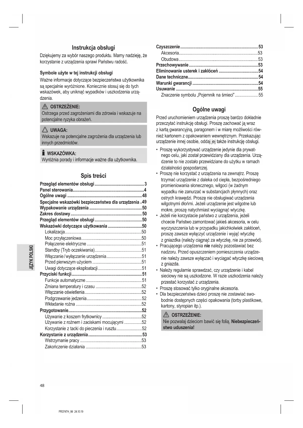 - Dla bezpieczeństwa dzieci proszę nie zostawiać swo- bodnie dostępnych części opakowania (torby plastikowe, kartony, styropian itp.). OSTRZEŻENIE: Nie pozwalaj dzieciom bawić się folią. Niebezpieczeń- stwo uduszenia!FR3747H_IM 24.10.19