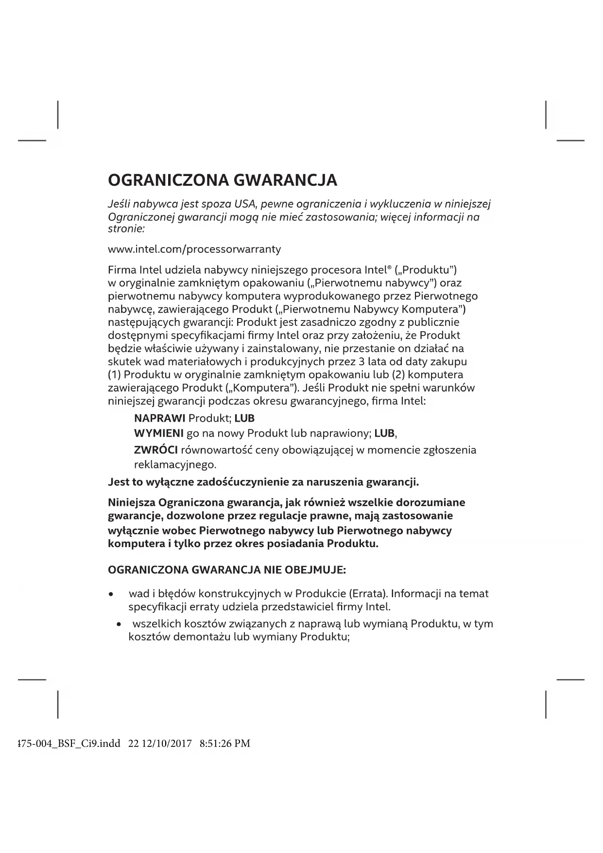 Odpowiedzialność rmy Intel wynikająca z niniejszej lub dowolnej innej gwarancji dorozumianej lub bezpośredniej ogranicza się do naprawy, wymiany lub zwrotu kosztów. W przypadku naruszenia gwarancji takie zadośćuczynienie jest jedynym i wyłącznym środkiem. W maksymalnym zakresie przewidzianym prawem rma Intel nie ponosi odpowiedzialności za żadne bezpośrednie, szczególne, przypadkowe ani wynikowe szkody, wynikające z wszelkich naruszenia gwarancji, ani w myśl żadnych innych teorii prawnych (łącznie z utratą zysków, przestojem, utratą wartości przedsiębiorstwa, uszkodzeniem lub wymianą sprzętu lub własności, ani żadnych kosztów usuwania skutków awarii, przeprogramowania lub odtwarzania programów lub danych przechowywanych lub używanych w Komputerze), nawet jeśli J61475-004_BSF_Ci9.indd 24 12/10/2017 8:51:26 PMrma Intel została poinformowana o możliwości wystąpienia takich szkód.Wniektórychstanach(ijurysdykcjach)wykluczanieiograniczanie odpowiedzialnościzaszkodyprzypadkoweiwynikowejestniedozwolone, więctoograniczeniemożeniedotyczyćNabywcy. Niniejsza gwarancja nadaje nabywcy określone prawa. Nabywca może mieć również inne prawa zależne od regionu i jurysdykcji.Stronyzgadzają się,żeKonwencjaNarodówZjednoczonychoumowachmiędzynarodowej sprzedażytowarów(1980)jestwyłączonainiemazastosowaniado niniejszejUmowy.Wszelkiesporywynikającelubzwiązanezniniejszą Ograniczonągwarancjąbędąrozpatrywaneprzeznastępującesądyibędą podlegaćnastępującymprzepisom(zwyjątkiemChinkontynentalnych), bezwzględunazasadykoniktupraw:wprzypadkuUSAipozostałych częściAmeryk,właściwymmiejscemjestsądstanuDelaware,(USA)lubsądy federalnewtympaństwie,awłaściwymprawemjestprawoobowiązującew stanieDelaware.WprzypadkukrajówAzjiiPacykuwłaściwymmiejscem jestSingapur,awłaściwymprawemprawoobowiązującewSingapurze.W przypadkuJaponiiwłaściwymmiejscemjestTokio,awłaściwymprawem prawoobowiązującewJaponii.DlaEuropyiresztyświatawłaściwym miejscemjestLondyn,awłaściwymprawemprawoAngliiiWalii. WprzypadkuniezgodnościwersjiangielskiejOgraniczonejgwarancjiz wersjąprzetłumaczoną,rozstrzygająceznaczeniebędziemiaławersja angielska(zwyjątkiemwersjiwjęzykuchińskimuproszczonym). J61475-004_BSF_Ci9.indd 25 12/10/2017 8:51:26 PM제한적 보증 미국 이외 지역에 소재하고 있는 소비자인 경우에는 본 제한적 보증의 일부 제한 및 예외 사항이 적용되지 않을 수도 있습니다. 다음 내용을 읽어 주십시오: www.intel.com/processorwarranty 인텔은 원래의 밀봉된 포장에 담겨 제공되는 이 인텔® 프로세서(“제품”)의 구매자(“원 구매자”) 그리고 제품을 포함시켜 원 구매자가 제조한 컴퓨터 시스템의 원 구매자(“ 원 시스템 고객”)에 대해, 제품이 인텔에서 공개한 사양을 대체적으로 준수할 것이며, 제품을 올바르게 사용하고 설치할 경우 (1) 원래 밀봉된 포장에 담긴 제품 또는 (2) 제품이 포함된 컴퓨터 시스템(“컴퓨터 시스템”)의 구매일로부터 3년 동안 재료와 제조상 하자로 인한 작동 중지가 없을 것임을 보증합니다. 보증 기간 중 제품이 위 보증 내용을 준수하지 않을 경우 인텔은 다음 조치 중 하나를 선택합니다.