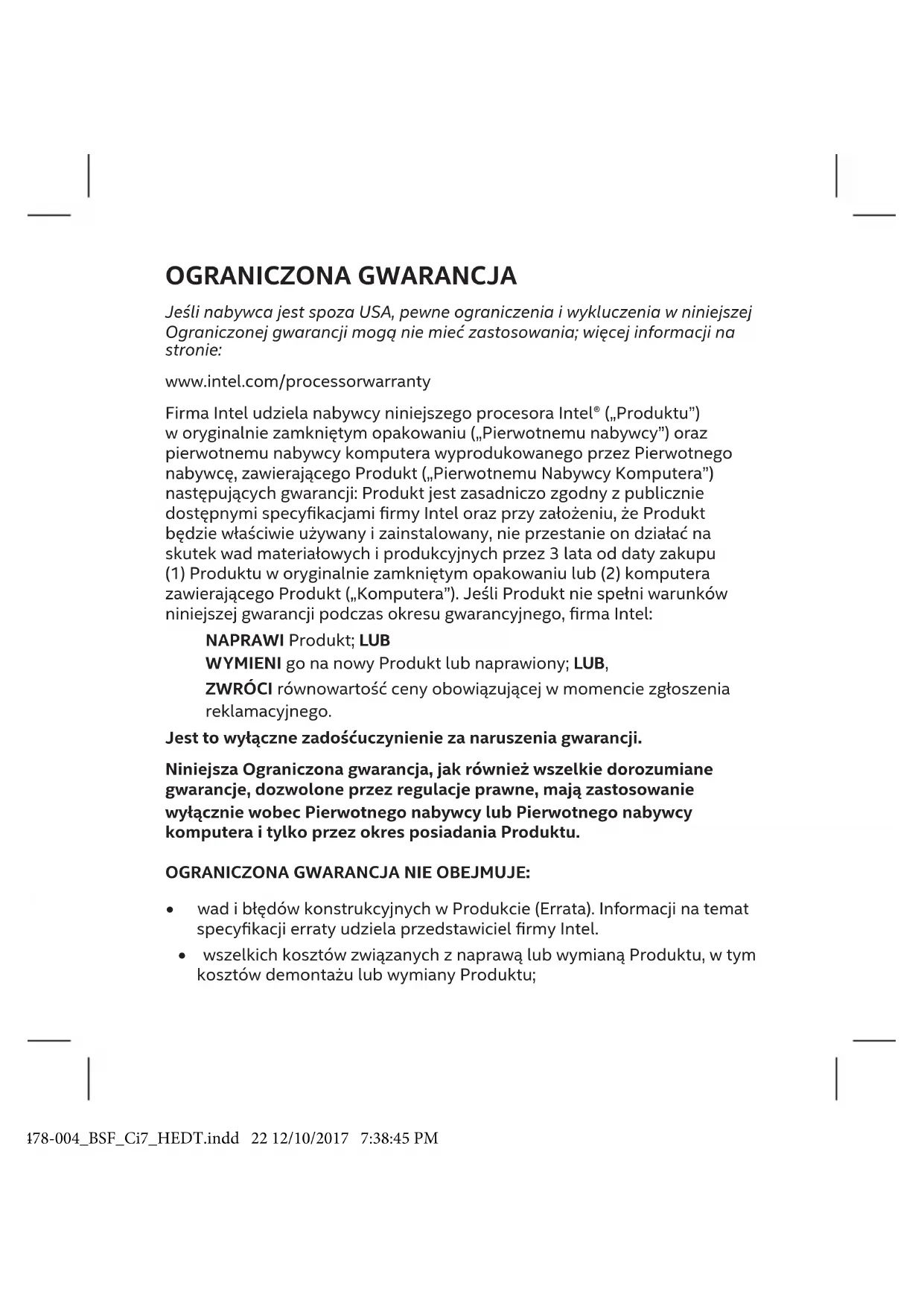 Odpowiedzialność rmy Intel wynikająca z niniejszej lub dowolnej innej gwarancji dorozumianej lub bezpośredniej ogranicza się do naprawy, wymiany lub zwrotu kosztów. W przypadku naruszenia gwarancji takie zadośćuczynienie jest jedynym i wyłącznym środkiem. W maksymalnym zakresie przewidzianym prawem rma Intel nie ponosi odpowiedzialności za żadne bezpośrednie, szczególne, przypadkowe ani wynikowe szkody, wynikające z wszelkich naruszenia gwarancji, ani w myśl żadnych innych teorii prawnych (łącznie z utratą zysków, przestojem, utratą wartości przedsiębiorstwa, uszkodzeniem lub wymianą sprzętu lub własności, ani żadnych kosztów usuwania skutków awarii, przeprogramowania lub odtwarzania programów lub danych przechowywanych lub używanych w Komputerze), nawet jeśli J61478-004_BSF_Ci7_HEDT.indd 24 12/10/2017 7:38:45 PMrma Intel została poinformowana o możliwości wystąpienia takich szkód.Wniektórychstanach(ijurysdykcjach)wykluczanieiograniczanie odpowiedzialnościzaszkodyprzypadkoweiwynikowejestniedozwolone, więctoograniczeniemożeniedotyczyćNabywcy. Niniejsza gwarancja nadaje nabywcy określone prawa. Nabywca może mieć również inne prawa zależne od regionu i jurysdykcji.Stronyzgadzają się,żeKonwencjaNarodówZjednoczonychoumowachmiędzynarodowej sprzedażytowarów(1980)jestwyłączonainiemazastosowaniado niniejszejUmowy.Wszelkiesporywynikającelubzwiązanezniniejszą Ograniczonągwarancjąbędąrozpatrywaneprzeznastępującesądyibędą podlegaćnastępującymprzepisom(zwyjątkiemChinkontynentalnych), bezwzględunazasadykoniktupraw:wprzypadkuUSAipozostałych częściAmeryk,właściwymmiejscemjestsądstanuDelaware,(USA)lubsądy federalnewtympaństwie,awłaściwymprawemjestprawoobowiązującew stanieDelaware.WprzypadkukrajówAzjiiPacykuwłaściwymmiejscem jestSingapur,awłaściwymprawemprawoobowiązującewSingapurze.W przypadkuJaponiiwłaściwymmiejscemjestTokio,awłaściwymprawem prawoobowiązującewJaponii.DlaEuropyiresztyświatawłaściwym miejscemjestLondyn,awłaściwymprawemprawoAngliiiWalii. WprzypadkuniezgodnościwersjiangielskiejOgraniczonejgwarancjiz wersjąprzetłumaczoną,rozstrzygająceznaczeniebędziemiaławersja angielska(zwyjątkiemwersjiwjęzykuchińskimuproszczonym). J61478-004_BSF_Ci7_HEDT.indd 25 12/10/2017 7:38:45 PM제한적 보증 미국 이외 지역에 소재하고 있는 소비자인 경우에는 본 제한적 보증의 일부 제한 및 예외 사항이 적용되지 않을 수도 있습니다. 다음 내용을 읽어 주십시오: www.intel.com/processorwarranty 인텔은 원래의 밀봉된 포장에 담겨 제공되는 이 인텔® 프로세서(“제품”)의 구매자(“원 구매자”) 그리고 제품을 포함시켜 원 구매자가 제조한 컴퓨터 시스템의 원 구매자(“ 원 시스템 고객”)에 대해, 제품이 인텔에서 공개한 사양을 대체적으로 준수할 것이며, 제품을 올바르게 사용하고 설치할 경우 (1) 원래 밀봉된 포장에 담긴 제품 또는 (2) 제품이 포함된 컴퓨터 시스템(“컴퓨터 시스템”)의 구매일로부터 3년 동안 재료와 제조상 하자로 인한 작동 중지가 없을 것임을 보증합니다. 보증 기간 중 제품이 위 보증 내용을 준수하지 않을 경우 인텔은 다음 조치 중 하나를 선택합니다.
