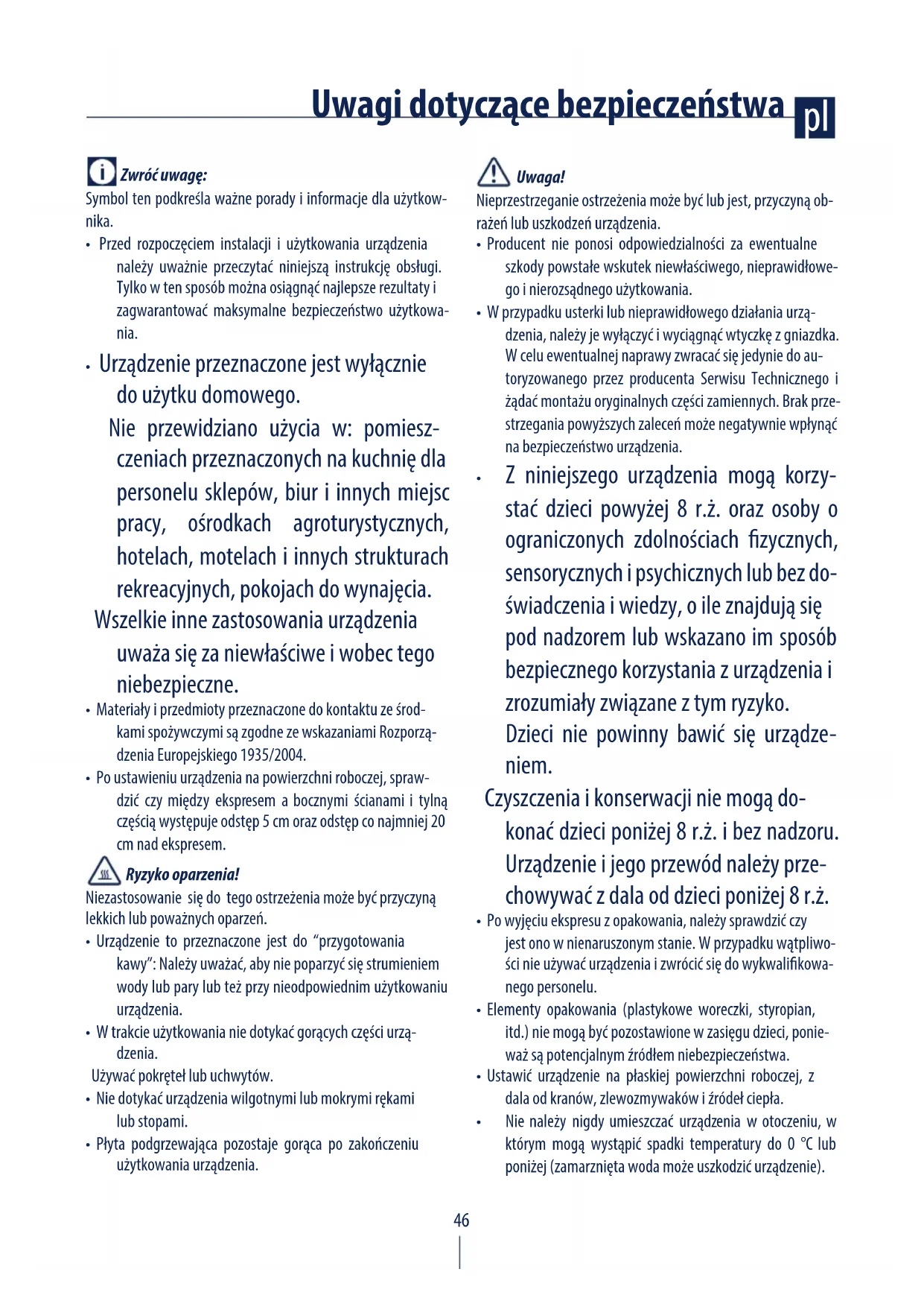 - Urządzenie to przeznaczone jest do “przygotowania kawy”: Należy uważać, aby nie poparzyć się strumieniem wody lub pary lub też przy nieodpowiednim użytkowaniu urządzenia.