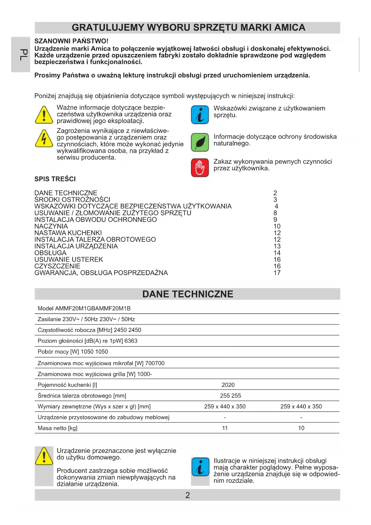 Ilustracje w niniejszej instrukcji obsługi mają charakter poglądowy. Pełne wyposa- żenie urządzenia znajduje się w odpowied- nim rozdziale. Model AMMF20M1GB AMMF20M1BZasilanie 230V~ / 50Hz 230V~ / 50HzCzęstotliwość robocza [MHz] 2450 2450Poziom głośności [dB(A) re 1pW] 63 63Pobór mocy [W] 1050 1050Znamionowa moc wyjściowa mikrofal [W] 700 700Znamionowa moc wyjściowa grilla [W] 1000 -Pojemność kuchenki [l] 20 20Średnica talerza obrotowego [mm] 255 255 Wymiary zewnętrzne (Wys x szer x gł) [mm] 259 x 440 x 350 259 x 440 x 350 Urządzenie przystosowane do zabudowy meblowej - - Masa netto [kg] 11 10 DANE TECHNICZNE SPISTREŚCI DANE TECHNICZNE 2