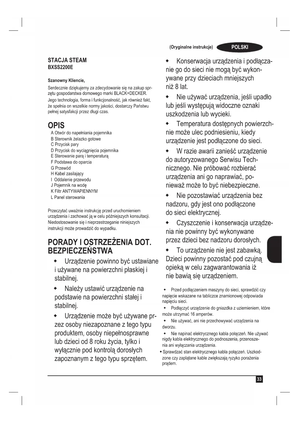 STACJA STEAM BXSS2200E Szanowny Kliencie, Serdecznie dziękujemy za zdecydowanie się na zakup spr- zętu gospodarstwa domowego marki BLACK+DECKER. Jego technologia, forma i funkcjonalność, jak również fakt, że spełnia on wszelkie normy jakości, dostarczy Państwu pełnej satysfakcji przez długi czas. OPIS A Otwór do napełniania pojemnika B Sterownik żelazko gotowe C Przycisk pary D Przycisk do wyciągnięcia pojemnika E Sterowanie parą i temperaturą F Podstawa do oparcia G Przewód H Kabel zasilający I Oddalenie przewodu J Pojemnik na wodę K Filtr ANTYWAPIENNYM L Panel sterowania Przeczytać uważnie instrukcję przed uruchomieniem urządzenia i zachować ją w celu późniejszych konsultacji. Niedostosowanie się i nieprzestrzeganie niniejszych instrukcji może prowadzić do wypadku. PORADY I OSTRZEŻENIA DOT. BEZPIECZEŃSTWA Urządzenie powinno być ustawiane i używane na powierzchni płaskiej i stabilnej. Należy ustawić urządzenie na podstawie na powierzchni stałej i stabilnej. Urządzenie może być używane pr- zez osoby niezapoznane z tego typu produktem, osoby niepełnosprawne lub dzieci od 8 roku życia, tylko i wyłącznie pod kontrolą dorosłych zapoznanym z tego typu sprzętem. Konserwacja urządzenia i podłącza- nie go do sieci nie mogą być wykon- ywane przy dzieciach mniejszych niż 8 lat. Nie używać urządzenia, jeśli upadło lub jeśli występują widoczne oznaki uszkodzenia lub wycieki. Temperatura dostępnych powierzch- nie może ulec podniesieniu, kiedy urządzenie jest podłączone do sieci. W razie awarii zanieść urządzenie do autoryzowanego Serwisu Tech- nicznego. Nie próbować rozbierać urządzenia ani go naprawiać, po- nieważ może to być niebezpieczne. Nie pozostawiać urządzenia bez nadzoru, gdy jest ono podłączone do sieci elektrycznej. Czyszczenie i konserwacja urządze- nia nie powinny być wykonywane przez dzieci bez nadzoru dorosłych. To urządzenie nie jest zabawką. Dzieci powinny pozostać pod czujną opieką w celu zagwarantowania iż nie bawią się urządzeniem. Przed podłączeniem maszyny do sieci, sprawdzić czy napięcie wskazane na tabliczce znamionowej odpowiada napięciu sieci. Podłączyć urządzenie do gniazdka z uziemieniem, które może utrzymać 16 amperów. Nie używać, ani nie przechowywać urządzenia na dworzu. Nie napinać elektrycznego kabla połączeń. Nie używać nigdy kabla elektrycznego do podnoszenia, przenosze- nia ani wyłączania urządzenia. Sprawdzać stan elektrycznego kabla połączeń. Uszkod- zone czy zaplątane kable zwiększają ryzyko porażenia prądem.POLSKI (Oryginalne instrukcje)