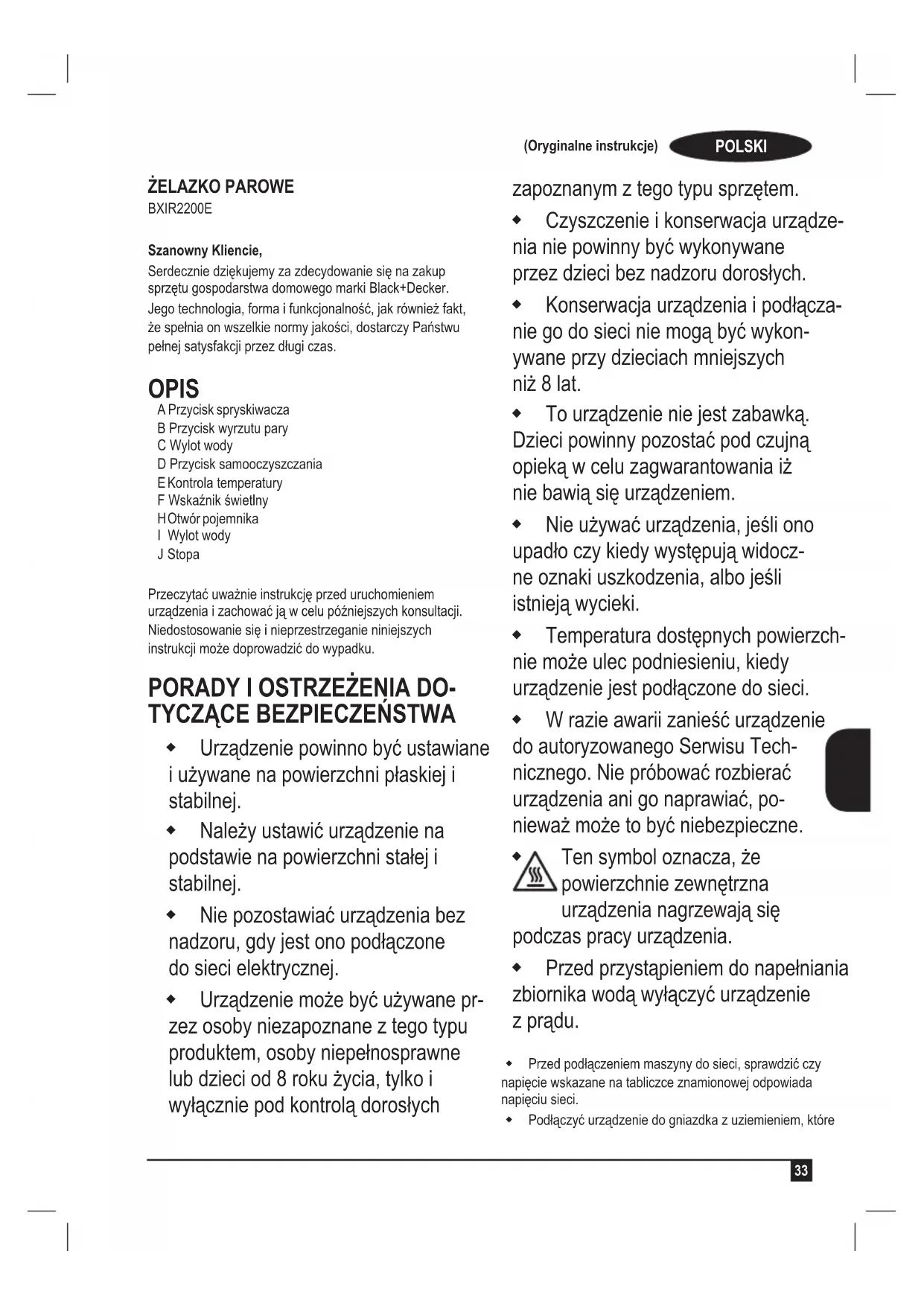 ŻELAZKO PAROWE BXIR2200E Szanowny Kliencie, Serdeczniedziękujemyzazdecydowaniesięnazakup sprzętugospodarstwadomowegomarkiBlack+Decker. Jegotechnologia,formaifunkcjonalność,jakrównieżfakt, żespełniaonwszelkienormyjakości,dostarczyPaństwu pełnejsatysfakcjiprzezdługiczas. OPIS A Przycisk spryskiwacza B Przycisk wyrzutu pary C Wylot wody D Przycisk samooczyszczania E Kontrola temperatury FWskaźnikświetlny H Otwór pojemnika I Wylot wody J Stopa Przeczytaćuważnieinstrukcjęprzeduruchomieniem urządzeniaizachowaćjąwcelupóźniejszychkonsultacji. Niedostosowaniesięinieprzestrzeganieniniejszych instrukcjimożedoprowadzićdowypadku.