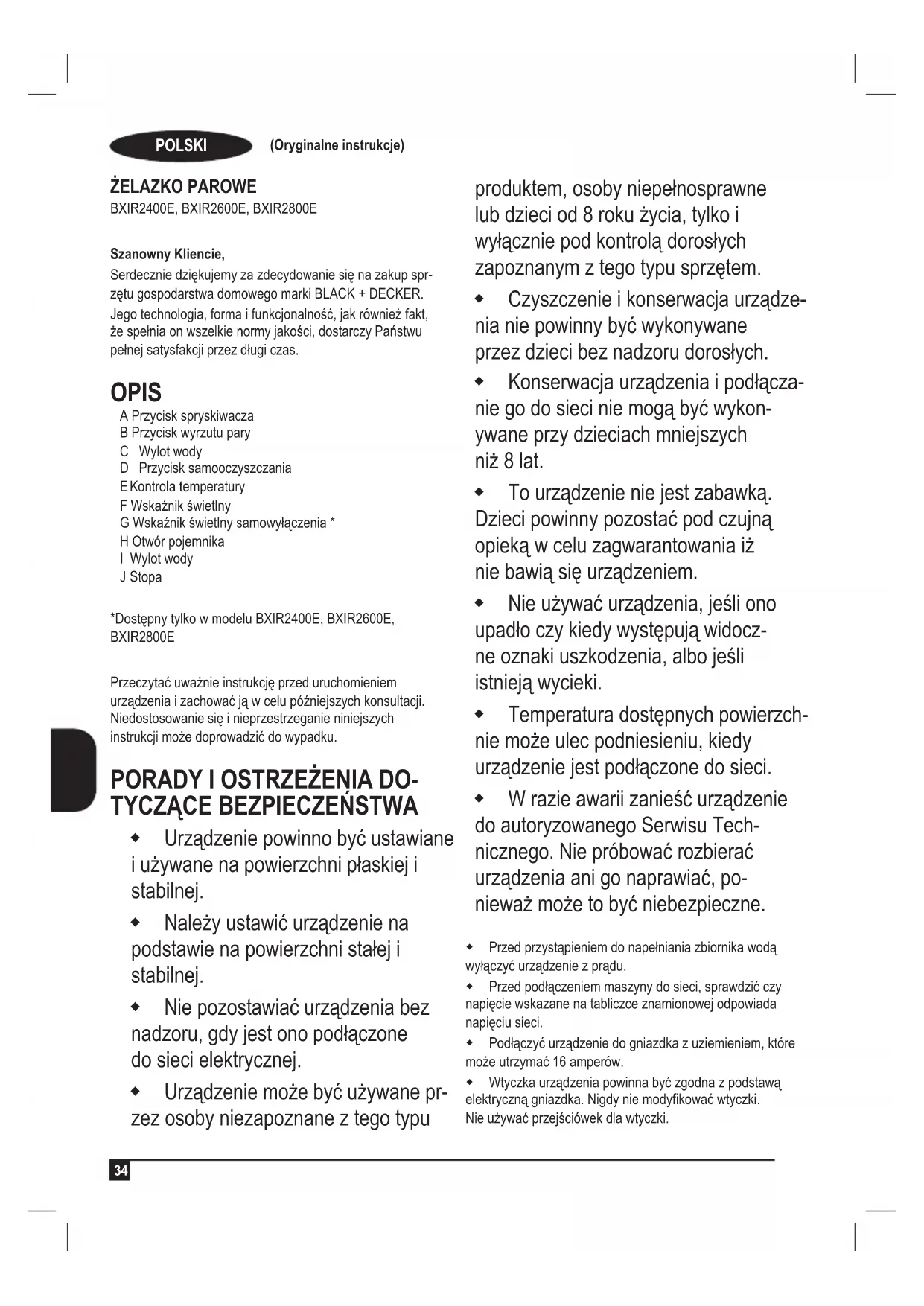 Szanowny Kliencie, Serdecznie dziękujemy za zdecydowanie się na zakup spr- zętu gospodarstwa domowego marki BLACK + DECKER. Jego technologia, forma i funkcjonalność, jak również fakt, że spełnia on wszelkie normy jakości, dostarczy Państwu pełnej satysfakcji przez długi czas. OPIS A Przycisk spryskiwacza B Przycisk wyrzutu pary C Wylot wody D Przycisk samooczyszczania E Kontrola temperatury F Wskaźnik świetlny G Wskaźnik świetlny samowyłączenia * H Otwór pojemnika I Wylot wody J Stopa *Dostępny tylko w modelu BXIR2400E, BXIR2600E, BXIR2800E Przeczytać uważnie instrukcję przed uruchomieniem urządzenia i zachować ją w celu późniejszych konsultacji. Niedostosowanie się i nieprzestrzeganie niniejszych instrukcji może doprowadzić do wypadku.