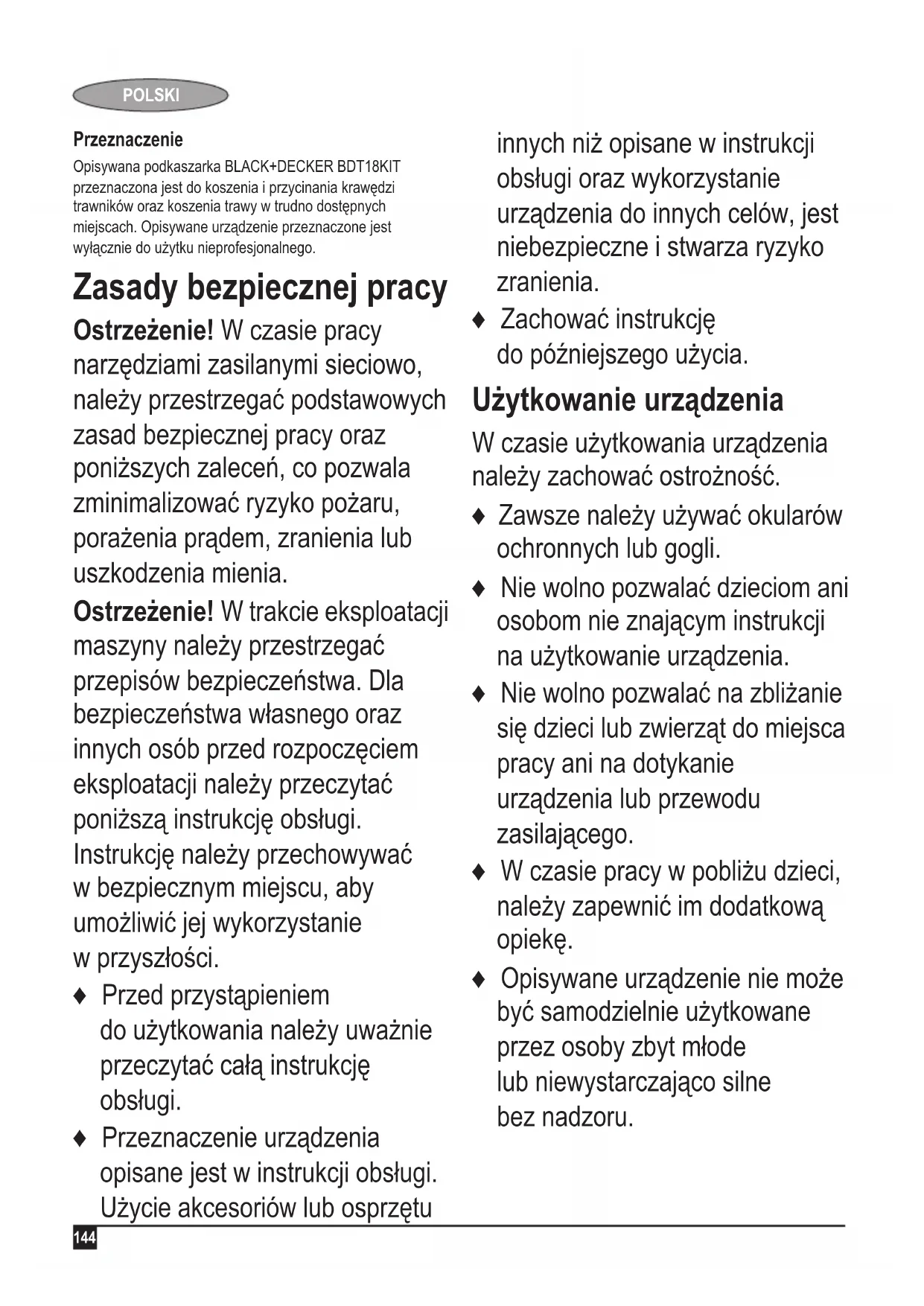 (garantált hangteljesítmény) 92 dB(A) Ezek a termékek a 2014/30/EU és a 2011/65/EU irányelveknek is megfelelnek. További tájékoztatásért forduljon a Black & Decker vállalathoz a következőkben megadott vagy a kézikönyv végén megtalálható elérhetőségeken. Az aláírás tulajdonosa a műszaki adatok összeállításáért felelős személy; nyilatkozatát a Вlack & Decker vállalat nevében adja. R. Laverick Műszaki igazgató Вlack & Decker Europe, 210 Bath Road, Slough, Berkshire, SL1 3YD Egyesült Királyság 2016/12/06 Ne felejtse el termékét regisztrálni! www.blackanddecker.co.uk/productregistration Regisztrálja termékét online, a www.blackanddecker.co.uk/ productregistration honlapon, vagy küldje el a teljes nevét és a termék kódját országának BLACK+DECKER képviseletéhez. Az Önhöz legközelebb eső hivatalos márkaszervizt a kézikönyvben megadott helyi Black & Decker képviselet segítségével érheti el. Alternatív megoldásként a szerződött Black & Decker szervizek listája, illetve az eladás utáni szolgáltatásaink és ezek elérhetőségének részletes ismertetése a következő internetes címen érhető el: www.2helpU.com Kérjük, látogassa meg a www.blackanddecker.hu weboldalunkat, hogy regisztrálja az új BLACK+DECKER termékét, ill. hogy megismerje az új termékeinkkel és egyedi ajánlatainkkal kapcsolatos legújabb híreinket. A BLACK+DECKER márkával és termékválasztékunkkal kapcsolatos további tájékoztatást a www.blackanddecker.hu internetes címen találhat.144 POLSKI Przeznaczenie Opisywana podkaszarka BLACK+DECKER BDT18KIT przeznaczona jest do koszenia i przycinania krawędzi trawników oraz koszenia trawy w trudno dostępnych miejscach. Opisywane urządzenie przeznaczone jest wyłącznie do użytku nieprofesjonalnego. Zasady bezpiecznej pracy Ostrzeżenie! W czasie pracy narzędziami zasilanymi sieciowo, należy przestrzegać podstawowych zasad bezpiecznej pracy oraz poniższych zaleceń, co pozwala zminimalizować ryzyko pożaru, porażenia prądem, zranienia lub uszkodzenia mienia. Ostrzeżenie! W trakcie eksploatacji maszyny należy przestrzegać przepisów bezpieczeństwa. Dla bezpieczeństwa własnego oraz innych osób przed rozpoczęciem eksploatacji należy przeczytać poniższą instrukcję obsługi. Instrukcję należy przechowywać w bezpiecznym miejscu, aby umożliwić jej wykorzystanie w przyszłości. ♦ Przed przystąpieniem do użytkowania należy uważnie przeczytać całą instrukcję obsługi. ♦ Przeznaczenie urządzenia opisane jest w instrukcji obsługi. Użycie akcesoriów lub osprzętu innych niż opisane w instrukcji obsługi oraz wykorzystanie urządzenia do innych celów, jest niebezpieczne i stwarza ryzyko zranienia. ♦ Zachować instrukcję do późniejszego użycia. Użytkowanie urządzenia W czasie użytkowania urządzenia należy zachować ostrożność. ♦ Zawsze należy używać okularów ochronnych lub gogli. ♦ Nie wolno pozwalać dzieciom ani osobom nie znającym instrukcji na użytkowanie urządzenia. ♦ Nie wolno pozwalać na zbliżanie się dzieci lub zwierząt do miejsca pracy ani na dotykanie urządzenia lub przewodu zasilającego. ♦ W czasie pracy w pobliżu dzieci, należy zapewnić im dodatkową opiekę. ♦ Opisywane urządzenie nie może być samodzielnie użytkowane przez osoby zbyt młode lub niewystarczająco silne bez nadzoru.145 POLSKI ♦ Opisywane urządzenie nie jest zabawką i nie może być w ten sposób wykorzystywane. ♦ Należy pracować przy świetle dziennym lub mocnym oświetleniu sztucznym. ♦ Używać wyłącznie w suchym otoczeniu. Nie dopuszczać do zamoczenia urządzenia. ♦ Nie wolno zanurzać urządzenia w wodzie. ♦ Nie wolno otwierać obudowy. Wewnątrz nie ma żadnych elementów, które wymagają konserwacji przez użytkownika. ♦ Nie używać urządzenia w strefach zagrożonych wybuchem, na przykład w pobliżu palnych cieczy, gazów lub pyłów. ♦ Aby uniknąć uszkodzenia wtyczki lub przewodu, nigdy nie wolno ciągnąć za przewód zasilający, aby wyjąć wtyczkę z kontaktu. Bezpieczeństwo osób postronnych ♦ Opisywane urządzenie nie jest przeznaczone do użycia przez osoby o obniżonych możliwościach fizycznych, ruchowych lub umysłowych (także dzieci) lub o zbyt małej wiedzy i doświadczeniu, jeśli nie zostały one przeszkolone lub nie pozostają pod opieką osoby odpowiedzialnej za ich bezpieczeństwo. ♦ Należy pilnować dzieci, aby nie bawiły się urządzeniem. Pozostałe zagrożenia. W czasie pracy narzędziem mogą powstać zagrożenia, które nie zostały uwzględnione w załączonej instrukcji dotyczącej bezpiecznego użytkowania. Zagrożenia te mogą wynikać z niewłaściwego użytkowania, zbyt intensywnej eksploatacji lub innych przyczyn. Nawet w przypadku przestrzegania zasad bezpiecznej pracy i stosowania środków ochronnych, nie jest możliwe uniknięcie pewnych zagrożeń. Należą do nich: ♦ Zranienia wynikające z dotknięcia wirujących/ ruchomych elementów. ♦ Zranienia w czasie wymiany części, ostrzy lub akcesoriów.146 POLSKI ♦ Zranienia związane ze zbyt długotrwałym używaniem narzędzia. Pracując przez dłuższy czas jakimkolwiek narzędziem, należy robić regularne przerwy. ♦ Uszkodzenie narządu słuchu. ♦ Zagrożenie dla zdrowia spowodowane wdychaniem pyłu wytwarzanego podczas użytkowania urządzenia (np. podczas pracy w drewnie, szczególnie dębowym, bukowym oraz MDF). Po użyciu ♦ Nie używane urządzenie należy przechowywać w suchym, dobrze wentylowanym miejscu, poza zasięgiem dzieci. ♦ Dzieci nie mogą mieć dostępu do urządzenia. ♦ W czasie przewożenia lub przechowywania urządzenia w samochodzie, umieścić je w bagażniku lub przymocować tak, aby nie miało możliwości przesunięcia się w czasie gwałtownych zmian prędkości lub kierunku. Przeglądy i naprawy ♦ Przed użyciem sprawdzić, czy nie występują uszkodzenia lub wad