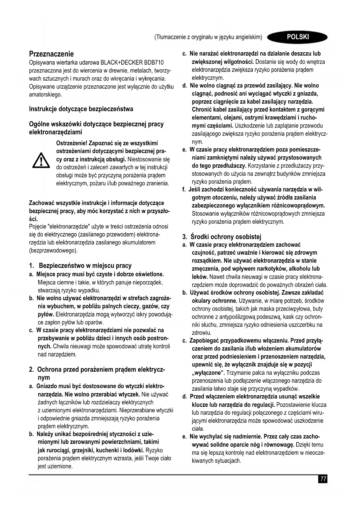a. W czasie pracy elektronarzędziem zachować czujność, patrzeć uważnie i kierować się zdrowym rozsądkiem. Nie używać elektronarzędzia w stanie zmęczenia, pod wpływem narkotyków, alkoholu lub leków. Nawet chwila nieuwagi w czasie pracy elektrona- rzędziem może doprowadzić do poważnych obrażeń ciała. b. Używać środków ochrony osobistej. Zawsze zakładać okulary ochronne. Używanie, w miarę potrzeb, środków ochrony osobistej, takich jak maska przeciwpyłowa, buty ochronne z antypoślizgową podeszwą, kask czy ochron- niki słuchu, zmniejsza ryzyko odniesienia uszczerbku na zdrowiu. c. Zapobiegać przypadkowemu włączeniu. Przed przyłą- czeniem do zasilania i/lub włożeniem akumulatorów oraz przed podniesieniem i przenoszeniem narzędzia, upewnić się, że wyłącznik znajduje się w pozycji „wyłączone”. Trzymanie palca na wyłączniku podczas przenoszenia lub podłączenie włączonego narzędzia do zasilania łatwo staje się przyczyną wypadków. d. Przed włączeniem elektronarzędzia usunąć wszelkie klucze lub narzędzia do regulacji. Pozostawienie klucza lub narzędzia do regulacji połączonego z częściami wiru- jącymi elektronarzędzia może spowodować uszkodzenie ciała. e. Nie wychylać się nadmiernie. Przez cały czas zacho- wywać solidne oparcie nóg i równowagę. Dzięki temu ma się lepszą kontrolę nad elektronarzędziem w nieocze- kiwanych sytuacjach. Przeznaczenie Opisywana wiertarka udarowa BLACK+DECKER BDB710 przeznaczona jest do wiercenia w drewnie, metalach, tworzy- wach sztucznych i murach oraz do wkręcania i wykręcania. Opisywane urządzenie przeznaczone jest wyłącznie do użytku amatorskiego. Instrukcje dotyczące bezpieczeństwa Ogólne wskazówki dotyczące bezpiecznej pracy elektronarzędziami