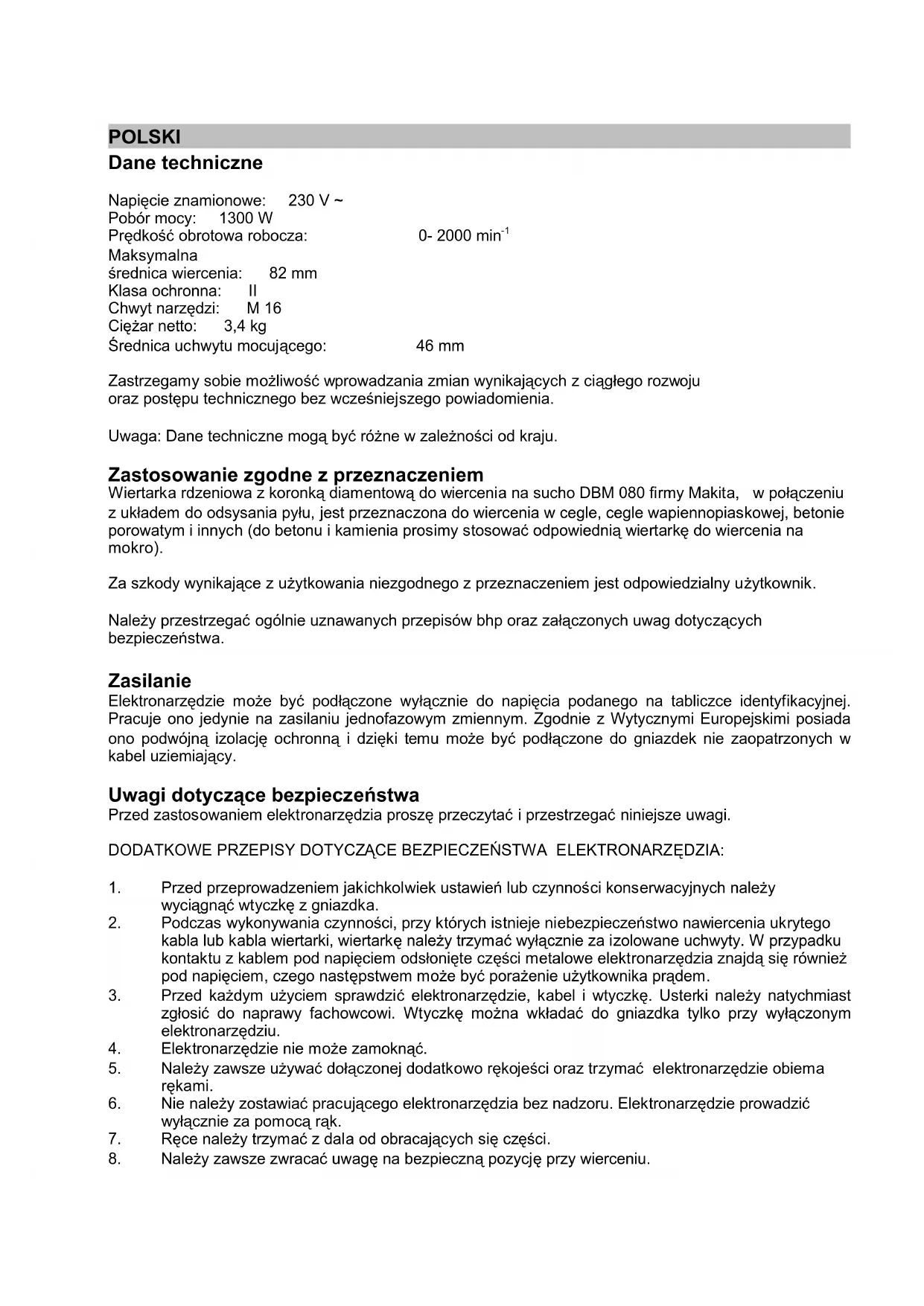 Maksymalna średnica wiercenia: 82 mm Klasa ochronna: II Chwyt narzędzi: M 16 Ciężar netto: 3,4 kg Średnica uchwytu mocującego: 46 mm Zastrzegamy sobie możliwość wprowadzania zmian wynikających z ciągłego rozwoju oraz postępu technicznego bez wcześniejszego powiadomienia. Uwaga: Dane techniczne mogą być różne w zależności od kraju. Zastosowanie zgodne z przeznaczeniem Wiertarka rdzeniowa z koronką diamentową do wiercenia na sucho DBM 080 firmy Makita, w połączeniu z układem do odsysania pyłu, jest przeznaczona do wiercenia w cegle, cegle wapiennopiaskowej, betonie porowatym i innych (do betonu i kamienia prosimy stosować odpowiednią wiertarkę do wiercenia na mokro). Za szkody wynikające z użytkowania niezgodnego z przeznaczeniem jest odpowiedzialny użytkownik. Należy przestrzegać ogólnie uznawanych przepisów bhp oraz załączonych uwag dotyczących bezpieczeństwa. Zasilanie Elektronarzędzie może być podłączone wyłącznie do napięcia podanego na tabliczce identyfikacyjnej. Pracuje ono jedynie na zasilaniu jednofazowym zmiennym. Zgodnie z Wytycznymi Europejskimi posiada ono podwójną izolację ochronną i dzięki temu może być podłączone do gniazdek nie zaopatrzonych w kabel uziemiający. Uwagi dotyczące bezpieczeństwa Przed zastosowaniem elektronarzędzia proszę przeczytać i przestrzegać niniejsze uwagi. DODATKOWE PRZEPISY DOTYCZĄCE BEZPIECZEŃSTWA ELEKTRONARZĘDZIA: