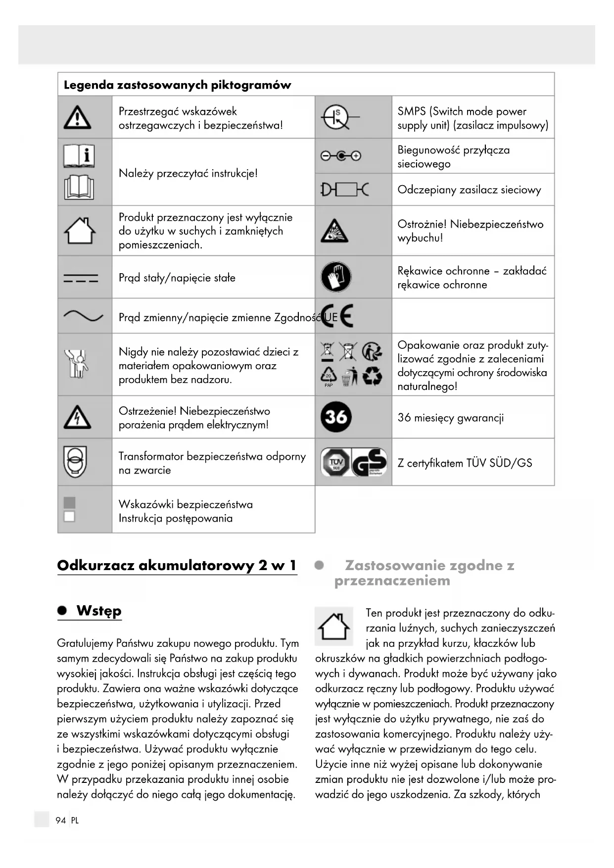 PAP Opakowanie oraz produkt zuty- lizować zgodnie z zaleceniami dotyczącymi ochrony środowiska naturalnego! Ostrzeżenie! Niebezpieczeństwo porażenia prądem elektrycznym! 36 miesięcy gwarancji Transformator bezpieczeństwa odporny na zwarcie Z certyfikatem TÜV SÜD/GS Wskazówki bezpieczeństwa Instrukcja postępowania Odkurzacz akumulatorowy 2 w 1 Wstęp Gratulujemy Państwu zakupu nowego produktu. Tym samym zdecydowali się Państwo na zakup produktu wysokiej jakości. Instrukcja obsługi jest częścią tego produktu. Zawiera ona ważne wskazówki dotyczące bezpieczeństwa, użytkowania iutylizacji. Przed pierwszym użyciem produktu należy zapoznać się ze wszystkimi wskazówkami dotyczącymi obsługi ibezpieczeństwa. Używać produktu wyłącznie zgodnie zjego poniżej opisanym przeznaczeniem. Wprzypadku przekazania produktu innej osobie należy dołączyć do niego całą jego dokumentację. Zastosowanie zgodne z przeznaczeniem Ten produkt jest przeznaczony do odku- rzania luźnych, suchych zanieczyszczeń jak na przykład kurzu, kłaczków lub okruszków na gładkich powierzchniach podłogo- wych i dywanach. Produkt może być używany jako odkurzacz ręczny lub podłogowy. Produktu używać wyłącznie w pomieszczeniach. Produkt przeznaczony jest wyłącznie do użytku prywatnego, nie zaś do zastosowania komercyjnego. Produktu należy uży- wać wyłącznie w przewidzianym do tego celu. Użycie inne niż wyżej opisane lub dokonywanie zmian produktu nie jest dozwolone i/lub może pro- wadzić do jego uszkodzenia. Za szkody, których95 PL przyczyną jest użytkowanie sprzeczne z przezna- czeniem, producent nie przejmuje żadnej odpowie- dzialności. Opis części