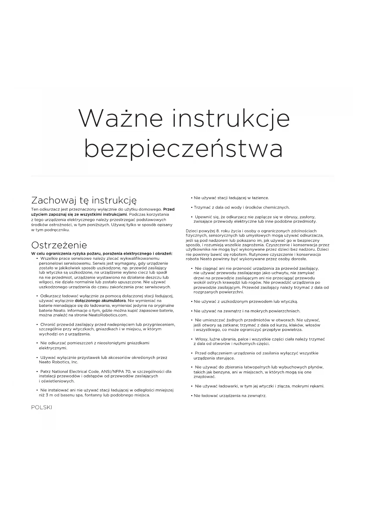 - Upewnić się, że odkurzacz nie zaplącze się w obrusy, zasłony, zwisające przewody elektryczne lub inne podobne przedmioty. Dzieci powyżej 8. roku życia i osoby o ograniczonych zdolnościach fizycznych, sensorycznych lub umysłowych mogą używać odkurzacza, jeśli są pod nadzorem lub pokazano im, jak używać go w bezpieczny sposób, i rozumieją wszelkie zagrożenia. Czyszczenie i konserwacja przez użytkownika nie mogą być wykonywane przez dzieci bez nadzoru. Dzieci nie powinny bawić się robotem. Rutynowe czyszczenie i konserwacja robota Neato powinny być wykonywane przez osoby dorosłe.