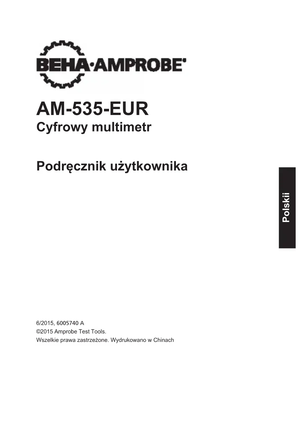 Cyfrowy multimetr Podręcznik użytkownika 6/2015, 6005740 A ©2015 Amprobe Test Tools. Wszelkie prawa zastrzeżone. Wydrukowano w Chinach PolskiiOgraniczona gwarancja i ograniczenie odpowiedzialności Posiadany produkt Amprobe będzie wolny od wad materiałowych i defektów wytwarzania w ciągu jednego roku od daty zakupienia, chyba że, okres ten zostanie zmieniony przez lokalne prawo. Ta gwarancja nie obejmuje bezpieczników, usuwalnych baterii lub uszkodzeń spowodowanych wypadkiem, zaniedbaniem, nieprawidłowym używaniem, zmianami, zanieczyszczeniem lub nienormalnymi warunkami działania albo obsługi. Sprzedawcy nie są upoważnieni do przedłużania wszelkich innych gwarancji w imieniu Amprobe. Aby uzyskać usługę w okresie gwarancji należy zwrócić produkt z dowodem zakupienia do autoryzowanego punktu serwisowego Amprobe lub do dostawcy albo dystrybutora Amprobe. Szczegółowe informacje znajdują się w części Naprawa. TA GWARANCJA TO JEDYNE ZADOŚĆUCZYNIENIE UŻYTKOWNIKA. WSZELKIE INNE GWARANCJE - WYRAŻONE, DOROZUMIANE ALBO USTAWOWE - WŁĄCZNIE Z DOROZUMIANYMI GWARANCJAMI DOPASOWANIA DO OKREŚLONEGO CELU ALBU PRZYDATNOŚCI HANDLOWEJ, SĄ NINIEJSZYM ODRZUCANE. PRODUCENT NIE ODPOWIADA ZA WSZELKIE SPECJALNE, NIEBEZPOŚREDNIE, PRZYPADKOWE ALBO WYNIKOWE SZKODY LUB STRATY, POWSTAŁE Z JAKIEJKOLWIEK PRZYCZYNY LUB LUB ZASTOSOWANYCH TEORII. Ponieważ w niektórych stanach lub krajach nie zezwala się na wyłączenia albo ograniczenia dorozumianej gwarancji albo przypadkowych lub wynikowych szkód, to ograniczenie odpowiedzialności może nie dotyczyć użytkownika. Naprawa Wszelkie narzędzia testowe zwrócone do naprawy gwarancyjnej lub naprawy niegwarancyjnej albo do kalibracji, powinny być zaopatrzone w:nazwę użytkownika, nazwę rmy, adres, numer telefoniczny i dowód zakupienia. Dodatkowo należy dołączyć krótki opis problemu lub wymaganej naprawy i testy wykonane miernikiem. Opłaty za naprawy niegwarancyjne lub wymiany powinny być wykonywane czekiem, przekazem pieniężnym, kartą kredytową z datą ważności lub zleceniem wykonania płatnym dla Amprobe. Naprawy i wymiany gwarancyjne - Wszystkie kraje Przed zażądaniem naprawy należy przeczytać oświadczenie dotyczące gwarancji i sprawdzić baterię. W okresie obowiązywania gwarancji, wszelkie uszkodzone narzędzia testowe można zwracać do dystrybutora Amprobe w celu ich wymiany na taki sam lub podobny produkt. Listę najbliższych dystrybutorów można sprawdzić w części “Where to Buy (Gdzie kupić)”, pod adresem www.Amprobe.com. Dodatkowo, w Stanach Zjednoczonych i w Kanadzie, urządzenia do naprawy i wymiany gwarancyjnej, można także wysyłać do Centrum serwisowego Amprobe (sprawdź adres poniżej). Naprawa i wymiana niegwarancyjna - Stanych Zjednoczone i Kanada Urządzenia do naprawy i wymiany niegwarancyjnej w Stanach Zjednoczonych i Kanadzie, powinny być wysyłane do Centrum serwisowego Amprobe. Informacje o cenach bieżących napraw i wymian można uzyskać telefonicznie w Amprobe lub w punkcie zakupu. USA: Kanadzie: Amprobe Amprobe Everett, WA 98203 Mississauga, ON L4Z 1X9 Tel.: 877-AMPROBE (267-7623) Tel.: 905-890-7600 Naprawy i wymiany niegwarancyjne - Europa Urządzenia nie objęte gwarancją w krajach europejskich, można wymienić u dystrybutora Amprobe za nominalną opłatą. Listę najbliższych dystrybutorów można sprawdzić w części “Where to Buy (Gdzie kupić)”, pod adresem www.Beha-Amprobe.com. Amprobe® Europe* Beha-Amprobe In den Engematten 14 79286 Glottertal, Niemcy Tel.: +49 (0) 7684 8009 - 0 www.Beha-Amprobe.com *(Tylko korespondencja - pod tym adresem nie są wykonywane żadne naprawy lub wymiany. Klienci z krajów europejskich powinni się kontaktować ze swoim dystrybutorem)Cyfrowy multimetr AM-535-EUR