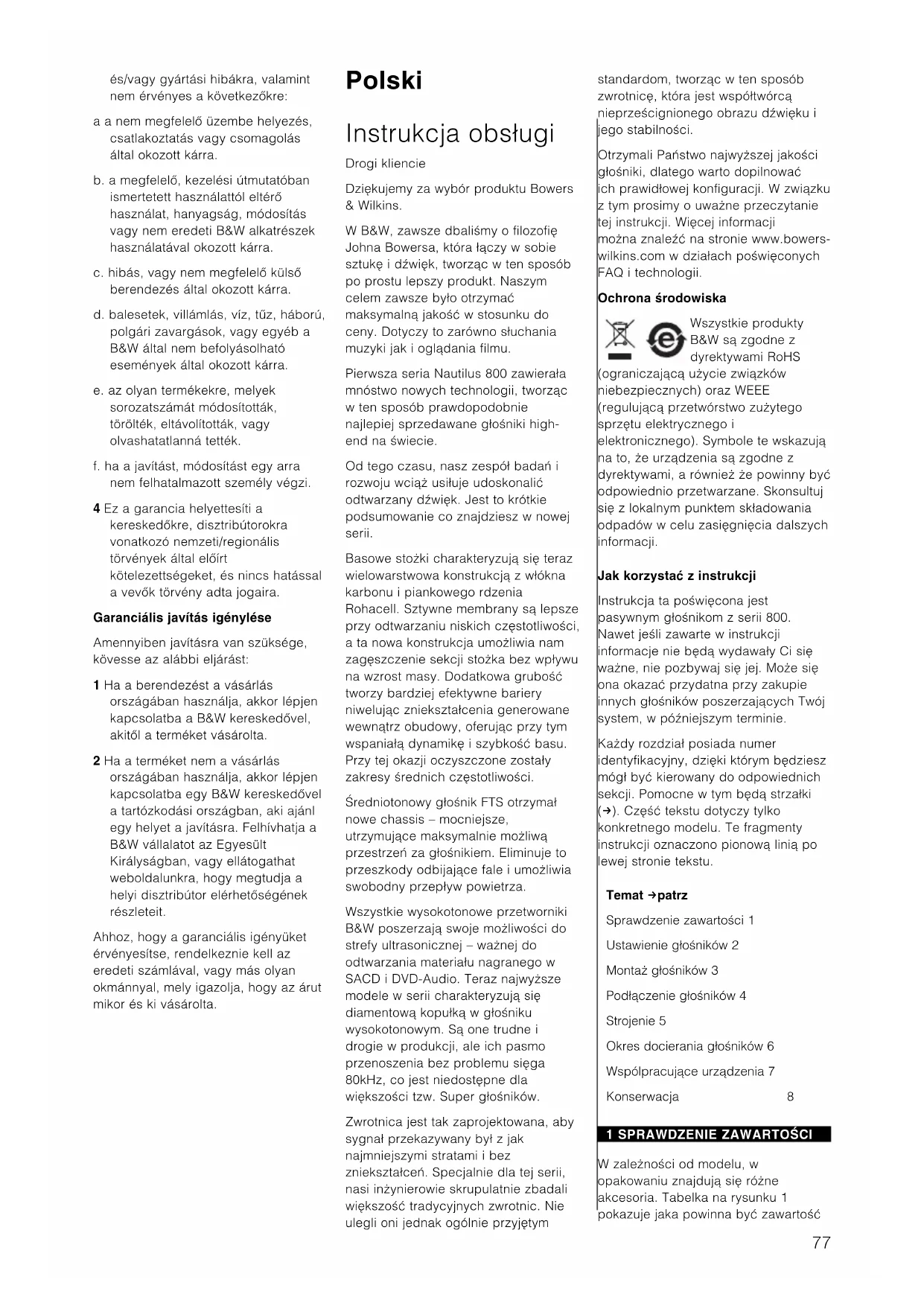 - redniotonowych i obudów g¡o·ników wysokotonowych dobrze jest konserwowaπ antystatycznym ·rodkiem czyszczƒcym. Unikaπ dotykania membran, a w szczególno·ci g¡o·nika wysokotonowego, gdyà moÃe to spowodowaπ uszkodzenie. Majƒc na uwadze delikatno·π kopu¡ek wysokotonowych, zdecydowanie zalecamy pozostawienie maskownic g¡o·ników wysokotonowych na ich miejscach. Gwarancja Ten produkt zosta¡ zaprojektowany i wyprodukowany zgodnie z najwyÃszymi standardami jako·ci. Jednak, je·li zdarzy si∆ jaka· awaria, firma B&W Group Ltd. oraz jej mi∆dzynarodowi dystrybutorzy gwarantujƒ bezp¡atny serwis (wyjƒtki mogƒ wystƒpiπ) na cz∆·ci i robocizn∆ w kaÃdym kraju, w którym jest autoryzowany dystrybutor B&W. Warunki gwarancji 1 Gwarancja odnosi si∆ tylko do naprawy sprz∆tu. Ani transport, ani Ãadne inne koszty, w¡ƒcznie z ryzykiem przenoszenia, transportu i instalacji produktów nie sƒ obj∆te tƒ gwarancjƒ. 2 Gwarancja jest waÃna tylko dla pierwszego w¡a·ciciela. Nie przechodzi na nast∆pnych w¡a·cicieli. 3 Gwarancja obejmuje tylko i wy¡ƒcznie wady materia¡owe lub inne wady ukryte w dniu zakupu. Gwarancja nie ma zastosowania w odniesieniu do: a uszkodze◊ spowodowanych niew¡a·ciwƒ instalacjƒ, pod¡ƒczeniem lub zapakowaniem produktu, b uszkodze◊ spowodowanych niew¡a·ciwƒ eksploatacjƒ, niezgodnƒ z instrukcjƒ obs¡ugi, modyfikacjami produktu lub wykorzystaniem cz∆·ci, które nie pochodzƒ od lub nie majƒ autoryzacji B&W, c uszkodze◊ spowodowanych przez popsute lub niew¡a·ciwe urzƒdzenia towarzyszƒce, d uszkodze◊ spowodowanych przez wypadki losowe, udary pioruna, wod∆, poÃar, czy inne czynniki, pozostajƒce poza kontrolƒ firmy B&W i jej autoryzowanych dystrybutorów, e produktów, których numer seryjny zosta¡ zamazany, usuni∆ty lub przerobiony, f oraz w przypadku gdy wykonano juà naprawy lub modyfikacje przez firmy lub osoby nieautoryzowane. 4 Ta gwarancja jest dope¡nieniem prawnych podstaw udzielania gwarancji, obowiƒzujƒcych na terenie danego kraju i nie narusza statutowych praw klienta. Jak reklamowaπ sprz∆t na gwarancji Je·li zaistnieje potrzeba oddania produktu de serwisu, prosimy zastosowaπ si∆ do nast∆pujƒcej procedury: 1 Je·li sprz∆t jest uÃywany w kraju zakupu, powiniene· skontaktowaπ si∆ z autoryzowanym dealerem, u którego sprz∆t zosta¡ zakupiony. 2 Je·li sprz∆t jest uÃywany poza granicami kraju, powiniene· si∆ skontaktowaπ z dystrybutorem B&W w¡a·ciwym dla miejsca zamieszkania w celu uzyskania informacji, gdzie sprz∆t moÃe byπ serwisowany. MoÃesz zadzwoniπ do B&W w Wielkiej Brytanii lub odwiedziπ naszƒ witryn∆ internetowƒ aby uzyskaπ kontakt do lokalnego dystrybutora. Aby uczyniπ waÃnym Ãdanie gwarancyjne, naleÃy dostarczyπ oryginalnƒ faktur∆ sprzedaÃy lub inny dowód w¡asno·ci, zawierajƒcy dat∆ zakupu. "esky Uãivatelsk≥ manuál Mil≥ zákazníku D>kujeme, ãe jste si vybrali reprosoustavy zna#ky Bowers & Wilkins. U firmy jsme se vãdy _ídili filozofií Johna Bowerse, ve které se snoubí um>ní a v>da, design a zvuk. V|e je vedené snahou vytvo_it co nejlep|í produkt, kter≥ vás uspokojí jak p_i poslechu hudby, tak p_i sledování domácího kina. ]ada reprosoustav Nautilus 800 byla vãdy plná nejmodern>j|í technologie, coã z ní #inilo sv>tov> nejlépe prodávanou _adu reprosoustav v kategorii high-end. Ani p_es v≥|e _e#ené ná| team neusnul na vav_ínech a na|i v≥vojoví inãen≥_i se snaãili reprosoustavy této _ady nadále vylep|ovat. V následujících _ádkách se do#tete co je v této modernizované _ad> nového: Basová membrána je nyní tvo_ena sendvi#ovou konstrukcí z karbonov≥ch vláken vyztuãen≥ch p>nou Rohacell. Rigidní membrána je nejlep|í pro reprodukci basÅ a tato nová konstrukce dovoluje zpevnit membránu bez zvy|ování její hmotnosti. Toto extra zesílení membrány jí #iní efektivn> odolnou jakémukoli zbytkovému vln>ní vznikajícímu uvnit_ kabinetu, dává ohromující dynamiku a #asování basÅ s vedlej|ím efektem #ist|ích st_edÅ. FST st_edov≥ reproduktor dostal p_i zachování maximální otev_enosti prostoru za membránou nové siln>j|í |asi,coã minimalizuje neãádoucí odrazy a poskytuje membrán> volnost proud>ní vzduchu. Frekven#ní rozsah v|ech B&W vysokotónov≥ch reproduktorÅ byl vylep|en aã do nadakustick≥ch frekvencí – to je dÅleãité pro potenciál SACD a DVD-A nahrávek. Nyní mají top modely _ady v≥|kové reproduktory s diamantovou membránou. Je to sice velmi náro#né a drahé na v≥robu, dovoluje to v|ak reprodukci plného rozsahu do 80kHz s velmi hladk≥m prÅb>hem, coã #iní reproduktor lep|ím neã je mnoho jin≥ch superv≥|kov≥ch reproduktorÅ. Provedení vyhybky dodává signál reproduktorÅm s minimální degradací a minimálním p_ekr≥váním pásem. Pro tuto sérii na|i inãen≥_i pouãili mnoho nov≥ch pohledÅ na problematiku provedení filtrÅ. V≥sledkem je nevídan≥ prostor a stabilita reprodukce.85 Reprosoutavy _ady Nautilus jsou technologickou |pi#kou a proto se jist> vyplatí prostudovat si podrobn> tento manuál a cel≥ systém naladit co nejoptimáln>ji. Dal|í informace je moãné získat v sekcích FAQ a Technology na na|ich web stránkách www.bowers-wilkins.com. Informace k ãivotnímu prost_edí Produkty B&W jsou konstruovány tak, aby byly zcela v souladu s mezinárodními p_edpisy upravujícími pouãití nebezpe#n≥ch materiálÅ v elektrick≥ch a elektronick≥ch za_ízeních (RoHS) a aby umoã[ovaly ekologickou likvidaci opot_eben≥ch elektrick≥ch a elektronick≥ch za_ízení (WEEE). Symbol p_e|krtnuté popelnice zna#í soulad s na_ízeními na recyklovatelnost v≥robku #i moãnost jiného zpracování, poãadovaného p_íslu|n≥mi p_edpisy. V p_ípad> nejasností jak naloãit s v≥robky ur#en≥mi k likvidaci se prosím obrat’te na místn> p_íslu|n≥ orgán státní správy, nebo na va|eho pr