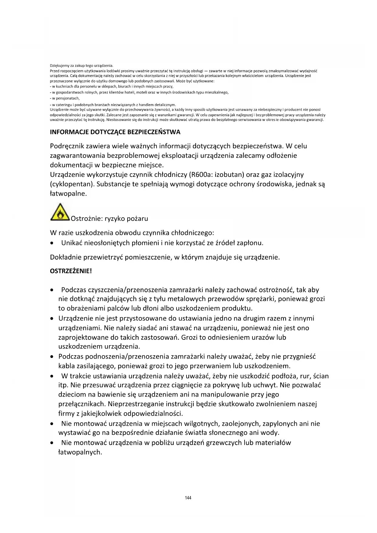 Podręcznik zawiera wiele ważnych informacji dotyczących bezpieczeństwa. W celu zagwarantowania bezproblemowej eksploatacji urządzenia zalecamy odłożenie dokumentacji w bezpieczne miejsce. Urządzenie wykorzystuje czynnik chłodniczy (R600a: izobutan) oraz gaz izolacyjny (cyklopentan). Substancje te spełniają wymogi dotyczące ochrony środowiska, jednak są łatwopalne. Ostrożnie: ryzyko pożaru W razie uszkodzenia obwodu czynnika chłodniczego: