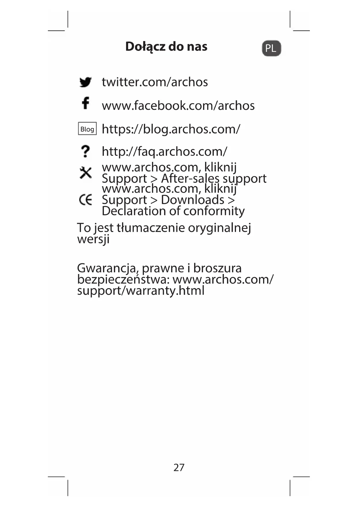 Dołącz do nas twitter.com/archos www.facebook.com/archos Blog https://blog.archos.com/ http://faq.archos.com/ www.archos.com, kliknij Support > After-sales support www.archos.com, kliknij Support > Downloads > Declaration of conformity To jest tłumaczenie oryginalnej wersji Gwarancja, prawne i broszura bezpieczeństwa: www.archos.com/ support/warranty.html28