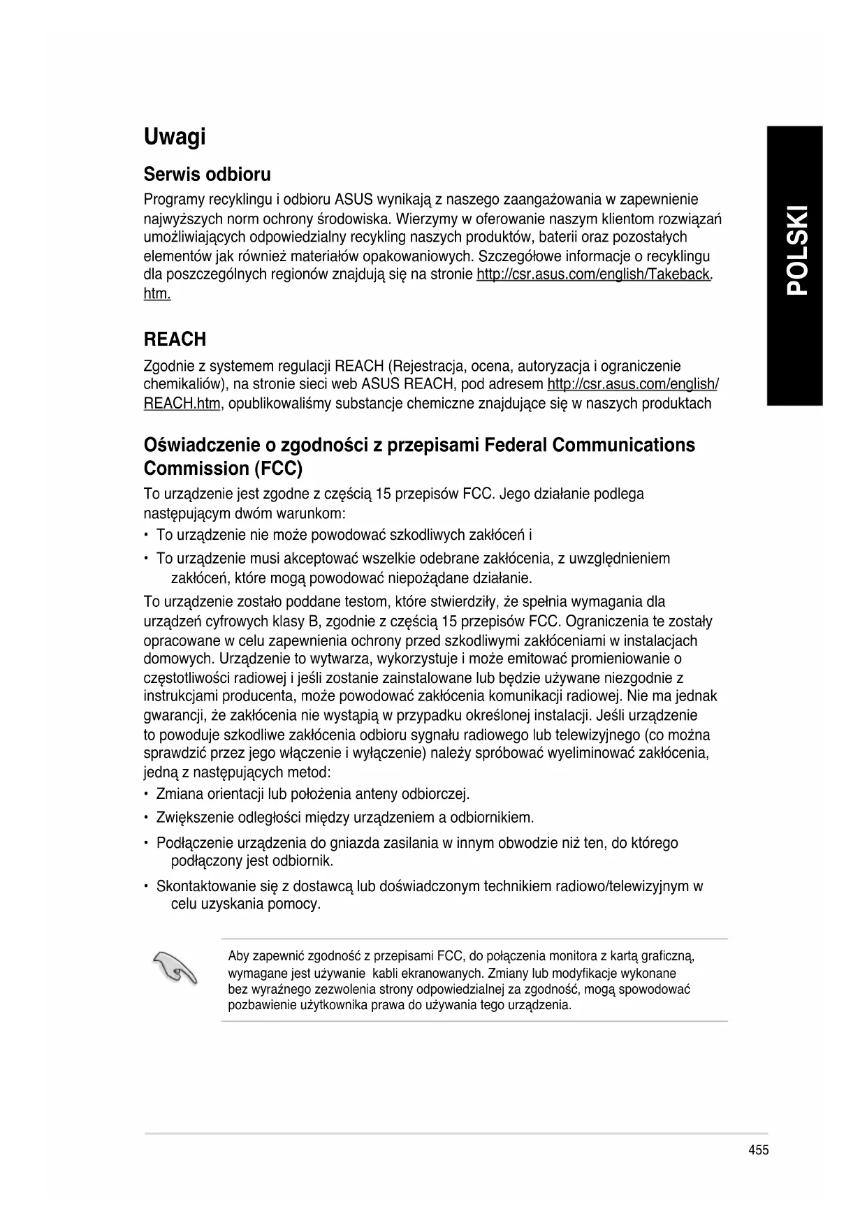 - Skontaktowanie się z dostawcą lub doświadczonym technikiem radiowo/telewizyjnym w celu uzyskania pomocy. Aby zapewnić zgodność z przepisami FCC, do połączenia monitora z kartą graczną, wymagane jest używanie kabli ekranowanych. Zmiany lub modykacje wykonane bez wyraźnego zezwolenia strony odpowiedzialnej za zgodność, mogą spowodować pozbawienie użytkownika prawa do używania tego urządzenia.456 POLSKI POLSKI POLSKI POLSKI
