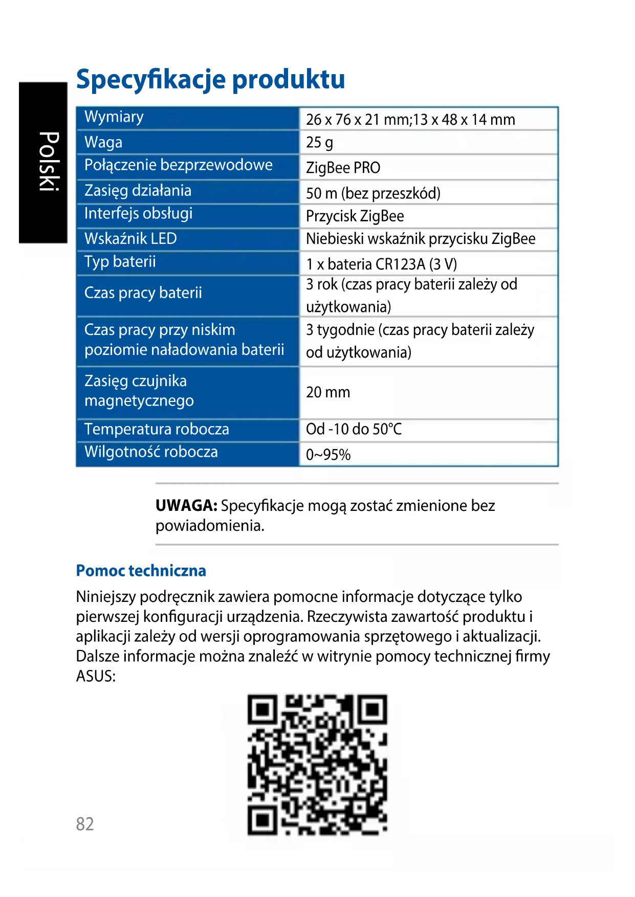 - Quando o dispositivo car sem energia, a aplicação complementar irá exibir um ícone cinzento e não pode ser congurado. O estado será atualizado a cada 5 minutos. 81Polski Specykacje produktu Wymiary 26 x 76 x 21 mm;13 x 48 x 14 mm Waga 25g Połączenie bezprzewodowe ZigBee PRO Zasięg działania 50 m (bez przeszkód) Interfejs obsługi Przycisk ZigBee Wskaźnik LED Niebieski wskaźnik przycisku ZigBee Typ baterii 1 x bateria CR123A (3V) Czas pracy baterii 3 rok (czas pracy baterii zależy od użytkowania) Czas pracy przy niskim poziomie naładowania baterii 3 tygodnie (czas pracy baterii zależy od użytkowania) Zasięg czujnika magnetycznego 20 mm Temperatura robocza Od -10 do 50°C Wilgotność robocza 0~95% UWAGA: Specykacje mogą zostać zmienione bez powiadomienia. Pomoc techniczna Niniejszy podręcznik zawiera pomocne informacje dotyczące tylko pierwszej konguracji urządzenia. Rzeczywista zawartość produktu i aplikacji zależy od wersji oprogramowania sprzętowego i aktualizacji. Dalsze informacje można znaleźć w witrynie pomocy technicznej rmy ASUS: 82Polski Omówienie elementów urządzenia Czujnik magnetyczny W celu uzyskania najwyższej wydajności należy wyrównać strzałki na czujnikach magnetycznych. Jeśli czujniki znajdą się w odległości większej niż 20mm od siebie, w aplikacji towarzyszącej wskazany zostanie stan otwarcia. Przycisk ZigBee Naciśnij, aby połączyć z bramą domową. Naciśnij i przytrzymaj przez 5 sekund, aby zresetować urządzenie. UWAGA: Aby usunąć całkowicie urządzenie systemu ASUS Smart Home, należy je zresetować oraz usunąć z aplikacji towarzyszącej. 83Polski Wskaźnik LED przycisku ZigBee Poniższa tabela zawiera szczegółowe informacje o wskaźniku LED stanu: Kolor Stan Opis Stały niebieski Włączanie urządzenia Świeci przez 1 sekundę Rozłączanie połączenia z bramą domową Naciśnij i przytrzymaj przycisk ZigBee przez 5 sekund Identykacja urządzenia Świeci przez 5 sekund Miga na niebiesko Łączenie z bramą domową Naciśnij przycisk ZigBee, aby połączyć z bramą domową 84Polski Wymagania systemowe