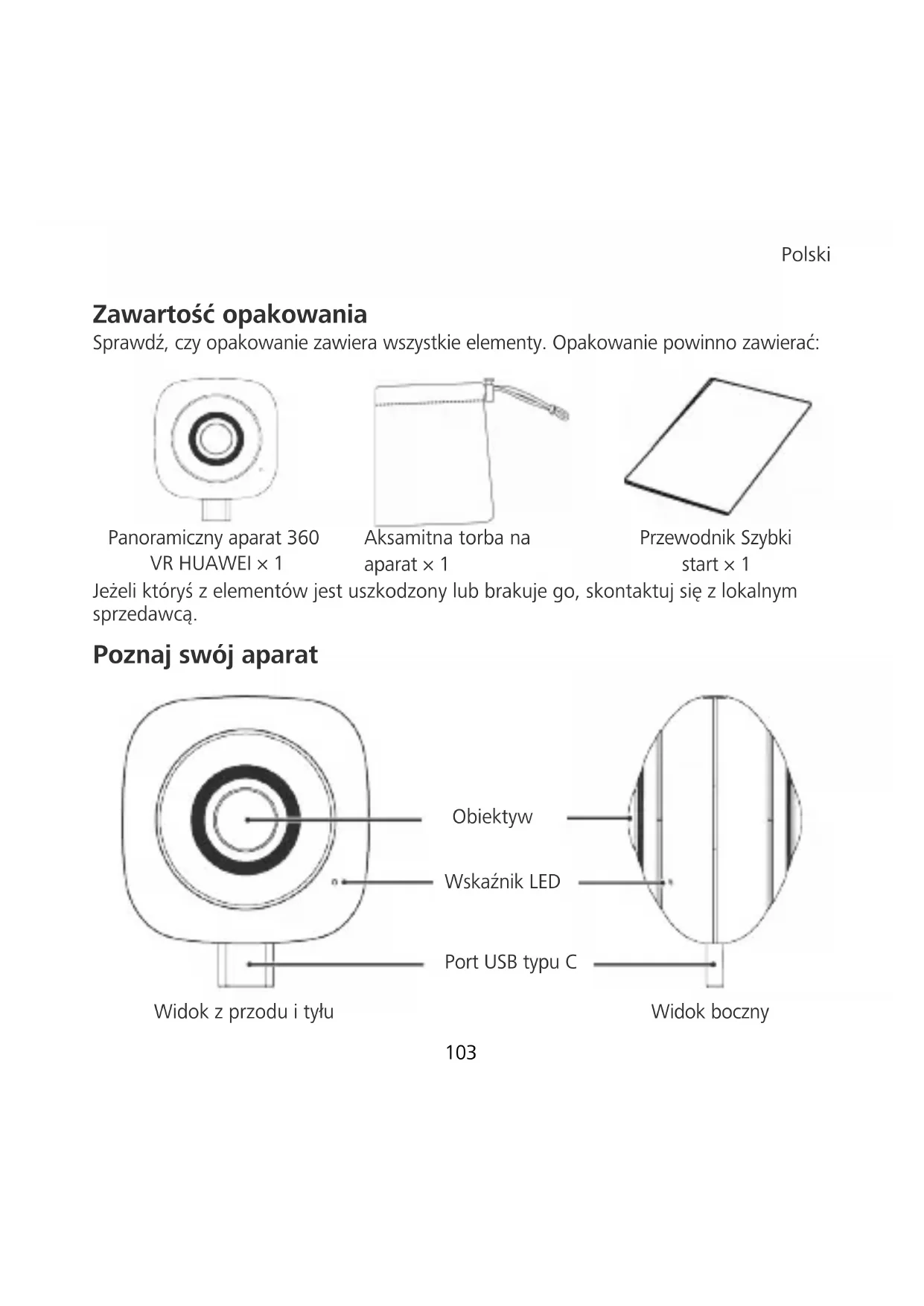 Panoramiczny aparat 360 VR HUAWEI × 1 Aksamitna torba na aparat × 1 Przewodnik Szybki start × 1 Jeżeli któryś z elementów jest uszkodzony lub brakuje go, skontaktuj się z lokalnym sprzedawcą. Poznaj swój aparat
