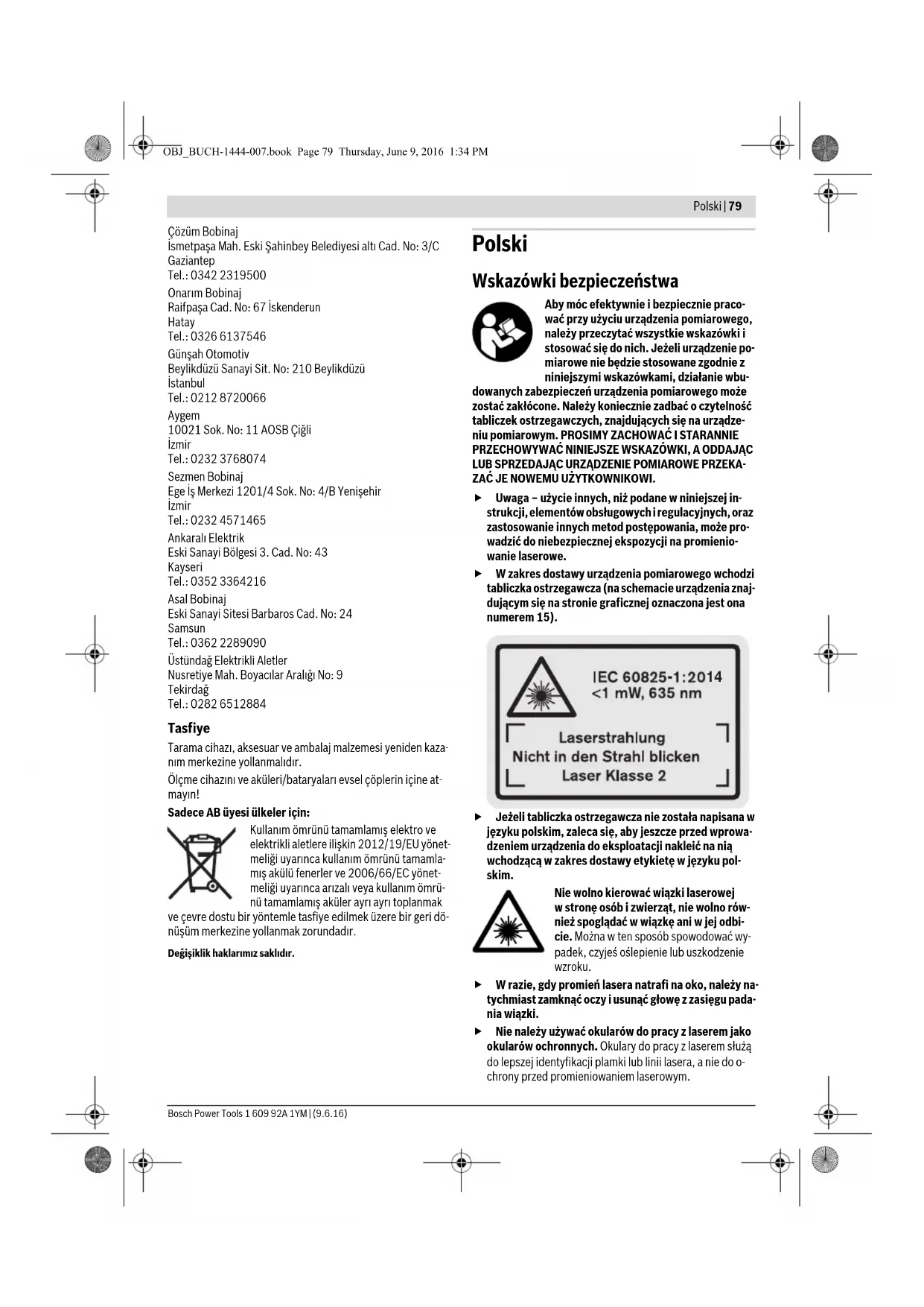 - Przedstawiony na rysunkach lub opisany osprzęt nie wchodzi w skład wyposażenia standardowego. ** Aby przywołać funkcje dodatkowe należy wcisnąć przycisk i przytrzymać w tej pozycji. Elementy wskaźników a Paski wartości pomiarowych b Pasek wyniku c Funkcje pomiaru d Laser jest włączony e Płaszczyzna odniesienia dla pomiaru f Alarm temperatury g Alarm wyładowania akumulatora h Wskaźnik błędu »ERROR« Montaż Wkładanie/wymiana baterii Zaleca się eksploatację urządzenia pomiarowego przy użyciu baterii alkaliczno-manganowych lub akumulatorów. Z akumulatorami 1,2 V można dokonać mniejszą ilość pomia- rów niż przy zastosowaniu baterii 1,5 V. Aby otworzyć pokrywkę wnęki na baterie 10, należy wcisnąć blokadę 16 i zdjąć pokrywkę. Włożyć baterie lub akumulatory do wnęki. Należy przy tym zwrócić uwagę na zachowanie pra- widłowej biegunowości zgodnie ze schematem umieszczo- nym wewnątrz wnęki. Podczas wkładania baterii lub akumulatorów do wnęki należy zwrócić uwagę na zachowanie prawidłowej biegunowości, zgodnie ze schematem umieszczonym wewnątrz wnęki. Gdy na wyświetlaczu po raz pierwszy ukaże się symbol baterii , możliwe jest dokonanie jeszcze co najmniej 100 pomia- rów pojedynczych. Funkcja pomiaru ciągłego nie jest aktyw- na. Gdy symbol baterii miga, należy wymienić baterie lub og- niwa akumulatorowe. Dokonywanie pomiarów nie jest już możliwe. Baterie lub akumulatory należy zawsze wymieniać kompleta- mi. Należy stosować tylko baterie lub akumulatory pochodzą- ce od tego samego producenta i o jednakowej pojemności. Jeżeli urządzenie pomiarowe nie będzie przez dłuższy czas używane, należy wyjąć z niego baterie lub akumu- latory. Nieużywane przez dłuższy czas baterie i akumula- tory mogą ulec korozji i ulec samorozładowaniu. Praca urządzenia Włączenie Nie wolno zostawiać włączonego urządzenia pomiaro- wego bez nadzoru, a po zakończeniu użytkowania nale- ży je wyłączać. Wiązka lasera może spowodować oślepie- nie osób postronnych. Urządzenie pomiarowe należy chronić przed wilgocią i bezpośrednim napromieniowaniem słonecznym. Narzędzie należy chronić przed ekstremalnie wysokimi lub niskimi temperaturami, a także przed wahaniami temperatury. Nie należy go na przykład pozostawiać na dłuższy okres czasu w samochodzie. W przypadku, gdy urządzenie pomiarowe poddane było większym wahaniom temperatury, należy przed użyciem odczekać, aż powróci ono do normalnej temperatury. Ekstremalnie wysokie lub niskie temperatury, a także silne wahania temperatury mo- gą mieć negatywny wpływ na precyzję pomiaru. Należy unikać silnych uderzeń i nie dopuszczać do upadku urządzenia pomiarowego. Wprzypadku silnego oddziaływania zewnętrznego na urządzenie pomiarowe, należy przed dalszą pracą przeprowadzić kontrolę dokład- ności (zob. »Kontrola dokładności pomiaru odległości«, str. 83). Włączanie/wyłączanie Aby włączyć urządzenie pomiarowe, można wykonać jedną z następujących czynności: – Wcisnąć włącznik/wyłącznik 4: Urządzenie pomiarowe włącza się i ma ustawioną automatycznie funkcję pomiaru odległości (długości). Laser nie jest włączony. – Wcisnąć przycisk »Pomiar« 2: Urządzenie pomiarowe i la- ser włączają się. Urządzenie pomiarowe ustawione jest au- tomatycznie na funkcję pomiaru odległości. Nie wolno kierować wiązki laserowej w stronę osób i zwierząt, jak również spoglądać w wiązkę (nawet przy zachowaniu większej odległości). Aby wyłączyć urządzenie pomiarowe, należy dłużej nacisnąć na włącznik/wyłącznik 4. Jeżeli przez ok. 5 min. na urządzeniu pomiarowym nie zosta- nie naciśnięty żaden przycisk, urządzenie pomiarowe wyłącza się automatycznie w celu oszczędzania baterii. Pomiar Po włączeniu urządzenia pomiarowego poprzez naciśnięcie na przycisk »Pomiar« 2, funkcja pomiaru odległości wybiera- na jest automatycznie. Pozostałe funkcje pomiaru należy ustawić, naciskając poszczególne przyciski funkcyjne (zob. »Funkcje pomiaru«, str. 82). Po włączeniu urządzenia pomiarowego automatycznie wyzna- czana jest jego tylna krawędź jako płaszczyzna odniesienia. Naciskając przycisk płaszczyzny odniesienia 6 można zmienić Pomiar odległości (długości) Pomiar ciągły Pomiar powierzchni Pomiar kubatury (objętości) Pojedynczy pomiar Pitagorasa OBJ_BUCH-1444-007.book Page 81 Thursday, June 9, 2016 1:34 PM82 | Polski 1 609 92A 1YM | (9.6.16) Bosch Power Tools płaszczyznę odniesienia (zob. »Wybór płaszczyzny odniesie- nia (zob.rys.A)«, str.82). Przyłożyć urządzenie pomiarowe wybraną uprzednio płasz- czyzną odniesienia do wybranego punktu startowego dla po- miaru (np. do ściany). Aby włączyć wiązkę lasera należy nacisnąć przycisk pomiaru