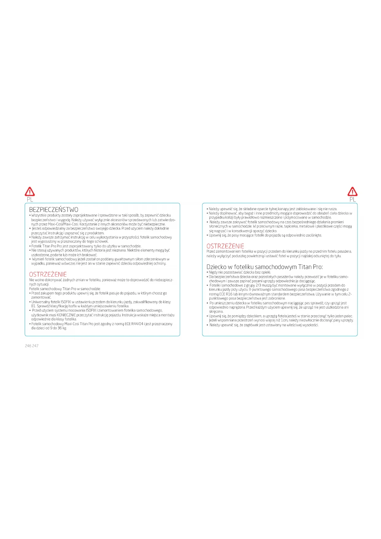 - W razie wątpliwości co do prawidłowego montażu lub użytkowania fotelika należy skontaktować się ze sprzedawcą lub producentem.250 251 PLPL KONSERWACJA Fotelik należy utrzymywać w czystości. Nie stosować smarów oraz agresywnych środków czysz- czących. Wkładka: Wkładka dołączona do fotelika stanowi jego integralną część i odgrywa istotną rolę w funkcjo- nowaniu siedziska dla dziecka od 45 do 60 cm - 9-18kg Grupa 1. Może ona zostać zdjęta do prania, ale konieczne jest umieszczenie jej z powrotem w foteliku gdzie stanowi integralną część oryginalnej wyściółki/tapicerki Maxi-Cosi Titan Pro. Niniejsza wkładka jest przeznaczona wyłącznie do użytku w foteliku Titan Pro. Tkanina: Tapicerka może być zdjęta do czyszczenia. Stosuj tapicerkę i ochraniacze zalecane przez Maxi-Cosi, ponieważ stanowią one integralną część systemu bezpieczeństwa. Ze względów bezpieczeństwa nakładki na pasy nie są zdejmowane, ale mogą być czyszczone wilgotną ściereczką. Przed rozpoczęciem prania sprawdzić metkę wszytą w tkaninę, na której znajdują się symbole określające metodę prania. Skorupa: Przetrzeć wilgotną ściereczką. OCHRONA ŚRODOWISKA Należy trzymać plastikowe opakowania poza zasięgiem dziecka, aby uniknąć ryzyka uduszenia. Ze względów ekologicznych, po zakończeniu użytkowania, produktu zalecamy jego utylizację w zakładzie przetwórstwa odpadów, zgodnie z lokalnymi przepisami. PYTANIA Prosimy o kontakt z najbliższym sprzedawcą produktów Maxi-Cosi lub odwiedzenie naszej strony internetowej pod adresem www.maxi-cosi.com. Należy pamiętać o następujących informacjach: