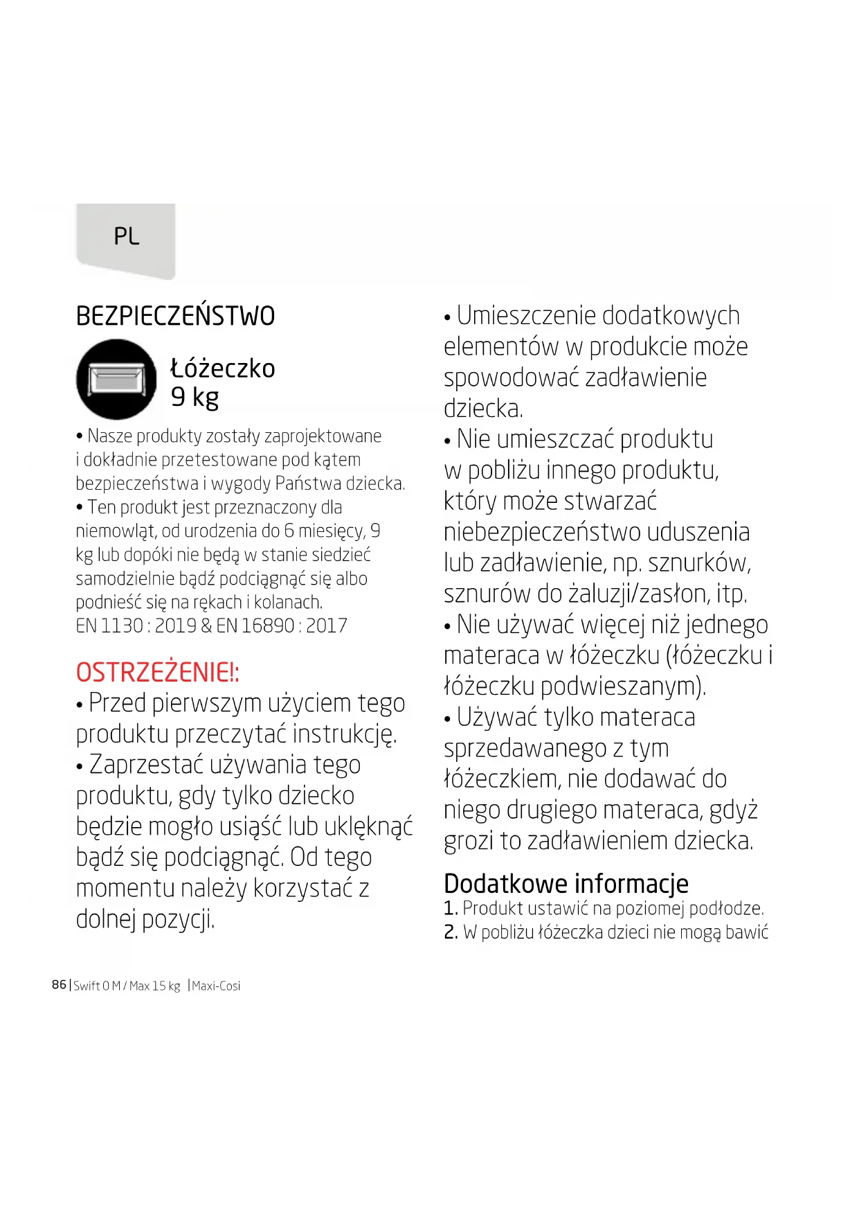 - Produkt został zaprojektowany dla małych dzieci ważących do 15 kg (tzn. od narodzin do ok. 42 miesiąca). EN 716-1 : 2017 & EN 16890 : 2017 PL88