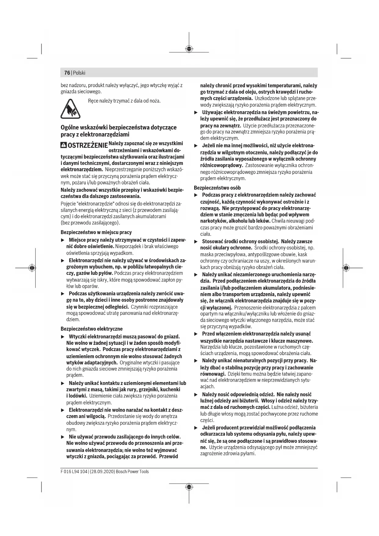 Karasoku Mahallesi 28028. Sokak No:20/A Merkez / ADANA Tel.: +903223599710 -3521379 Fax: +903223591323 E-mail: isiklar@isiklarelektrik.com Diğer servis adreslerini şurada bulabilirsiniz: www.bosch-pt.com/serviceaddresses Tasfiye Ürünler, aksesuar ve ambalaj malzemesi çevre dostu bir biçimde tasfiye edilmek üzere geri dönüşüm merkezine yollanmak zorundadır. Ürünleri evsel çöplerin içine atmayın! Sadece AB ülkeleri için: Eski elektrikli el aletleri ve elektronik aletlere ilişkin 2012/19/EU sayılı Avrupa Birliği yönetmeliği ve bunların tek tek ülkelerin hukuklarına uyarlanması uyarınca, kullanım ömrünü tamamlamış elektrikli el aletleri ayrı ayrı toplanmak ve çevre dostu bir yöntemle tasfiye edilmek üzere yeniden kazanım merkezlerine gönderilmek zorundadır. Polski Wskazówki bezpieczeństwa Opis symboli Przed przystąpieniem do pracy należy przeczy- tać niniejszą instrukcję eksploatacji. Nie stosować podczas deszczu. Przed przystąpieniem do wykonywania jakich- kolwiek czynności regulacyjnych, pielęgnacyj- nych lub konserwacyjnych przy produkcie, w razie zaplątania się przewodu sieciowego, jego uszkodzenia lub przecięcia, a także gdy dmuchawa do liści/ odkurzacz ogrodowy miałaby/miałby być pozostawiona/y Bosch Power Tools F 016 L94 104 | (28.09.2020)76 | Polski bez nadzoru, produkt należy wyłączyć, jego wtyczkę wyjąć z gniazda sieciowego. Ręce należy trzymać z dala od noża. Ogólne wskazówki bezpieczeństwa dotyczące pracy z elektronarzędziami OSTRZEŻENIE Należy zapoznać się ze wszystkimi ostrzeżeniami i wskazówkami do- tyczącymi bezpieczeństwa użytkowania oraz ilustracjami i danymi technicznymi, dostarczonymi wraz z niniejszym elektronarzędziem. Nieprzestrzeganie poniższych wskazó- wek może stać się przyczyną porażenia prądem elektrycz- nym, pożaru i/lub poważnych obrażeń ciała. Należy zachować wszystkie przepisy i wskazówki bezpie- czeństwa dla dalszego zastosowania. Pojęcie "elektronarzędzie" odnosi się do elektronarzędzi za- silanych energią elektryczną z sieci (z przewodem zasilają- cym) i do elektronarzędzi zasilanych akumulatorami (bezprzewodu zasilającego). Bezpieczeństwo w miejscu pracy u Miejsce pracy należy utrzymywać w czystości i zapew- nić dobre oświetlenie. Nieporządek i brak właściwego oświetlenia sprzyjają wypadkom. u Elektronarzędzi nie należy używać w środowiskach za- grożonym wybuchem, np. w pobliżu łatwopalnych cie- czy, gazów lub pyłów. Podczas pracy elektronarzędziem wytwarzają się iskry, które mogą spowodować zapłon py- łów lub oparów. u Podczas użytkowania urządzenia należy zwrócić uwa- gę na to, aby dzieci i inne osoby postronne znajdowały się w bezpiecznej odległości. Czynniki rozpraszające mogą spowodować utratę panowania nad elektronarzę- dziem. Bezpieczeństwo elektryczne u Wtyczki elektronarzędzi muszą pasować do gniazd. Nie wolno w żadnej sytuacji i w żaden sposób modyfi- kować wtyczek. Podczas pracy elektronarzędziami z uziemieniem ochronnym nie wolno stosować żadnych wtyków adaptacyjnych. Oryginalne wtyczki i pasujące do nich gniazda sieciowe zmniejszają ryzyko porażenia prądem. u Należy unikać kontaktu z uziemionymi elementami lub zwartymi z masą, takimi jak rury, grzejniki, kuchenki ilodówki. Uziemienie ciała zwiększa ryzyko porażenia prądem elektrycznym. u Elektronarzędzi nie wolno narażać na kontakt z desz- czem ani wilgocią. Przedostanie się wody do wnętrza obudowy zwiększa ryzyko porażenia prądem elektrycz- nym. u Nie używać przewodu zasilającego do innych celów. Nie wolno używać przewodu do przenoszenia ani prze- suwania elektronarzędzia; nie wolno też wyjmować wtyczki z gniazda, pociągając za przewód. Przewód należy chronić przed wysokimi temperaturami, należy go trzymać zdala od oleju, ostrych krawędzi i rucho- mych części urządzenia. Uszkodzone lub splątane prze- wody zwiększają ryzyko porażenia prądem elektrycznym. u Używając elektronarzędzia na świeżym powietrzu, na- leży upewnić się, że przedłużacz jest przeznaczony do pracy na zewnątrz. Użycie przedłużacza przeznaczone- go do pracy na zewnątrz zmniejsza ryzyko porażenia prą- dem elektrycznym. u Jeżeli nie ma innej możliwości, niż użycie elektrona- rzędzia w wilgotnym otoczeniu, należy podłączyć je do źródła zasilania wyposażonego w wyłącznik ochronny różnicowoprądowy. Zastosowanie wyłącznika ochron- nego różnicowoprądowego zmniejsza ryzyko porażenia prądem elektrycznym. Bezpieczeństwo osób u Podczas pracy z elektronarzędziem należy zachować czujność, każdą czynność wykonywać ostrożnie i z rozwagą. Nie przystępować do pracy elektronarzę- dziem w stanie zmęczenia lub będąc pod wpływem narkotyków, alkoholu lub leków. Chwila nieuwagi pod- czas pracy może grozić bardzo poważnymi obrażeniami ciała. u Stosować środki ochrony osobistej. Należy zawsze nosić okulary ochronne. Środki ochrony osobistej, np. maska przeciwpyłowa, antypoślizgowe obuwie, kask ochronny czy ochraniacze na uszy, w określonych warun- kach pracy obniżają ryzyko obrażeń ciała. u Należy unikać niezamierzonego uruchomienia narzę- dzia. Przed podłączeniem elektronarzędzia do źródła zasilania i/lub podłączeniem akumulatora, podniesie- niem albo transportem urządzenia, należy upewnić się, że włącznik elektronarzędzia znajduje się w pozy- cji wyłączonej. Przenoszenie elektronarzędzia z palcem opartym na włączniku/wyłączniku lub włożenie do gniaz- da sieciowego wtyczki włączonego narzędzia, może stać się przyczyną wypadków. u Przed włączeniem elektronarzędzia należy usunąć wszystkie narzędzia nastawcze i klucze maszynowe. Narzędzia lub klucze, pozostawione wruchomych czę- ściach urządzenia, mogą spowodować obrażenia ciała. u Należy unikać nienaturalnych pozycji przy pracy. Na- leży dbać o s