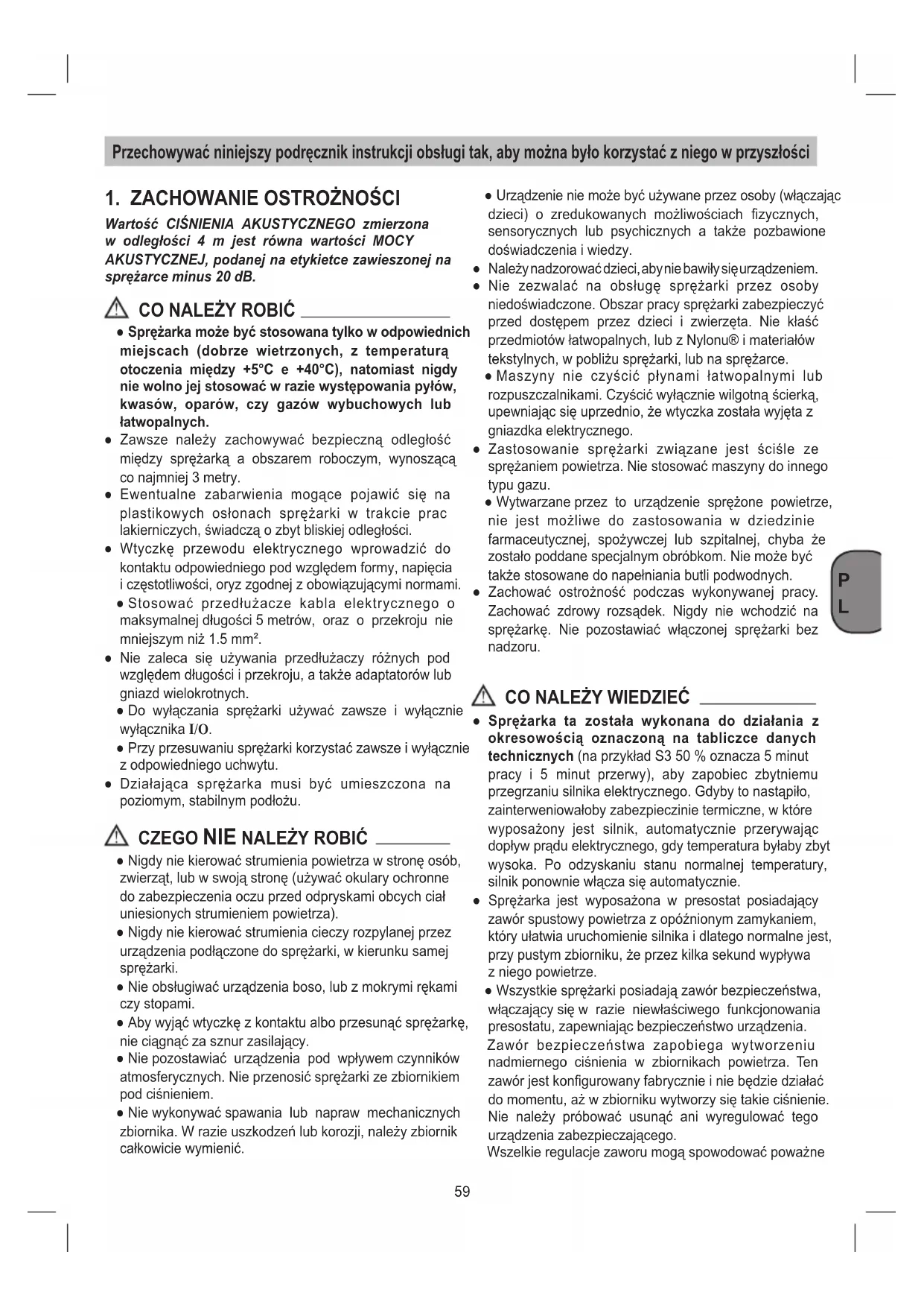● Sprężarka ta została wykonana do działania z okresowością oznaczoną na tabliczce danych technicznych (na przykład S3 50 % oznacza 5 minut pracy i 5 minut przerwy), aby zapobiec zbytniemu przegrzaniu silnika elektrycznego. Gdyby to nastąpiło, zainterweniowałoby zabezpieczinie termiczne, w które wyposażony jest silnik, automatycznie przerywając dopływ prądu elektrycznego, gdy temperatura byłaby zbyt wysoka. Po odzyskaniu stanu normalnej temperatury, silnik ponownie włącza się automatycznie. ● Sprężarka jest wyposażona w presostat posiadający zawór spustowy powietrza z opóźnionym zamykaniem, który ułatwia uruchomienie silnika i dlatego normalne jest, przy pustym zbiorniku, że przez kilka sekund wypływa z niego powietrze. ● Wszystkie sprężarki posiadają zawór bezpieczeństwa, włączający się w razie niewłaściwego funkcjonowania presostatu, zapewniając bezpieczeństwo urządzenia. Zawór bezpieczeństwa zapobiega wytworzeniu nadmiernego ciśnienia w zbiornikach powietrza. Ten zawór jest kongurowany fabrycznie i nie będzie działać do momentu, aż w zbiorniku wytworzy się takie ciśnienie. Nie należy próbować usunąć ani wyregulować tego urządzenia zabezpieczającego. Wszelkie regulacje zaworu mogą spowodować poważne Przechowywać niniejszy podręcznik instrukcji obsługi tak, aby można było korzystać z niego w przyszłościP