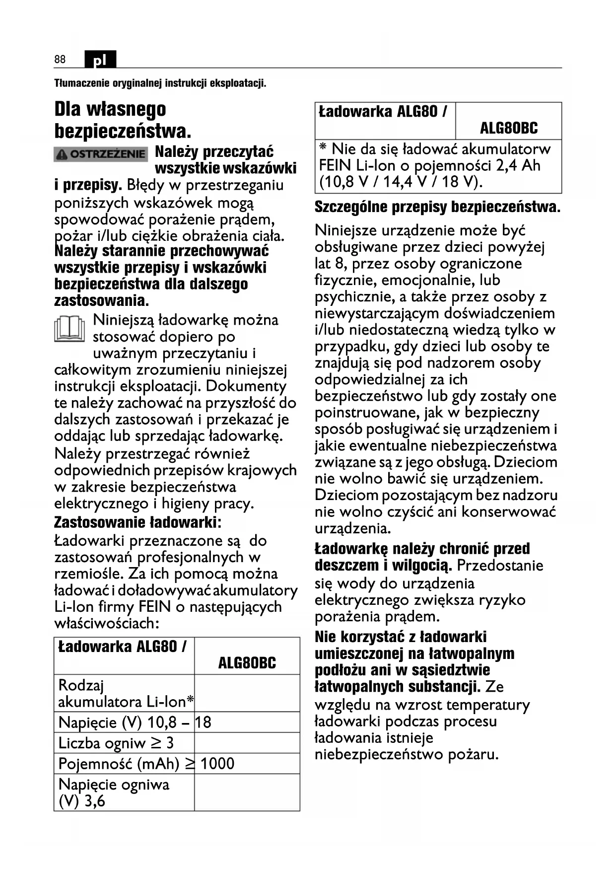 Tłumaczenie oryginalnej instrukcji eksploatacji. Dla własnego bezpieczeństwa. Należy przeczytać wszystkie wskazówki i przepisy. Błędy w przestrzeganiu poniższych wskazówek mogą spowodować porażenie prądem, pożar i/lub ciężkie obrażenia ciała. Należy starannie przechowywać wszystkie przepisy i wskazówki bezpieczeństwa dla dalszego zastosowania. Niniejszą ładowarkę można stosować dopiero po uważnym przeczytaniu i całkowitym zrozumieniu niniejszej instrukcji eksploatacji. Dokumenty te należy zachować na przyszłość do dalszych zastosowań i przekazać je oddając lub sprzedając ładowarkę. Należy przestrzegać również odpowiednich przepisów krajowych w zakresie bezpieczeństwa elektrycznego i higieny pracy. Zastosowanie ładowarki: Ładowarki przeznaczone są do zastosowań profesjonalnych w rzemiośle. Za ich pomocą można ładować i doładowywać akumulatory Li-Ion firmy FEIN o następujących właściwościach: Szczególne przepisy bezpieczeństwa. Niniejsze urządzenie może być obsługiwane przez dzieci powyżej lat 8, przez osoby ograniczone fizycznie, emocjonalnie, lub psychicznie, a także przez osoby z niewystarczającym doświadczeniem i/lub niedostateczną wiedzą tylko w przypadku, gdy dzieci lub osoby te znajdują się pod nadzorem osoby odpowiedzialnej za ich bezpieczeństwo lub gdy zostały one poinstruowane, jak w bezpieczny sposób posługiwać się urządzeniem i jakie ewentualne niebezpieczeństwa związane są z jego obsługą. Dzieciom nie wolno bawić się urządzeniem. Dzieciom pozostającym bez nadzoru nie wolno czyścić ani konserwować urządzenia. Ładowarkę należy chronić przed deszczem i wilgocią. Przedostanie się wody do urządzenia elektrycznego zwiększa ryzyko porażenia prądem. Nie korzystać z ładowarki umieszczonej na łatwopalnym podłożu ani w sąsiedztwie łatwopalnych substancji. Ze względu na wzrost temperatury ładowarki podczas procesu ładowania istnieje niebezpieczeństwo pożaru. Ładowarka ALG80 / ALG80BC Rodzaj akumulatora Li-Ion* Napięcie (V) 10,8 – 18 Liczba ogniw ≥ 3 Pojemność (mAh) ≥ 1000 Napięcie ogniwa (V) 3,6