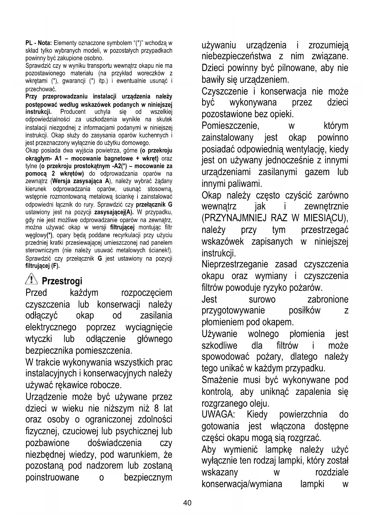 Для чистки используйте ТОЛЬКО специальную тряпку, смоченную нейтральным жидким моющим средством. НЕ ИСПОЛЬЗУЙТЕ НИКАКИЕ ИНСТРУМЕНТЫ ДЛЯ ОЧИСТКИ. Не применяйте средства, содержащие абразивные материалы. НЕ ПРИМЕНЯЙТЕ СПИРТ! Фильтр задержки жира – Угольный фильтр (*): смонтирован/ы сзади решетки, должен/ны заменяться раз в месяц. Если имеющаяся модель снабжена металлическим фильтром для задержки жира , мойте его каждый месяц неагрессивным моющим средством, вручную или в посудомоечной машине при низкой температуре и коротким циклом мойки. При мойке в посудомоечной машине металлический фильтр может обесцвечиваться, но фильтрующие свойства его остаются абсолютно неизменными. Замена ламп (Внимание! Прежде чем прикасаться к лампам убедитесь в том, что они остыли): Исопльзуйте только лампы макс. мощностью 40 Вт Е1440 PL - Nota: Elementy oznaczone symbolem “(*)” wchodzą w skład tylko wybranych modeli, w pozostałych przypadkach powinny być zakupione osobno. Sprawdzić czy w wyniku transportu wewnątrz okapu nie ma pozostawionego materiału (na przykład woreczków z wkrętami (*), gwarancji (*) itp.) i ewentualnie usunąć i przechować. Przy przeprowadzaniu instalacji urządzenia należy postępować według wskazówek podanych w niniejszej instrukcji. Producent uchyla się od wszelkiej odpowiedzialności za uszkodzenia wynikłe na skutek instalacji niezgodnej z informacjami podanymi w niniejszej instrukcji. Okap służy do zasysania oparów kuchennych i jest przeznaczony wyłącznie do użytku domowego. Okap posiada dwa wyjścia powietrza, górne (o przekroju okrągłym- A1 – mocowanie bagnetowe + wkręt) oraz tylne (o przekroju prostokątnym -A2(*) – mocowanie za pomocą 2 wkrętów) do odprowadzania oparów na zewnątrz (Wersja zasysająca A), należy wybrać żądany kierunek odprowadzania oparów, usunąć stosown