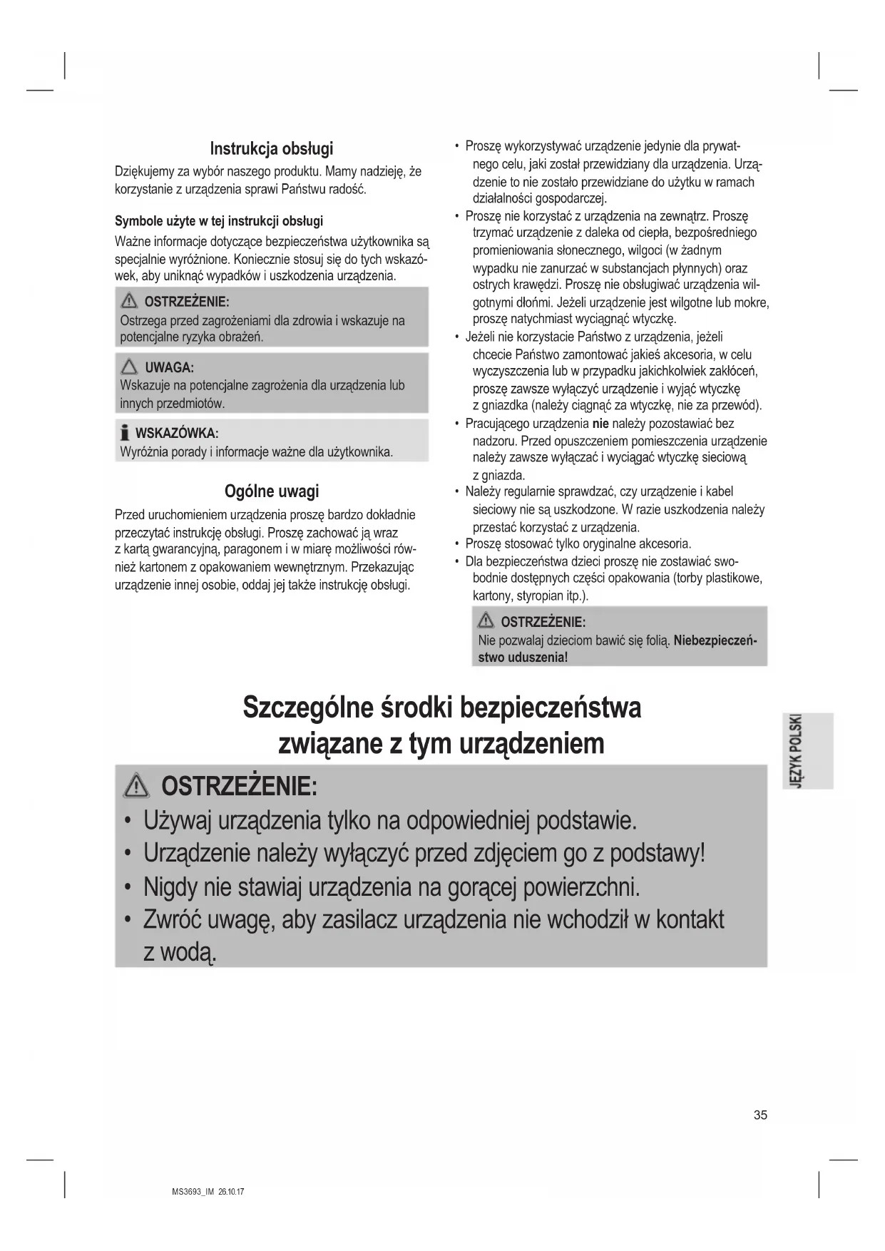 - Zwróć uwagę, aby zasilacz urządzenia nie wchodził w kontakt z wodą.MS3693_IM 26.10.17