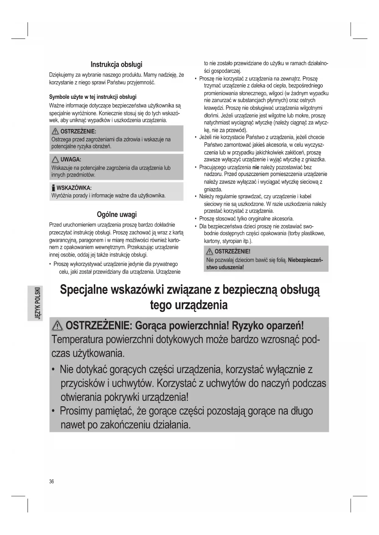 - Dla bezpieczeństwa dzieci proszę nie zostawiać swo- bodnie dostępnych części opakowania (torby plastikowe, kartony, styropian itp.). OSTRZEŻENIE! Nie pozwalaj dzieciom bawić się folią. Niebezpieczeń- stwo uduszenia! Specjalne wskazówki związane z bezpieczną obsługą tego urządzenia OSTRZEŻENIE: Gorąca powierzchnia! Ryzyko oparzeń! Temperatura powierzchni dotykowych może bardzo wzrosnąć pod- czas użytkowania.
