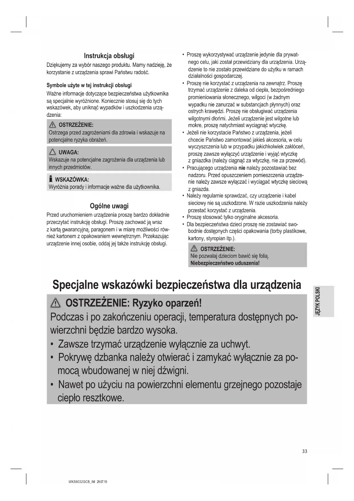 - Dla bezpieczeństwa dzieci proszę nie zostawiać swo- bodnie dostępnych części opakowania (torby plastikowe, kartony, styropian itp.). OSTRZEŻENIE: Nie pozwalaj dzieciom bawić się folią. Niebezpieczeństwo uduszenia! Specjalne wskazówki bezpieczeństwa dla urządzenia OSTRZEŻENIE: Ryzyko oparzeń! Podczas i po zakończeniu operacji, temperatura dostępnych po- wierzchni będzie bardzo wysoka.