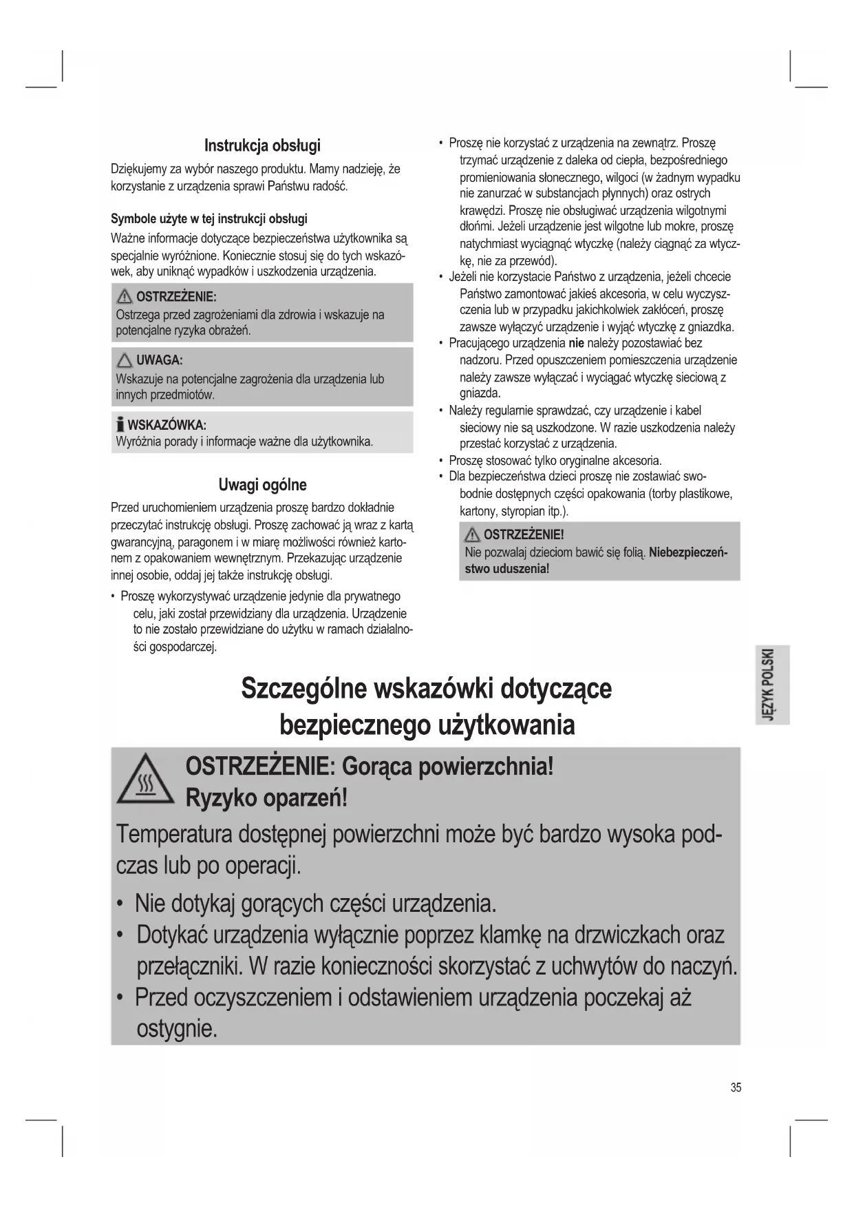 • Dla bezpieczeństwa dzieci proszę nie zostawiać swo- bodnie dostępnych części opakowania (torby plastikowe, kartony, styropian itp.). OSTRZEŻENIE! Nie pozwalaj dzieciom bawić się folią. Niebezpieczeń- stwo uduszenia! Szczególne wskazówki dotyczące bezpiecznego użytkowania OSTRZEŻENIE: Gorąca powierzchnia! Ryzyko oparzeń! Temperatura dostępnej powierzchni może być bardzo wysoka pod- czas lub po operacji.