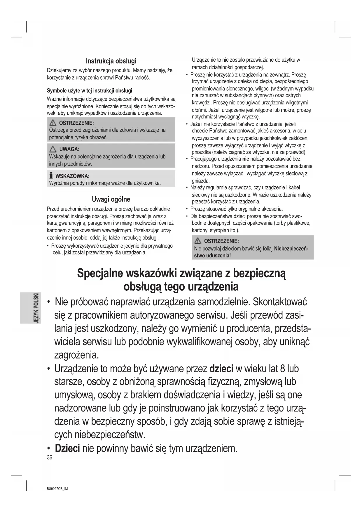 - Ecodesign requirements for vacuum cleaners COMMIS- SION REGULATION (EU) No 666/2013 Disposal Meaning of the “Dustbin” Symbol Protect our environment: do not dispose of electrical equipment in the domestic waste. Please return any electrical equipment that you will no longer use to the collection points provided for their disposal. This helps avoid the potential effects of incorrect disposal on the environment and human health. This will contribute to the recycling and other forms of re-utili- sation of electrical and electronic equipment. Information concerning where the equipment can be dis- posed of can be obtained from your local authority.36 BS9027CB_IM 08.03.16 Instrukcja obsługi Dziękujemy za wybór naszego produktu. Mamy nadzieję, że korzystanie z urządzenia sprawi Państwu radość. Symbole użyte w tej instrukcji obsługi Ważne informacje dotyczące bezpieczeństwa użytkownika są specjalnie wyróżnione. Koniecznie stosuj się do tych wskazó- wek, aby uniknąć wypadków i uszkodzenia urządzenia. OSTRZEŻENIE: Ostrzega przed zagrożeniami dla zdrowia i wskazuje na potencjalne ryzyka obrażeń. UWAGA: Wskazuje na potencjalne zagrożenia dla urządzenia lub innych przedmiotów. WSKAZÓWKA: Wyróżnia porady i informacje ważne dla użytkownika. Uwagi ogólne Przed uruchomieniem urządzenia proszę bardzo dokładnie przeczytać instrukcję obsługi. Proszę zachować ją wraz z kartą gwarancyjną, paragonem i w miarę możliwości również kartonem z opakowaniem wewnętrznym. Przekazując urzą- dzenie innej osobie, oddaj jej także instrukcję obsługi.