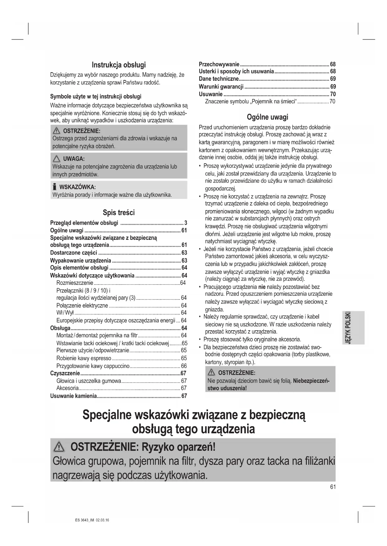 - Dla bezpieczeństwa dzieci proszę nie zostawiać swo- bodnie dostępnych części opakowania (torby plastikowe, kartony, styropian itp.). OSTRZEŻENIE: Nie pozwalaj dzieciom bawić się folią. Niebezpieczeń- stwo uduszenia! Specjalne wskazówki związane z bezpieczną obsługą tego urządzenia OSTRZEŻENIE: Ryzyko oparzeń! Głowica grupowa, pojemnik na ltr, dysza pary oraz tacka na liżanki nagrzewają się podczas użytkowania.62 ES 3643_IM 02.03.16 OSTRZEŻENIE: Ryzyko oparzeń!