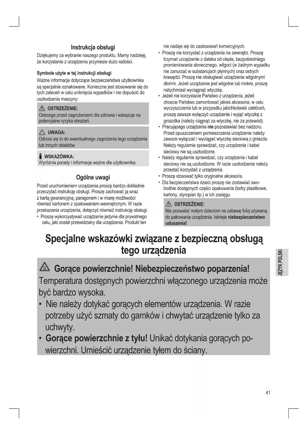 - Dla bezpieczeństwa dzieci proszę nie zostawiać swo- bodnie dostępnych części opakowania (torby plastikowe, kartony, styropian itp.) w ich zasięgu. OSTRZEŻENIE: Nie pozwalać małym dzieciom na zabawę folią używaną do pakowania urządzenia. Istnieje niebezpieczeństwo uduszenia! Specjalne wskazówki związane z bezpieczną obsługą tego urządzenia Gorące powierzchnie! Niebezpieczeństwo poparzenia! Temperatura dostępnych powierzchni włączonego urządzenia może być bardzo wysoka.