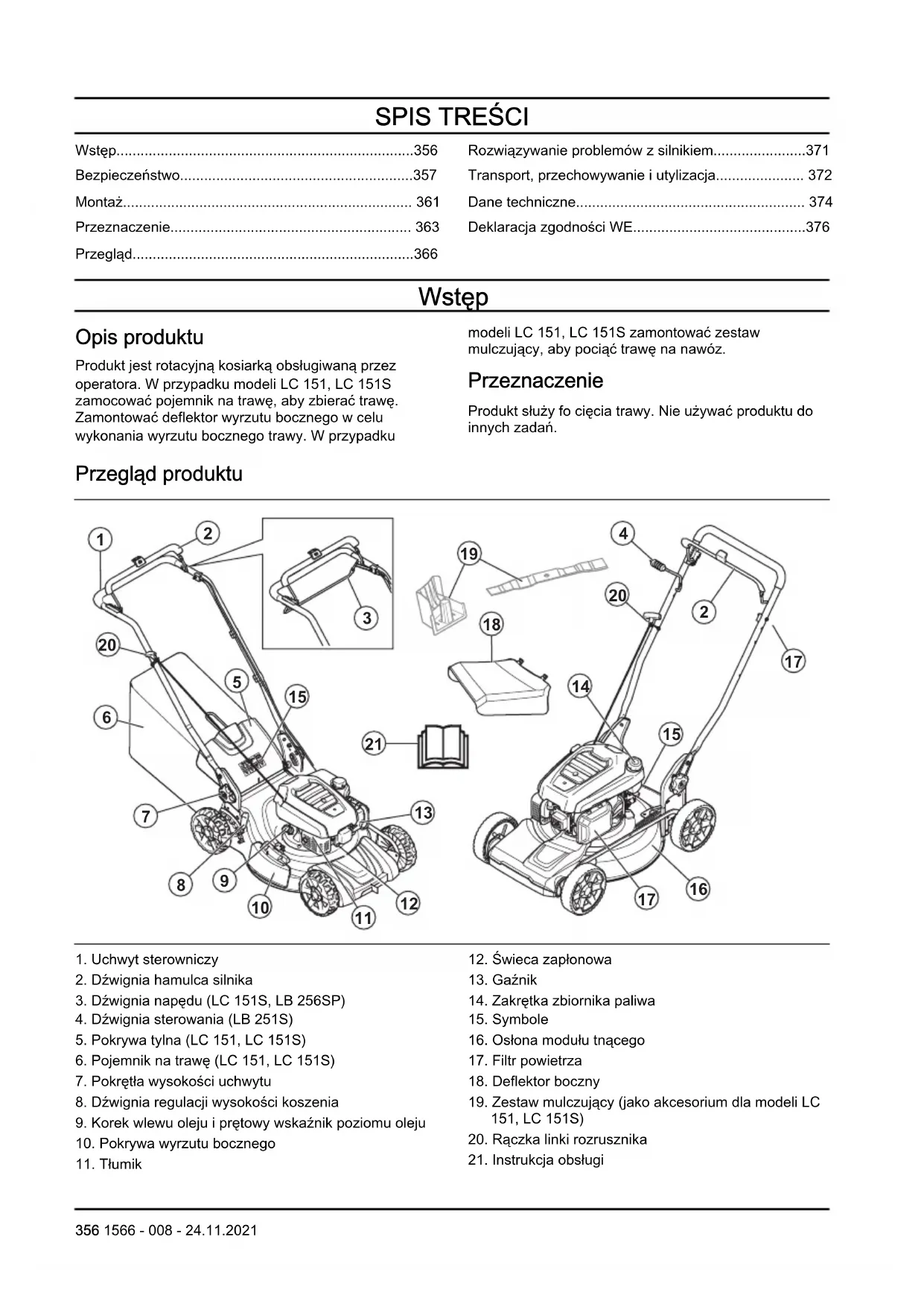 - Deklaracja zgodności WE Wstęp Opis produktu Produkt jest rotacyjną kosiarką obsługiwaną przez operatora. W przypadku modeli LC 151, LC 151S zamocować pojemnik na trawę, aby zbierać trawę. Zamontować deflektor wyrzutu bocznego w celu wykonania wyrzutu bocznego trawy. W przypadku modeli LC 151, LC 151S zamontować zestaw mulczujący, aby pociąć trawę na nawóz. Przeznaczenie Produkt służy fo cięcia trawy. Nie używać produktu do innych zadań. Przegląd produktu p. 376