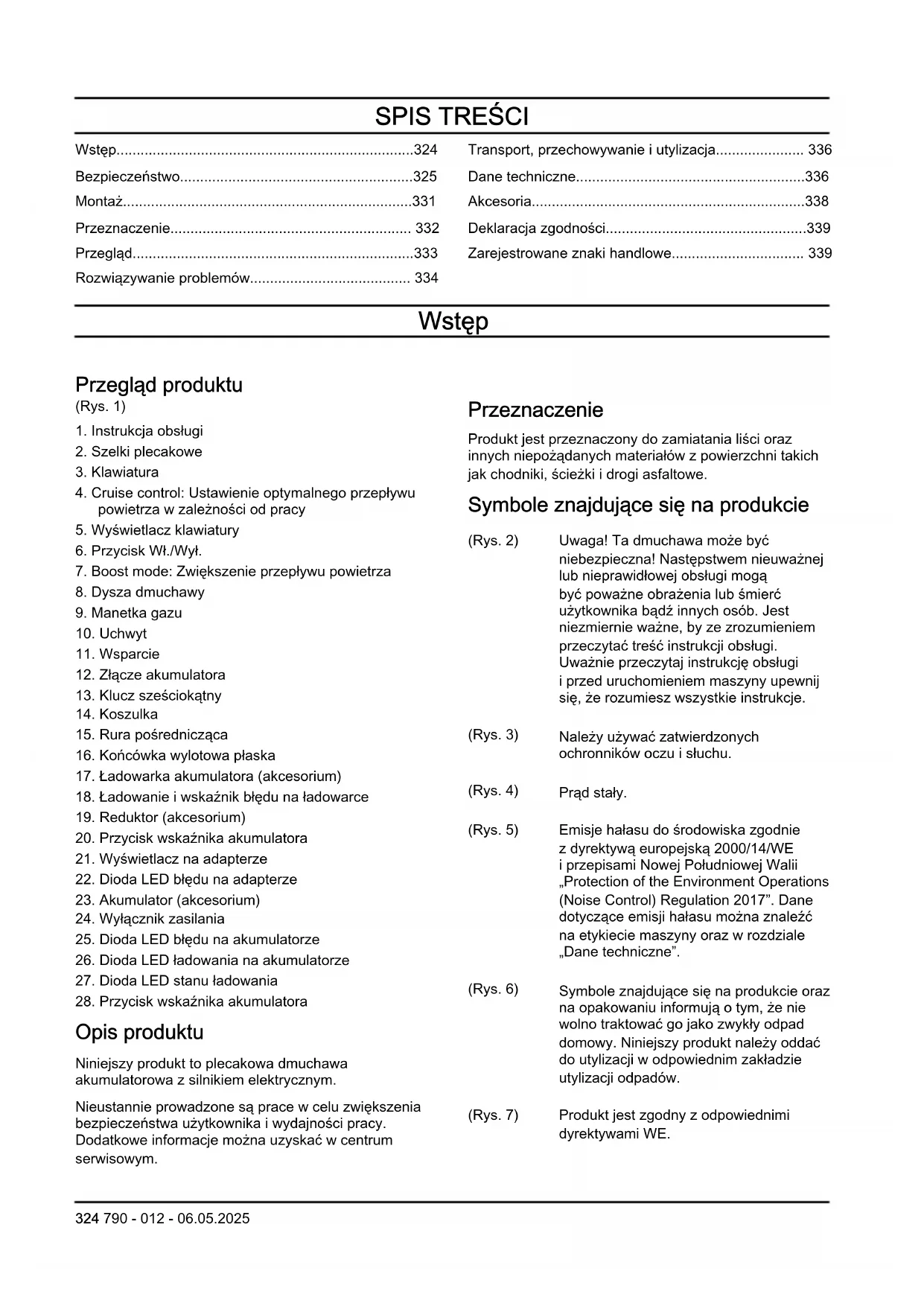 Opis produktu Niniejszy produkt to plecakowa dmuchawa akumulatorowa z silnikiem elektrycznym. Nieustannie prowadzone są prace w celu zwiększenia bezpieczeństwa użytkownika i wydajności pracy. Dodatkowe informacje można uzyskać w centrum serwisowym. Przeznaczenie Produkt jest przeznaczony do zamiatania liści oraz innych niepożądanych materiałów z powierzchni takich jak chodniki, ścieżki i drogi asfaltowe. Symbole znajdujące się na produkcie (Rys. 2) Uwaga! Ta dmuchawa może być niebezpieczna! Następstwem nieuważnej lub nieprawidłowej obsługi mogą być poważne obrażenia lub śmierć użytkownika bądź innych osób. Jest niezmiernie ważne, by ze zrozumieniem przeczytać treść instrukcji obsługi. Uważnie przeczytaj instrukcję obsługi i przed uruchomieniem maszyny upewnij się, że rozumiesz wszystkie instrukcje. (Rys. 3) Należy używać zatwierdzonych ochronników oczu i słuchu. (Rys. 4) Prąd stały. (Rys. 5) Emisje hałasu do środowiska zgodnie z dyrektywą europejską 2000/14/WE i przepisami Nowej Południowej Walii „Protection of the Environment Operations (Noise Control) Regulation 2017”. Dane dotyczące emisji hałasu można znaleźć na etykiecie maszyny oraz w rozdziale „Dane techniczne”. (Rys. 6) Symbole znajdujące się na produkcie oraz na opakowaniu informują o tym, że nie wolno traktować go jako zwykły odpad domowy. Niniejszy produkt należy oddać do utylizacji w odpowiednim zakładzie utylizacji odpadów. (Rys. 7) Produkt jest zgodny z odpowiednimi dyrektywami WE. 324 790 - 012 - 06.05.2025(Rys. 8) Produkt jest zabezpieczony przed rozbryzgami wody. (Rys. 9) Dioda LED ostrzeżenia (Rys. 10) Przycisk Wł./Wył. (Rys. 11) Przycisk Boost mode (Rys. 12) Przycisk Cruise control (Rys. 13) Jeśli produkt wyposażono w technologię bezprzewodową Bluetooth