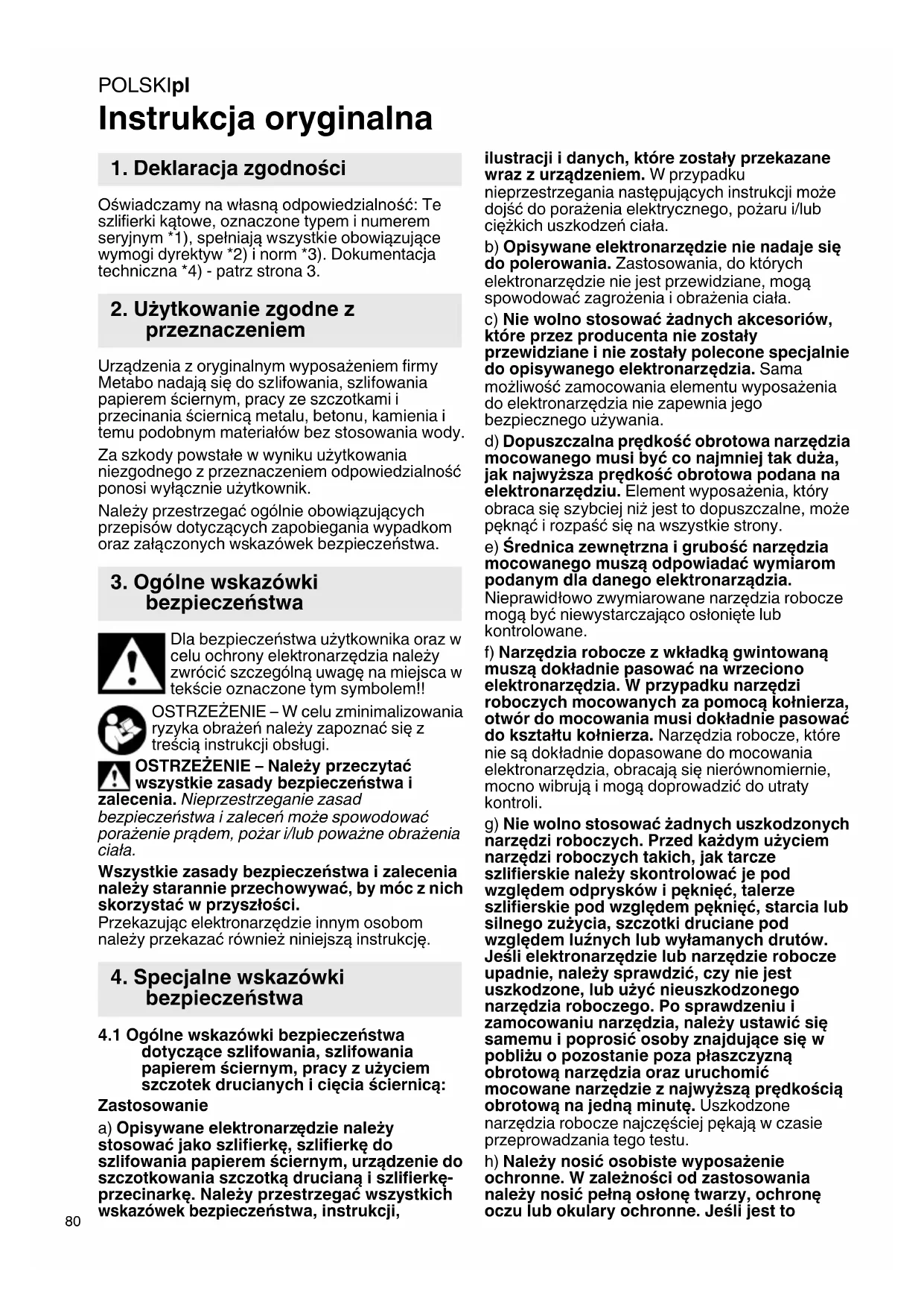 Instrukcja oryginalna Oświadczamy na własną odpowiedzialność: Te szlifierki kątowe, oznaczone typem i numerem seryjnym *1), spełniają wszystkie obowiązujące wymogi dyrektyw *2) i norm *3). Dokumentacja techniczna *4) - patrz strona 3. Urządzenia z oryginalnym wyposażeniem firmy Metabo nadają się do szlifowania, szlifowania papierem ściernym, pracy ze szczotkami i przecinania ściernicą metalu, betonu, kamienia i temu podobnym materiałów bez stosowania wody. Za szkody powstałe w wyniku użytkowania niezgodnego z przeznaczeniem odpowiedzialność ponosi wyłącznie użytkownik. Należy przestrzegać ogólnie obowiązujących przepisów dotyczących zapobiegania wypadkom oraz załączonych wskazówek bezpieczeństwa. Dla bezpieczeństwa użytkownika oraz w celu ochrony elektronarzędzia należy zwrócić szczególną uwagę na miejsca w tekście oznaczone tym symbolem!! OSTRZEŻENIE – W celu zminimalizowania ryzyka obrażeń nale ży zapoznać się z treścią instrukcji obsługi. OSTRZEŻENIE – Należy przeczytać wszystkie zasady bezpieczeństwa i zalecenia. Nieprzestrzeganie zasad bezpieczeństwa i zaleceń może spowodować porażenie prądem, pożar i/lub poważne obrażenia ciała. Wszystkie zasady bezpieczeństwa i zalecenia należy starannie przechowywać, by móc z nich skorzystać w przyszłości. Przekazując elektronarzędzie innym osobom należy przekazać również niniejszą instrukcję.