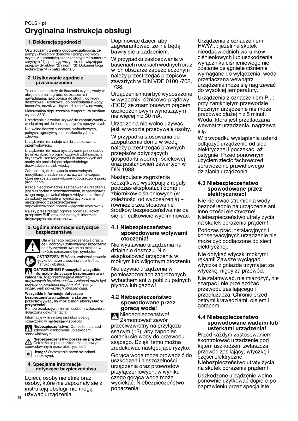 Oryginalna instrukcja obsługi Oświadczamy z pełną odpowiedzialnością, że pompy / hydrofory domowe / pompy do wody czystej z automatyką oznaczone typem i numerem seryjnym *1) spełniają wszystkie obowiązujące przepisy dyrektyw *2) i norm *3). Dokumentacja techniczna *4) - patrz strona 3. To urządzenie służy do tłoczenia czystej wody w obrębie domu i ogrodu, do zraszania i nawadniania, jako pompa do studni, do wody deszczowej i użytkowej, do opróżniania z wody basenów, oczek wodnych i zbiorników na wodę. Maksymalna dopuszczalna temperatura medium wynosi 35°C. Urządzenia nie wolno używać do zaopatrywania w wodę pitną ani do tłoczenia płynów spożywczych. Nie wolno tłoczyć substancji wybuchowych, palnych, agresywnych ani szkodliwych dla zdrowia. Urządzenie nie nadaje się do zastosowania przemysłowego. Urządzenie nie może być używane przez osoby (również dzieci) o ograniczonych zdolnościach fizycznych, sensorycznych lub umys łowych ani osoby nie posiadające odpowiedniego doświadczenia i/lub wiedzy. Zabrania się dokonywania samowolnych modyfikacji urządzenia oraz używania części, które nie zostały sprawdzone i dopuszczone przez producenta. Każde nieodpowiednie zastosowanie urządzenia jest niezgodne z przeznaczeniem, w następstwie czego mogą powstać nieprzewidywalne szkody! Za szkody powstałe w wyniku użytkowania niezgodnego z przeznaczeniem odpowiedzialność ponosi wyłącznie użytkownik. Należy przestrzegać ogólnie obowiązujących przepisów BHP oraz dołączonych informacji dotyczących bezpieczeństwa. Dla własnego bezpieczeństwa oraz w celu ochrony użytkowanego urządzenia należy zwracać uwagę na miejsca w tekście oznaczone tym symbolem! OSTRZEŻENIE! W celu zminimalizowania ryzyka obrażeń zapoznać się z treści