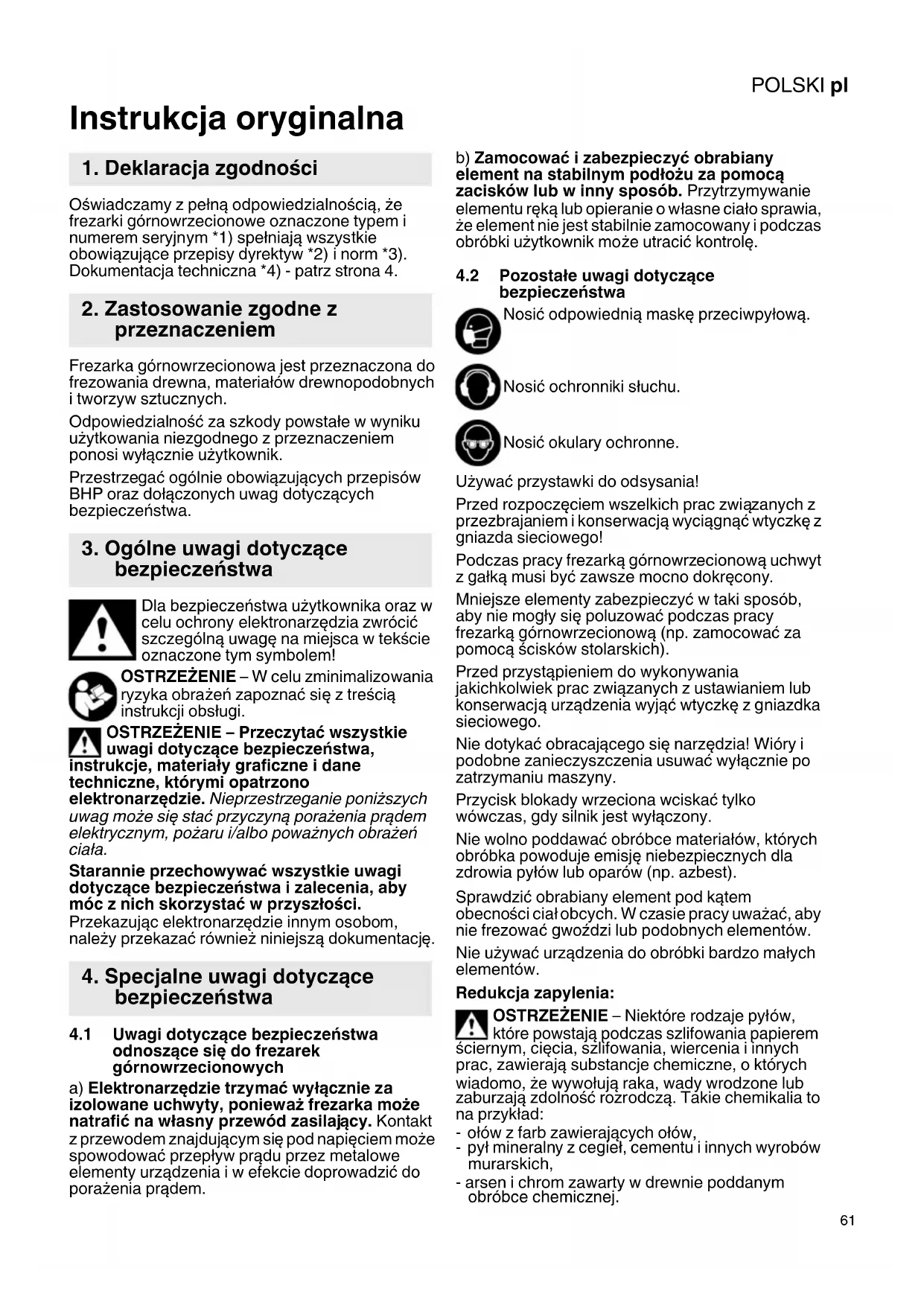 Instrukcja oryginalna Oświadczamy z pełną odpowiedzialnością, że frezarki górnowrzecionowe oznaczone typem i numerem seryjnym *1) spełniają wszystkie obowiązujące przepisy dyrektyw *2) i norm *3). Dokumentacja techniczna *4) - patrz strona 4. Frezarka górnowrzecionowa jest przeznaczona do frezowania drewna, materiałów drewnopodobnych i tworzyw sztucznych. Odpowiedzialność za szkody powstałe w wyniku użytkowania niezgodnego z przeznaczeniem ponosi wyłącznie użytkownik. Przestrzegać ogólnie obowiązujących przepisów BHP oraz dołączonych uwag dotyczących bezpieczeństwa. Dla bezpieczeństwa użytkownika oraz w celu ochrony elektronarzędzia zwrócić szczególną uwagę na miejsca w tekście oznaczone tym symbolem! OSTRZEŻENIE – W celu zminimalizowania ryzyka obrażeń zapoznać się z treścią instrukcji obsługi. OSTRZEŻENIE – Przeczytać wszystkie uwagi dotyczące bezpieczeństwa, instrukcje, materiały graficzne i dane techniczne, którymi opatrzono elektronarzędzie. Nieprzestrzeganie poniższych uwag może się stać przyczyną porażenia prądem elektrycznym, pożaru i/albo poważnych obrażeń ciała. Starannie przechowywać wszystkie uwagi dotyczące bezpieczeństwa i zalecenia, aby móc z nich skorzystać w przyszłości. Przekazując elektronarzędzie innym osobom, należy przekazać również niniejszą dokumentację.