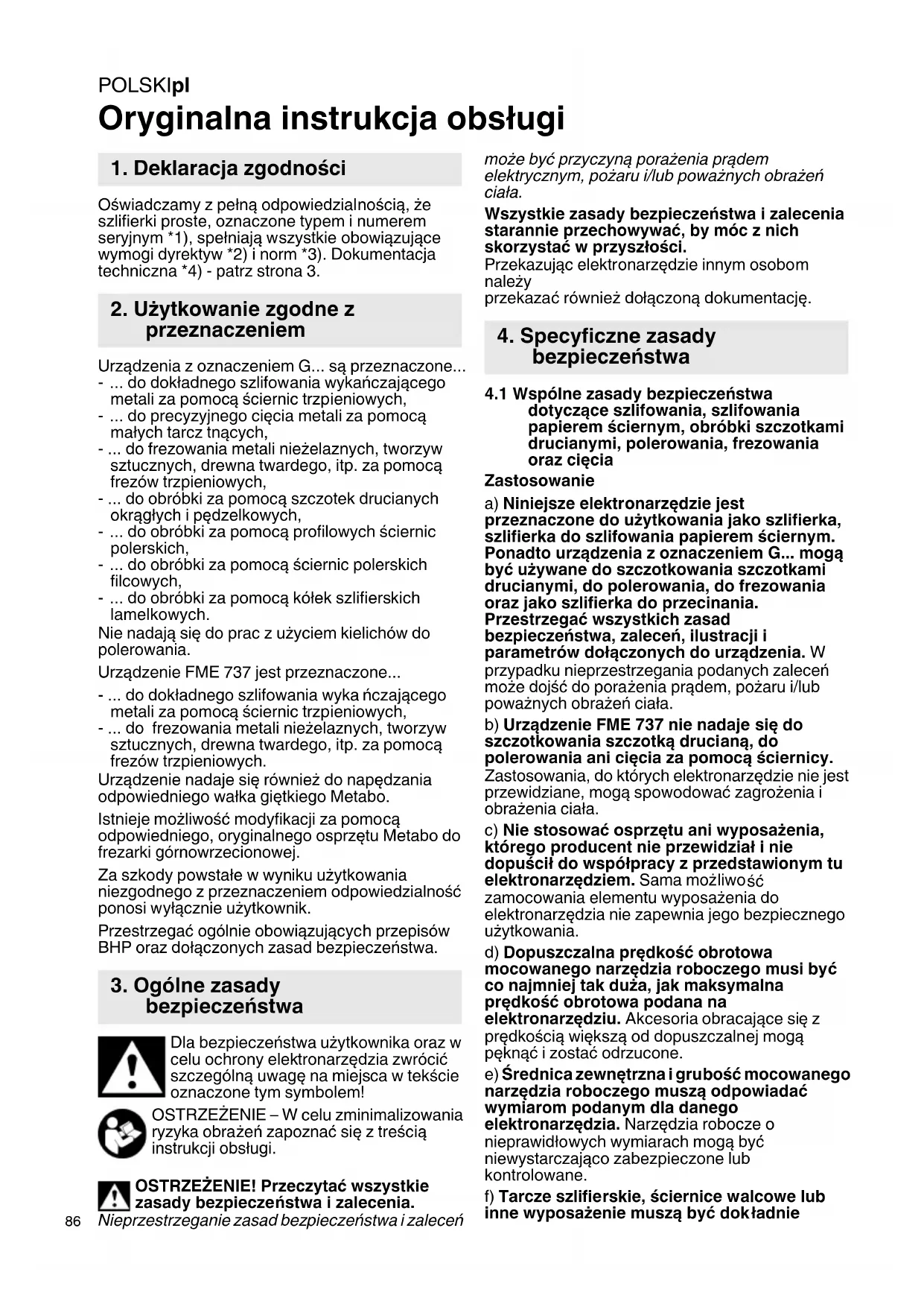 Oryginalna instrukcja obsługi Oświadczamy z pełną odpowiedzialnością, że szlifierki proste, oznaczone typem i numerem seryjnym *1), spełniają wszystkie obowiązujące wymogi dyrektyw *2) i norm *3). Dokumentacja techniczna *4) - patrz strona 3. Urządzenia z oznaczeniem G... są przeznaczone... - ... do dokładnego szlifowania wykańczającego metali za pomocą ściernic trzpieniowych, - ... do precyzyjnego cięcia metali za pomocą małych tarcz tnących, - ... do frezowania metali nieżelaznych, tworzyw sztucznych, drewna twardego, itp. za pomocą frezów trzpieniowych, - ... do obróbki za pomocą szczotek drucianych okrągłych i pędzelkowych, - ... do obróbki za pomocą profilowych ściernic polerskich, - ... do obróbki za pomocą ściernic polerskich filcowych, - ... do obróbki za pomocą kółek szlifierskich lamelkowych. Nie nadają się do prac z użyciem kielichów do polerowania. Urządzenie FME 737 jest przeznaczone... - ... do dokładnego szlifowania wyka ńczającego metali za pomocą ściernic trzpieniowych, - ... do frezowania metali nieżelaznych, tworzyw sztucznych, drewna twardego, itp. za pomocą frezów trzpieniowych. Urządzenie nadaje się również do napędzania odpowiedniego wałka giętkiego Metabo. Istnieje możliwość modyfikacji za pomocą odpowiedniego, oryginalnego osprzętu Metabo do frezarki górnowrzecionowej. Za szkody powstałe w wyniku użytkowania niezgodnego z przeznaczeniem odpowiedzialność ponosi wyłącznie użytkownik. Przestrzegać ogólnie obowiązujących przepisów BHP oraz dołączonych zasad bezpieczeństwa. Dla bezpieczeństwa użytkownika oraz w celu ochrony elektronarzędzia zwrócić szczególną uwagę na miejsca w tekście oznaczone tym symbolem! OSTRZEŻENIE – W celu zminimalizowania ryzyka obrażeń zapoznać się z treścią instrukcji obsługi. OSTRZEŻENIE! Przeczytać wszystkie zasady bezpieczeństwa i zalecenia. Nieprzestrzeganie zasad bezpieczeństwa i zaleceń może być przyczyną porażenia prądem elektrycznym, pożaru i/lub poważnych obrażeń ciała. Wszystkie zasady bezpieczeństwa i zalecenia starannie przechowywać, by móc z nich skorzystać w przyszłości. Przekazując elektronarzędzie innym osobom należy przekazać również dołączoną dokumentację.
