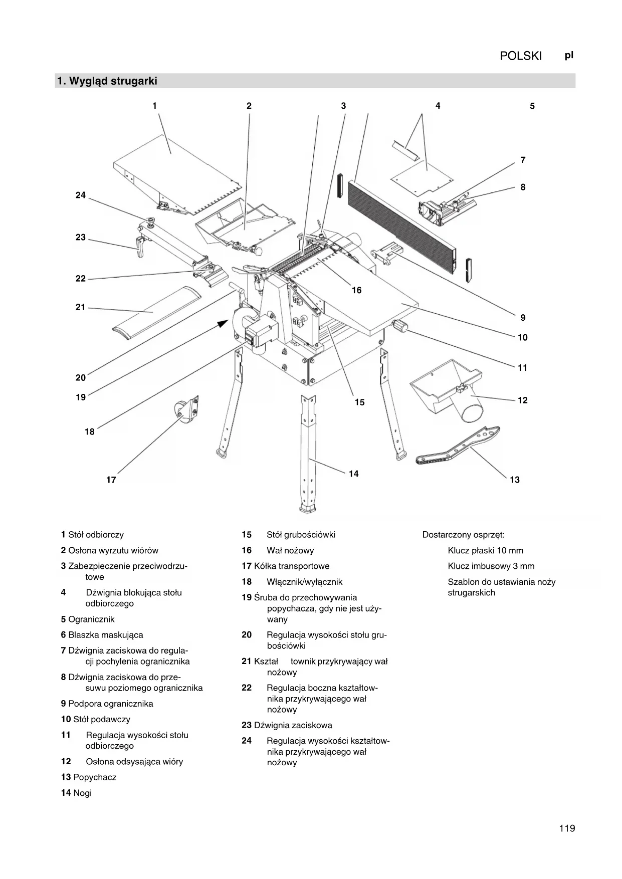 1 Stół odbiorczy 2 Osłona wyrzutu wiórów 3 Zabezpieczenie przeciwodrzu- towe 4 Dźwignia blokująca stołu odbiorczego 5 Ogranicznik 6 Blaszka maskująca 7 Dźwignia zaciskowa do regula- cji pochylenia ogranicznika 8 Dźwignia zaciskowa do prze- suwu poziomego ogranicznika 9 Podpora ogranicznika 10 Stół podawczy 11 Regulacja wysokości stołu odbiorczego 12 Osłona odsysająca wióry 13 Popychacz 14 Nogi 15 Stół grubościówki 16 Wał nożowy 17 Kółka transportowe 18 Włącznik/wyłącznik 19 Śruba do przechowywania popychacza, gdy nie jest uży- wany 20 Regulacja wysokości stołu gru- bościówki 21 Kształ townik przykrywający wał nożowy 22 Regulacja boczna kształtow- nika przykrywającego wał nożowy 23 Dźwignia zaciskowa 24 Regulacja wysokości kształtow- nika przykrywającego wał nożowy Dostarczony osprzęt: Klucz płaski 10 mm Klucz imbusowy 3 mm Szablon do ustawiania noży strugarskich HC260_XW0014D5_pl.fm Oryginalna instrukcja obsługi POLSKI120 POLSKI