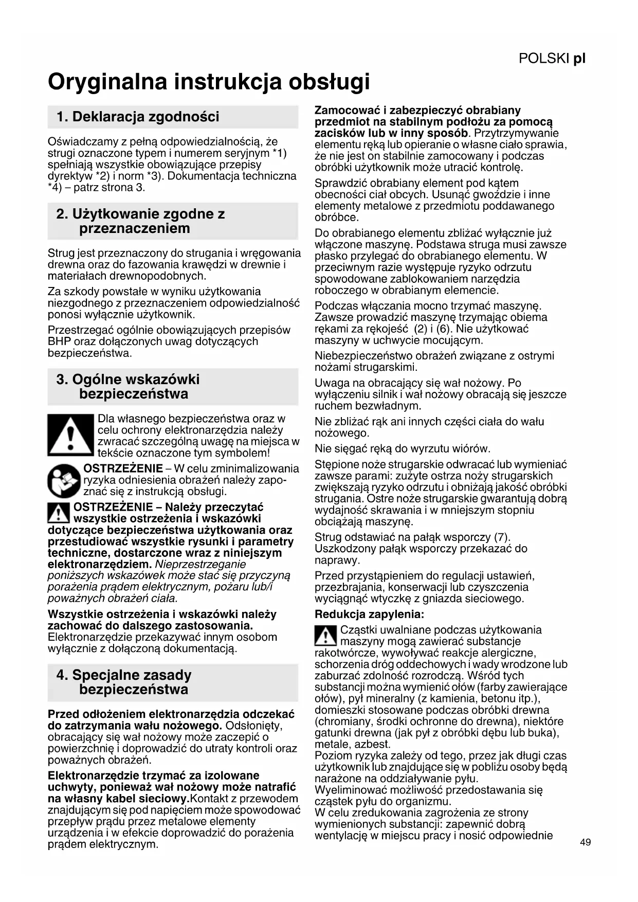 Oryginalna instrukcja obsługi Oświadczamy z pełną odpowiedzialnością, że strugi oznaczone typem i numerem seryjnym *1) spełniają wszystkie obowiązujące przepisy dyrektyw *2) i norm *3). Dokumentacja techniczna *4) – patrz strona 3. Strug jest przeznaczony do strugania i wręgowania drewna oraz do fazowania krawędzi w drewnie i materiałach drewnopodobnych. Za szkody powstałe w wyniku użytkowania niezgodnego z przeznaczeniem odpowiedzialność ponosi wyłącznie użytkownik. Przestrzegać ogólnie obowiązujących przepisów BHP oraz dołączonych uwag dotyczących bezpieczeństwa. Dla własnego bezpieczeństwa oraz w celu ochrony elektronarzędzia należy zwracać szczególną uwagę na miejsca w tekście oznaczone tym symbolem! OSTRZEŻENIE – W celu zminimalizowania ryzyka odniesienia obrażeń należy zapo- znać się z instrukcją obsługi. OSTRZEŻENIE – Należy przeczytać wszystkie ostrzeżenia i wskazówki dotyczące bezpieczeństwa użytkowania oraz przestudiować wszystkie rysunki i parametry techniczne, dostarczone wraz z niniejszym elektronarzędziem. Nieprzestrzeganie poniższych wskazówek może stać się przyczyną porażenia prądem elektrycznym, pożaru lub/i poważnych obrażeń ciała. Wszystkie ostrzeżenia i wskazówki należy zachować do dalszego zastosowania. Elektronarzędzie przekazywać innym osobom wyłącznie z dołączoną dokumentacją. Przed odłożeniem elektronarzędzia odczekać do zatrzymania wału nożowego. Odsłonięty, obracający się wał nożowy może zaczepić o powierzchnię i doprowadzić do utraty kontroli oraz poważnych obrażeń. Elektronarzędzie trzymać za izolowane uchwyty, ponieważ wał nożowy może natrafić na własny kabel sieciowy.Kontakt z przewodem znajdującym się pod napięciem może spowodować przepływ prądu przez metalowe elementy urządzenia i w efekcie doprowadzić do porażenia prądem elektrycznym. Zamocować i zabezpieczyć obrabiany przedmiot na stabilnym podłożu za pomocą zacisków lub w inny sposób. Przytrzymywanie elementu ręką lub opieranie o własne ciało sprawia, że nie jest on stabilnie zamocowany i podczas obróbki użytkownik może utracić kontrolę. Sprawdzić obrabiany element pod kątem obecności ciał obcych. Usunąć gwoździe i inne elementy metalowe z przedmiotu poddawanego obróbce. Do obrabianego elementu zbliżać wyłącznie już włączone maszynę. Podstawa struga musi zawsze płasko przylegać do obrabianego elementu. W przeciwnym razie występuje ryzyko odrzutu spowodowane zablokowaniem narzędzia roboczego w obrabianym elemencie. Podczas włączania mocno trzymać maszynę. Zawsze prowadzić maszynę trzymając obiema rękami za rękojeść (2) i (6). Nie użytkować maszyny w uchwycie mocującym. Niebezpieczeństwo obrażeń związane z ostrymi nożami strugarskimi. Uwaga na obracający się wał nożowy. Po wyłączeniu silnik i wał nożowy obracają si ę jeszcze ruchem bezwładnym. Nie zbliżać rąk ani innych części ciała do wału nożowego. Nie sięgać ręką do wyrzutu wiórów. Stępione noże strugarskie odwracać lub wymieniać zawsze parami: zużyte ostrza noży strugarskich zwiększają ryzyko odrzutu i obniżają jakość obróbki strugania. Ostre noże strugarskie gwarantują dobrą wydajność skrawania i w mniejszym stopniu obciążają maszynę. Strug odstawiać na pałąk wsporczy (7). Uszkodzony pałąk wsporczy przekazać do naprawy. Przed przystąpieniem do regulacji ustawień, przezbrajania, konserwacji lub czyszczenia wyciągnąć wtyczkę z gniazda sieciowego. Redukcja zapylenia: Cząstki uwalniane podczas użytkowania maszyny mogą zawierać substancje rakotwórcze, wywoływać reakcje alergiczne, schorzenia dróg oddechowych i wady wrodzone lub zaburzać zdolność rozrodczą. Wśród tych substancji można wymienić ołów (farby zawierające ołów), pył mineralny (z kamienia, betonu itp.), domieszki stosowane podczas obróbki drewna (chromiany, środki ochronne do drewna), niektóre gatunki drewna (jak pył z obróbki dębu lub buka), metale, azbest. Poziom ryzyka zależy od tego, przez jak długi czas użytkownik lub znajdujące się w pobliżu osoby będą narażone na oddziaływanie pyłu. Wyeliminować możliwość przedostawania się cząstek pyłu do organizmu. W celu zredukowania zagrożenia ze strony wymienionych substancji: zapewnić dobrą wentylację w miejscu pracy i nosić odpowiednie