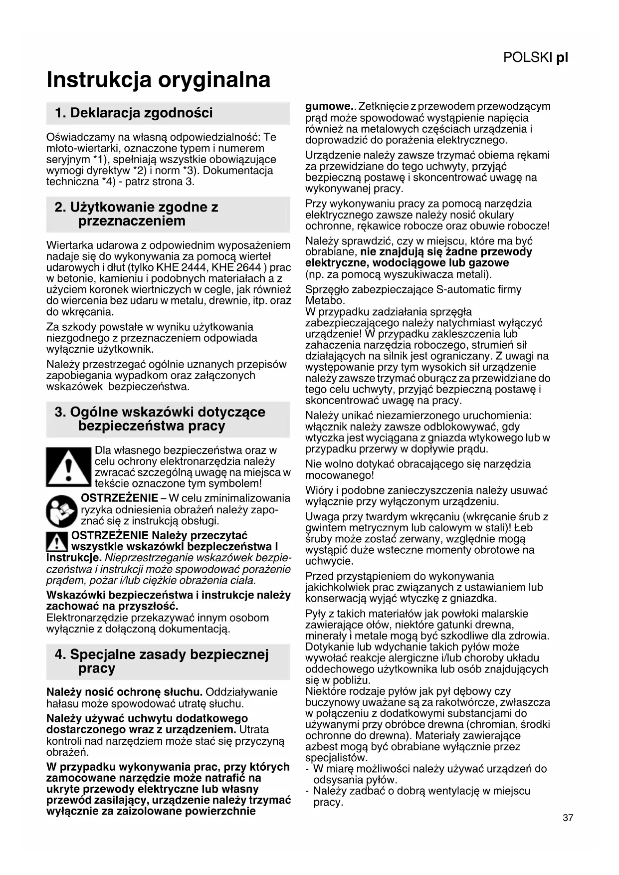 Instrukcja oryginalna Oświadczamy na własną odpowiedzialność: Te młoto-wiertarki, oznaczone typem i numerem seryjnym *1), spełniają wszystkie obowiązujące wymogi dyrektyw *2) i norm *3). Dokumentacja techniczna *4) - patrz strona 3. Wiertarka udarowa z odpowiednim wyposażeniem nadaje się do wykonywania za pomocą wierteł udarowych i dłut (tylko KHE 2444, KHE 2644 ) prac w betonie, kamieniu i podobnych materiałach a z użyciem koronek wiertniczych w cegle, jak również do wiercenia bez udaru w metalu, drewnie, itp. oraz do wkręcania. Za szkody powstałe w wyniku użytkowania niezgodnego z przeznaczeniem odpowiada wyłącznie użytkownik. Należy przestrzegać ogólnie uznanych przepisów zapobiegania wypadkom oraz załączonych wskazówek bezpieczeństwa. Dla własnego bezpieczeństwa oraz w celu ochrony elektronarzędzia należy zwracać szczególną uwagę na miejsca w tekście oznaczone tym symbolem! OSTRZEŻENIE – W celu zminimalizowania ryzyka odniesienia obrażeń należy zapo- znać się z instrukcją obsługi. OSTRZEŻENIE Należy przeczytać wszystkie wskazówki bezpieczeństwa i instrukcje. Nieprzestrzeganie wskazówek bezpie- czeństwa i instrukcji może spowodować porażenie prądem, pożar i/lub ciężkie obrażenia ciała. Wskazówki bezpieczeństwa i instrukcje należy zachować na przyszłość. Elektronarzędzie przekazywać innym osobom wyłącznie z dołączoną dokumentacją. Należy nosić ochronę słuchu. Oddziaływanie hałasu może spowodować utratę słuchu. Należy używać uchwytu dodatkowego dostarczonego wraz z urządzeniem. Utrata kontroli nad narzędziem może stać się przyczyną obrażeń. W przypadku wykonywania prac, przy których zamocowane narzędzie może natrafić na ukryte przewody elektryczne lub własny przewód zasilający, urządzenie należy trzymać wyłącznie za zaizolowane powierzchnie gumowe.. Zetknięcie z przewodem przewodzącym prąd może spowodować wystąpienie napięcia również na metalowych częściach urządzenia i doprowadzić do porażenia elektrycznego. Urządzenie należy zawsze trzymać obiema rękami za przewidziane do tego uchwyty, przyjąć bezpieczną postawę i skoncentrować uwagę na wykonywanej pracy. Przy wykonywaniu pracy za pomocą narzędzia elektrycznego zawsze należy nosić okulary ochronne, rękawice robocze oraz obuwie robocze! Należy sprawdzić, czy w miejscu, które ma być obrabiane, nie znajdują się żadne przewody elektryczne, wodociągowe lub gazowe (np. za pomocą wyszukiwacza metali). Sprzęgło zabezpieczające S-automatic firmy Metabo. W przypadku zadziałania sprzęgła zabezpieczającego należy natychmiast wyłączyć urządzenie! W przypadku zakleszczenia lub zahaczenia narzędzia roboczego, strumień sił działających na silnik jest ograniczany. Z uwagi na występowanie przy tym wysokich sił urządzenie należy zawsze trzymać oburącz za przewidziane do tego celu uchwyty, przyjąć bezpieczną postawę i skoncentrować uwagę na pracy. Należy unikać niezamierzonego uruchomienia: włącznik należy zawsze odblokowywać, gdy wtyczka jest wyciągana z gniazda wtykowego lub w przypadku przerwy w dopływie prądu. Nie wolno dotykać obracającego się narzędzia mocowanego! Wióry i podobne zanieczyszczenia należy usuwać wyłącznie przy wyłączonym urządzeniu. Uwaga przy twardym wkręcaniu (wkręcanie śrub z gwintem metrycznym lub calowym w stali)! Łeb śruby może zostać zerwany, względnie mogą wystąpić duże wsteczne momenty obrotowe na uchwycie. Przed przystąpieniem do wykonywania jakichkolwiek prac związanych z ustawianiem lub konserwacją wyjąć wtyczkę z gniazdka. Pyły z takich materiałów jak powłoki malarskie zawierające ołów, niektóre gatunki drewna, minerały i metale mogą być szkodliwe dla zdrowia. Dotykanie lub wdychanie takich pyłów może wywołać reakcje alergiczne i/lub choroby układu oddechowego użytkownika lub osób znajdujących się w pobliżu. Niektóre rodzaje pyłów jak pył dębowy czy buczynowy uważane są za rakotwórcze, zwłaszcza w połączeniu z dodatkowymi substancjami do używanymi przy obróbce drewna (chromian, środki ochronne do drewna). Materiały zawierające azbest mogą być obrabiane wyłącznie przez specjalistów. - W miarę możliwości należy używać urządzeń do odsysania pyłów. - Należy zadbać o dobrą wentylację w miejscu pracy.