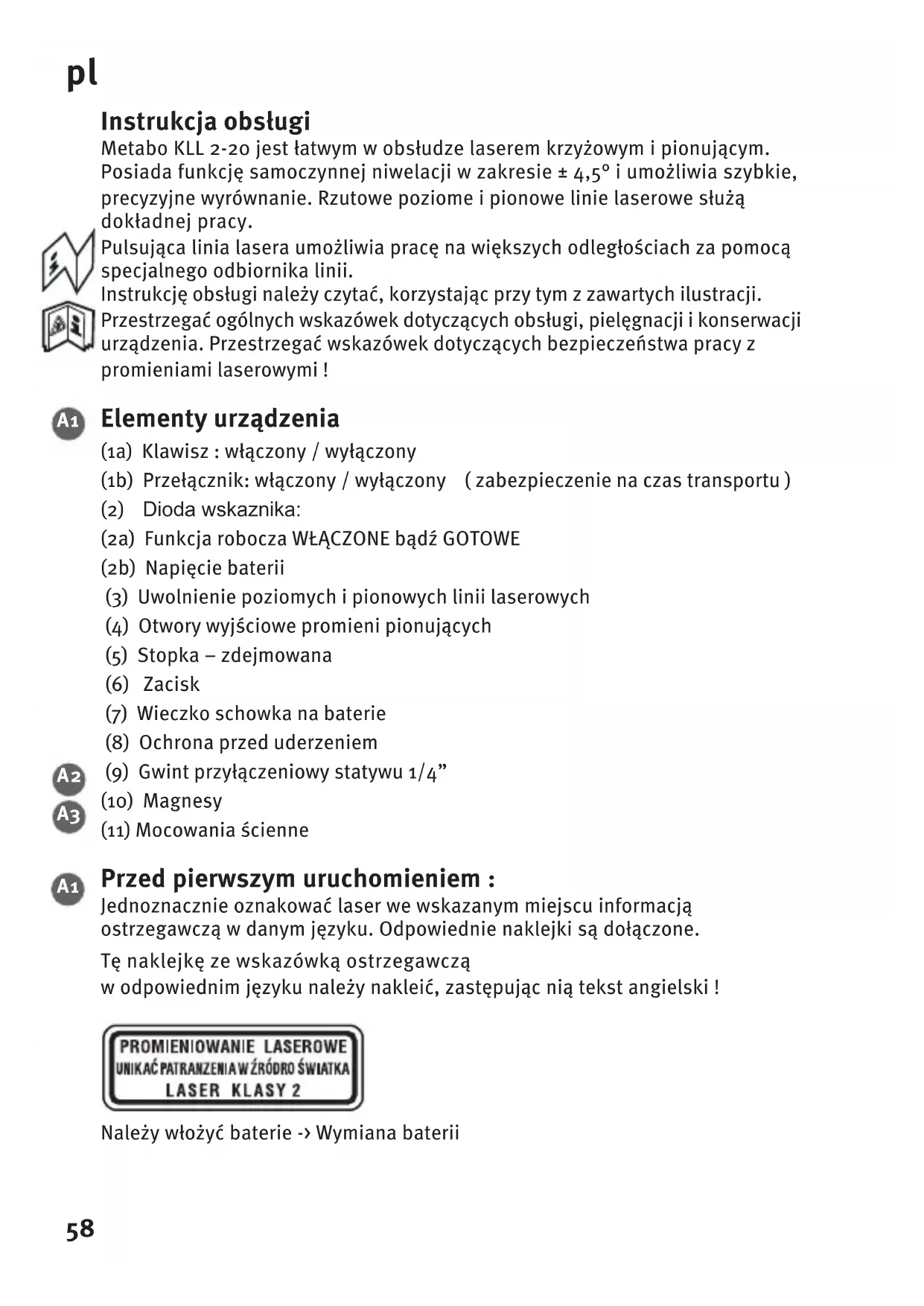 Instrukcja obsługi Metabo KLL 2-20 jest łatwym w obsłudze laserem krzyżowym i pionującym. Posiada funkcję samoczynnej niwelacji w zakresie ± 4,5° i umożliwia szybkie, precyzyjne wyrównanie. Rzutowe poziome i pionowe linie laserowe służą dokładnej pracy. Pulsująca linia lasera umożliwia pracę na większych odległościach za pomocą specjalnego odbiornika linii. Instrukcję obsługi należy czytać, korzystając przy tym z zawartych ilustracji. Przestrzegać ogólnych wskazówek dotyczących obsługi, pielęgnacji i konserwacji urządzenia. Przestrzegać wskazówek dotyczących bezpieczeństwa pracy z promieniami laserowymi ! Elementy urządzenia (1a) Klawisz : włączony / wyłączony (1b) Przełącznik: włączony / wyłączony ( zabezpieczenie na czas transportu ) (2) Dioda wskaznika: (2a) Funkcja robocza WŁĄCZONE bądź GOTOWE (2b) Napięcie baterii (3) Uwolnienie poziomych i pionowych linii laserowych (4) Otwory wyjściowe promieni pionujących (5) Stopka – zdejmowana (6) Zacisk (7) Wieczko schowka na baterie (8) Ochrona przed uderzeniem (9) Gwint przyłączeniowy statywu 1/4” (10) Magnesy (11) Mocowania ścienne Przed pierwszym uruchomieniem : Jednoznacznie oznakować laser we wskazanym miejscu informacją ostrzegawczą w danym języku. Odpowiednie naklejki są dołączone. Tę naklejkę ze wskazówką ostrzegawczą w odpowiednim języku należy nakleić, zastępując nią tekst angielski ! Należy włożyć baterie -> Wymiana baterii