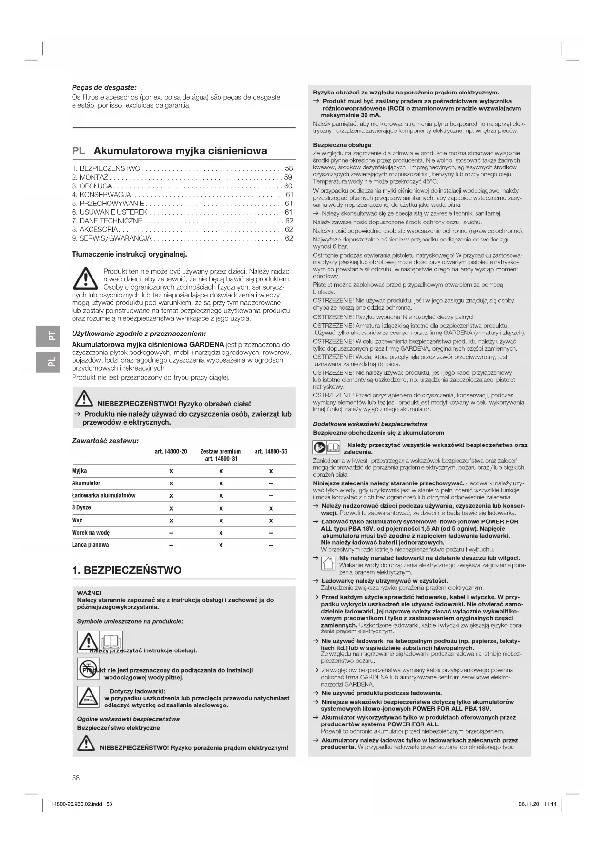 Tłumaczenie instrukcji oryginalnej. Produkt ten nie może być używany przez dzieci. Należy nadzo- rować dzieci, aby zapewnić, że nie będą bawić się produktem. Osoby o ograniczonych zdolnościach fizycznych, sensorycz- nych lub psychicznych lub też nieposiadające doświadczenia i wiedzy mogą używać produktu pod warunkiem, że są przy tym nadzorowane lub zostały poinstruowane na temat bezpiecznego użytkowania produktu oraz rozumieją niebezpieczeństwa wynikające z jego użycia. Użytkowanie zgodnie zprzeznaczeniem: Akumulatorowa myjka ciśnieniowa GARDENA jest przeznaczona do czyszczenia płytek podłogowych, mebli inarzędzi ogrodowych, rowerów, pojazdów, łodzi oraz łagodnego czyszczenia wyposażenia w ogrodach przydomowych irekreacyjnych. Produkt nie jest przeznaczony do trybu pracy ciągłej. NIEBEZPIECZEŃSTWO! Ryzyko obrażeń ciała! v Produktu nie należy używać do czyszczenia osób, zwierząt lub przewodów elektrycznych. Zawartość zestawu: art. 14800-20 Zestaw premium art. 14800-31 art. 14800-55 Myjka x x x Akumulator x x – Ładowarka akumulatorów x x – 3 Dysze x x x Wąż x x x Worek na wodę – x – Lanca pianowa – x – Peças de desgaste: Os filtros e acessórios (por ex. bolsa de água) são peças de desgaste eestão, por isso, excluídas da garantia.