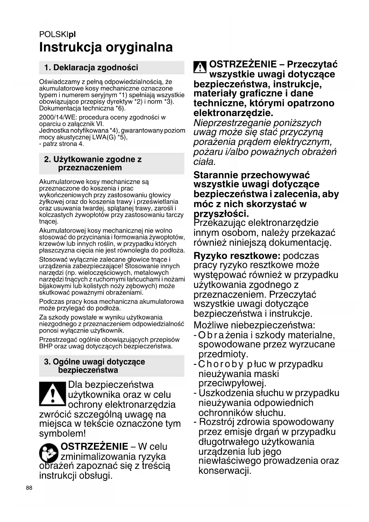 Instrukcja oryginalna Oświadczamy z pełną odpowiedzialnością, że akumulatorowe kosy mechaniczne oznaczone typem i numerem seryjnym *1) spełniają wszystkie obowiązujące przepisy dyrektyw *2) i norm *3). Dokumentacja techniczna *6). 2000/14/WE: procedura oceny zgodności w oparciu o załącznik VI. Jednostka notyfikowana *4), gwarantowany poziom mocy akustycznej LWA(G) *5), - patrz strona 4. Akumulatorowe kosy mechaniczne są przeznaczone do koszenia i prac wykończeniowych przy zastosowaniu głowicy żyłkowej oraz do koszenia trawy i prześwietlania oraz usuwania twardej, splątanej trawy, zarośli i kolczastych żywopłotów przy zastosowaniu tarczy tnącej. Akumulatorowej kosy mechanicznej nie wolno stosować do przycinania i formowania żywopłotów, krzewów lub innych roślin, w przypadku których płaszczyzna cięcia nie jest równoległa do podłoża. Stosować wyłącznie zalecane głowice tnące i urządzenia zabezpieczające! Stosowanie innych narz ędzi (np. wieloczęściowych, metalowych narzędzi tnących z ruchomymi łańcuchami i nożami bijakowymi lub kolistych noży zębowych) może skutkować poważnymi obrażeniami. Podczas pracy kosa mechaniczna akumulatorowa może przylegać do podłoża. Za szkody powstałe w wyniku użytkowania niezgodnego z przeznaczeniem odpowiedzialność ponosi wyłącznie użytkownik. Przestrzegać ogólnie obowiązujących przepisów BHP oraz uwag dotyczących bezpieczeństwa. Dla bezpieczeństwa użytkownika oraz w celu ochrony elektronarzędzia zwrócić szczególną uwagę na miejsca w tekście oznaczone tym symbolem! OSTRZEŻENIE – W celu zminimalizowania ryzyka obrażeń zapoznać się z treścią instrukcji obsługi. OSTRZEŻENIE – Przeczytać wszystkie uwagi dotyczące bezpieczeństwa, instrukcje, materiały graficzne i dane techniczne, którymi opatrzono elektronarzędzie. Nieprzestrzeganie poniższych uwag może się stać przyczyną porażenia prądem elektrycznym, pożaru i/albo poważnych obrażeń ciała. Starannie przechowywać wszystkie uwagi dotyczące bezpieczeństwa i zalecenia, aby móc z nich skorzystać w przysz łości. Przekazując elektronarzędzie innym osobom, należy przekazać również niniejszą dokumentację. Ryzyko resztkowe: podczas pracy ryzyko resztkowe może występować również w przypadku użytkowania zgodnego z przeznaczeniem. Przeczytać wszystkie uwagi dotyczące bezpieczeństwa i instrukcje. Możliwe niebezpieczeństwa: -Obrażenia i szkody materialne, spowodowane przez wyrzucane przedmioty. -Choroby płuc w przypadku nieużywania maski przeciwpyłowej. - Uszkodzenia słuchu w przypadku nieużywania odpowiednich ochronników słuchu. - Rozstrój zdrowia spowodowany przez emisje drgań w przypadku długotrwałego użytkowania urządzenia lub jego niewłaściwego prowadzenia oraz konserwacji.