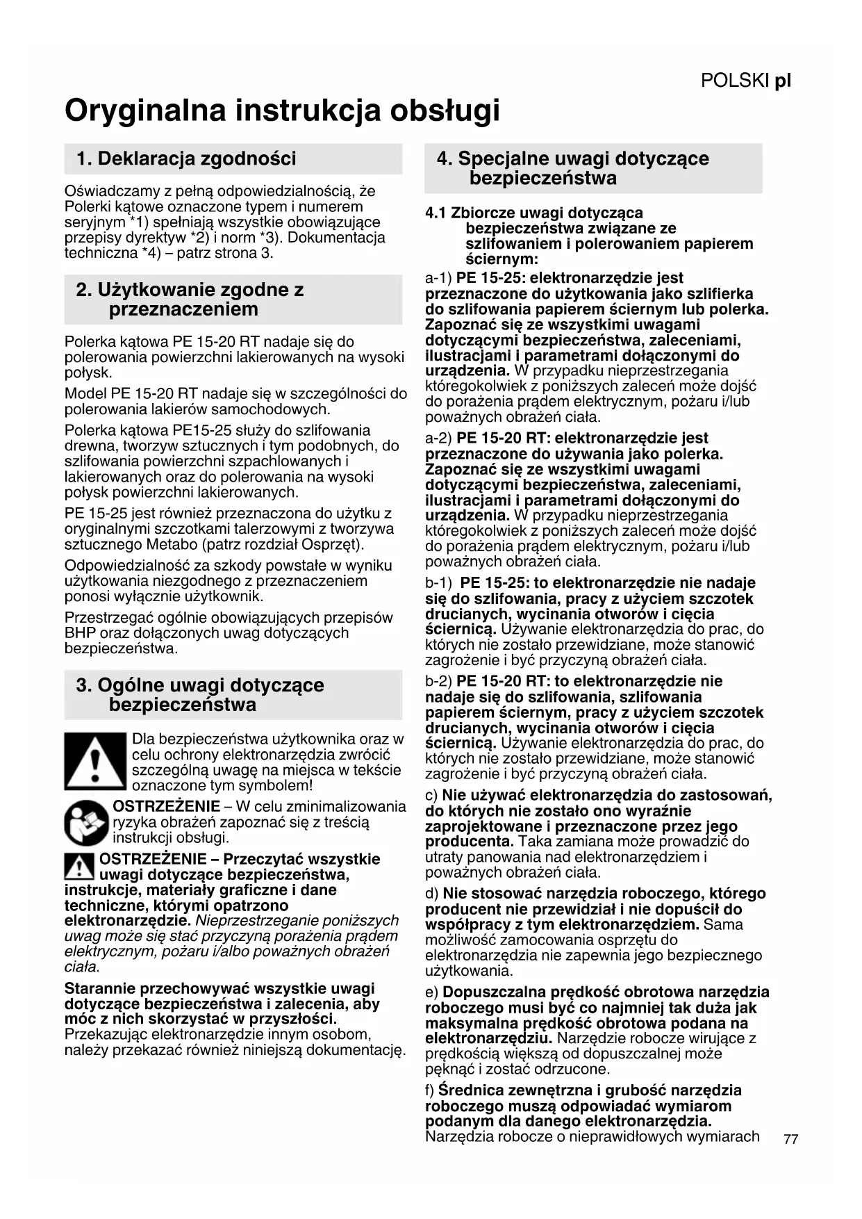 Oryginalna instrukcja obsługi Oświadczamy z pełną odpowiedzialnością, że Polerki kątowe oznaczone typem i numerem seryjnym *1) spełniają wszystkie obowiązujące przepisy dyrektyw *2) i norm *3). Dokumentacja techniczna *4) – patrz strona 3. Polerka kątowa PE 15-20 RT nadaje się do polerowania powierzchni lakierowanych na wysoki połysk. Model PE 15-20 RT nadaje się w szczególności do polerowania lakierów samochodowych. Polerka kątowa PE15-25 służy do szlifowania drewna, tworzyw sztucznych i tym podobnych, do szlifowania powierzchni szpachlowanych i lakierowanych oraz do polerowania na wysoki połysk powierzchni lakierowanych. PE 15-25 jest również przeznaczona do użytku z oryginalnymi szczotkami talerzowymi z tworzywa sztucznego Metabo (patrz rozdział Osprzęt). Odpowiedzialność za szkody powstałe w wyniku użytkowania niezgodnego z przeznaczeniem ponosi wyłącznie użytkownik. Przestrzegać ogólnie obowiązujących przepisów BHP oraz dołączonych uwag dotyczących bezpieczeństwa. Dla bezpieczeństwa użytkownika oraz w celu ochrony elektronarzędzia zwrócić szczególną uwagę na miejsca w tekście oznaczone tym symbolem! OSTRZEŻENIE – W celu zminimalizowania ryzyka obrażeń zapoznać się z treścią instrukcji obsługi. OSTRZEŻENIE – Przeczytać wszystkie uwagi dotyczące bezpieczeństwa, instrukcje, materiały graficzne i dane techniczne, którymi opatrzono elektronarzędzie. Nieprzestrzeganie poniższych uwag może się stać przyczyną porażenia prądem elektrycznym, pożaru i/albo poważnych obrażeń ciała. Starannie przechowywać wszystkie uwagi dotyczące bezpieczeństwa i zalecenia, aby móc z nich skorzystać w przyszłości. Przekazując elektronarzędzie innym osobom, należy przekazać również niniejszą dokumentację.