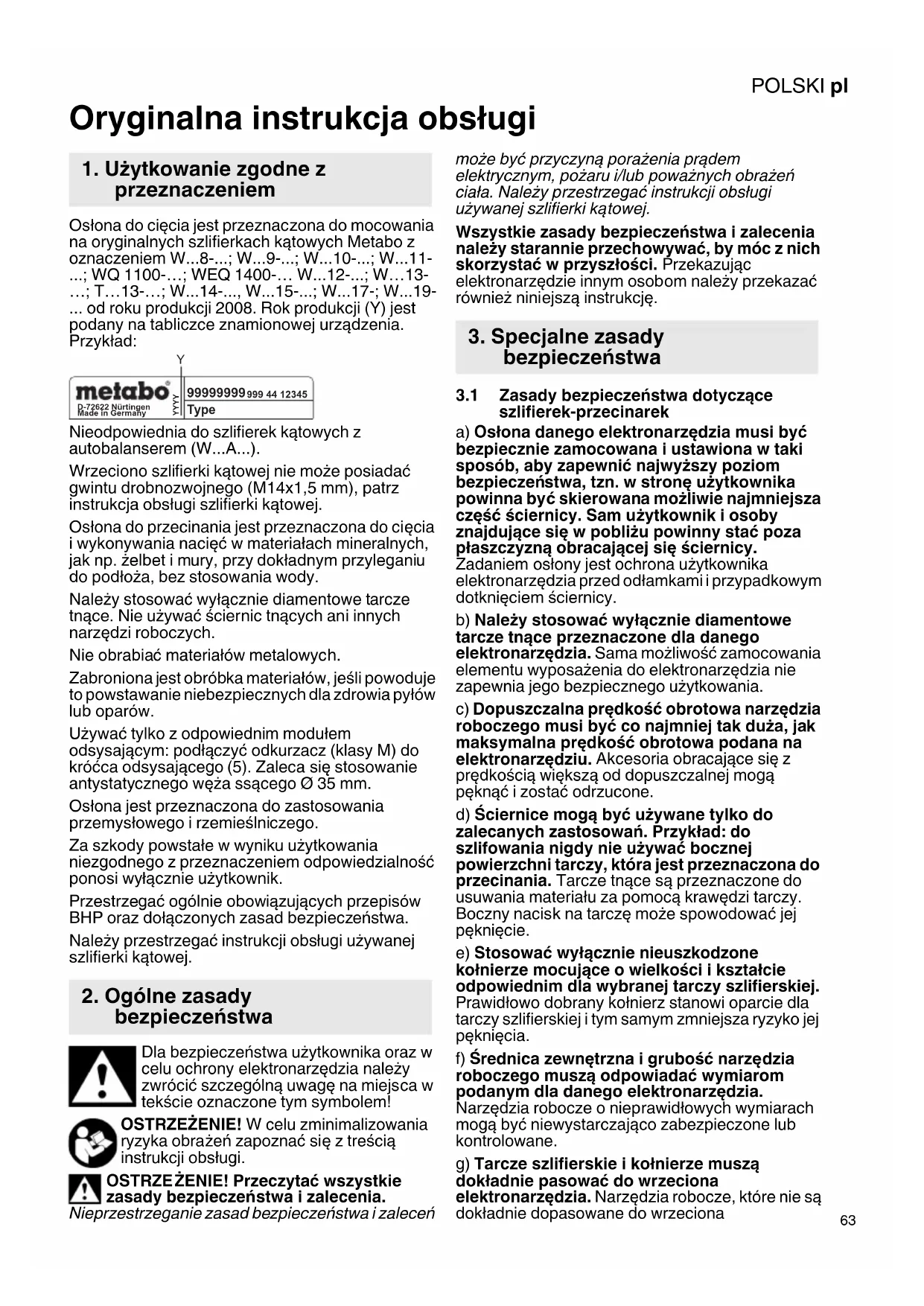 - Oryginalna instrukcja obsługi Osłona do cięcia jest przeznaczona do mocowania na oryginalnych szlifierkach kątowych Metabo z oznaczeniem W - p. 8
