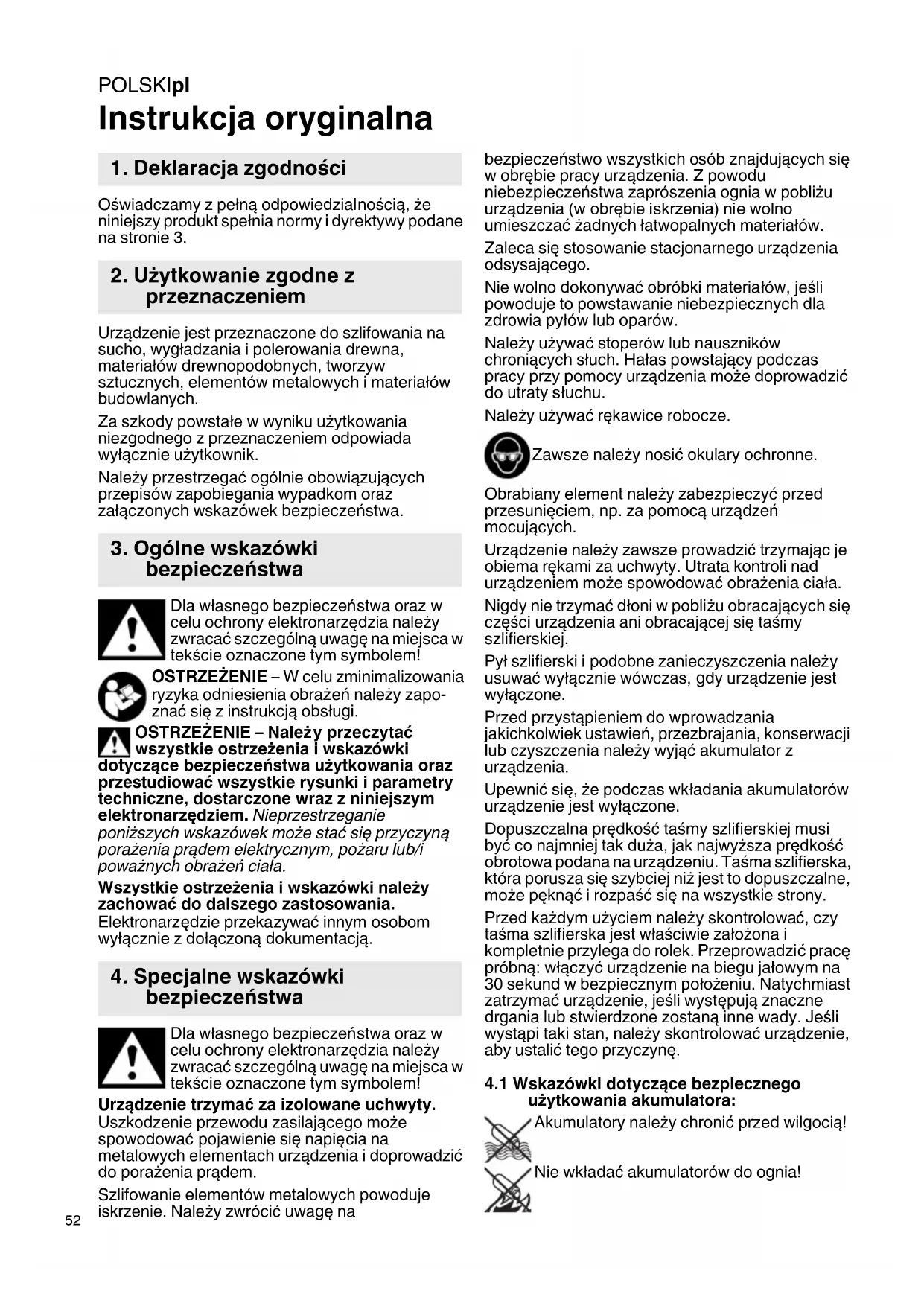Instrukcja oryginalna Oświadczamy z pełną odpowiedzialnością, że niniejszy produkt spełnia normy i dyrektywy podane na stronie 3. Urządzenie jest przeznaczone do szlifowania na sucho, wygładzania i polerowania drewna, materiałów drewnopodobnych, tworzyw sztucznych, elementów metalowych i materiałów budowlanych. Za szkody powstałe w wyniku użytkowania niezgodnego z przeznaczeniem odpowiada wyłącznie użytkownik. Należy przestrzegać ogólnie obowiązujących przepisów zapobiegania wypadkom oraz załączonych wskazówek bezpieczeństwa. Dla własnego bezpieczeństwa oraz w celu ochrony elektronarzędzia należy zwracać szczególną uwagę na miejsca w tekście oznaczone tym symbolem! OSTRZEŻENIE – W celu zminimalizowania ryzyka odniesienia obrażeń należy zapo- znać się z instrukcją obsługi. OSTRZEŻENIE – Należ y przeczytać wszystkie ostrzeżenia i wskazówki dotyczące bezpieczeństwa użytkowania oraz przestudiować wszystkie rysunki i parametry techniczne, dostarczone wraz z niniejszym elektronarzędziem. Nieprzestrzeganie poniższych wskazówek może stać się przyczyną porażenia prądem elektrycznym, pożaru lub/i poważnych obrażeń ciała. Wszystkie ostrzeżenia i wskazówki należy zachować do dalszego zastosowania. Elektronarzędzie przekazywać innym osobom wyłącznie z dołączoną dokumentacją. Dla własnego bezpieczeństwa oraz w celu ochrony elektronarzędzia należy zwracać szczególną uwagę na miejsca w tekście oznaczone tym symbolem! Urządzenie trzymać za izolowane uchwyty. Uszkodzenie przewodu zasilającego może spowodować pojawienie się napięcia na metalowych elementach urządzenia i doprowadzić do porażenia prądem. Szlifowanie elementów metalowych powoduje iskrzenie. Należy zwrócić uwagę na bezpieczeństwo wszystkich osób znajdujących się w obrębie pracy urządzenia. Z powodu niebezpieczeństwa zaprószenia ognia w pobliżu urządzenia (w obrębie iskrzenia) nie wolno umieszczać żadnych łatwopalnych materiałów. Zaleca się stosowanie stacjonarnego urządzenia odsysającego. Nie wolno dokonywać obróbki materiałów, jeśli powoduje to powstawanie niebezpiecznych dla zdrowia pyłów lub oparów. Należy używać stoperów lub nauszników chroniących słuch. Hałas powstający podczas pracy przy pomocy urządzenia może doprowadzić do utraty s łuchu. Należy używać rękawice robocze. Zawsze należy nosić okulary ochronne. Obrabiany element należy zabezpieczyć przed przesunięciem, np. za pomocą urządzeń mocujących. Urządzenie należy zawsze prowadzić trzymając je obiema rękami za uchwyty. Utrata kontroli nad urządzeniem może spowodować obrażenia ciała. Nigdy nie trzymać dłoni w pobliżu obracających się części urządzenia ani obracającej się taśmy szlifierskiej. Pył szlifierski i podobne zanieczyszczenia należy usuwać wyłącznie wówczas, gdy urządzenie jest wyłączone. Przed przystąpieniem do wprowadzania jakichkolwiek ustawień, przezbrajania, konserwacji lub czyszczenia należy wyjąć akumulator z urządzenia. Upewnić się, że podczas wkładania akumulatorów urządzenie jest wyłączone. Dopuszczalna prędkość taśmy szlifierskiej musi być co najmniej tak duża, jak najwyższa prędkość obrotowa podana na urządzeniu. Taśma szlifierska, która porusza się szybciej niż jest to dopuszczalne, może pęknąć i rozpaść się na wszystkie strony. Przed każdym użyciem należy skontrolować, czy taśma szlifierska jest właściwie założona i kompletnie przylega do rolek. Przeprowadzić pracę próbną: włączyć urządzenie na biegu jałowym na 30 sekund w bezpiecznym położ eniu. Natychmiast zatrzymać urządzenie, jeśli występują znaczne drgania lub stwierdzone zostaną inne wady. Jeśli wystąpi taki stan, należy skontrolować urządzenie, aby ustalić tego przyczynę.