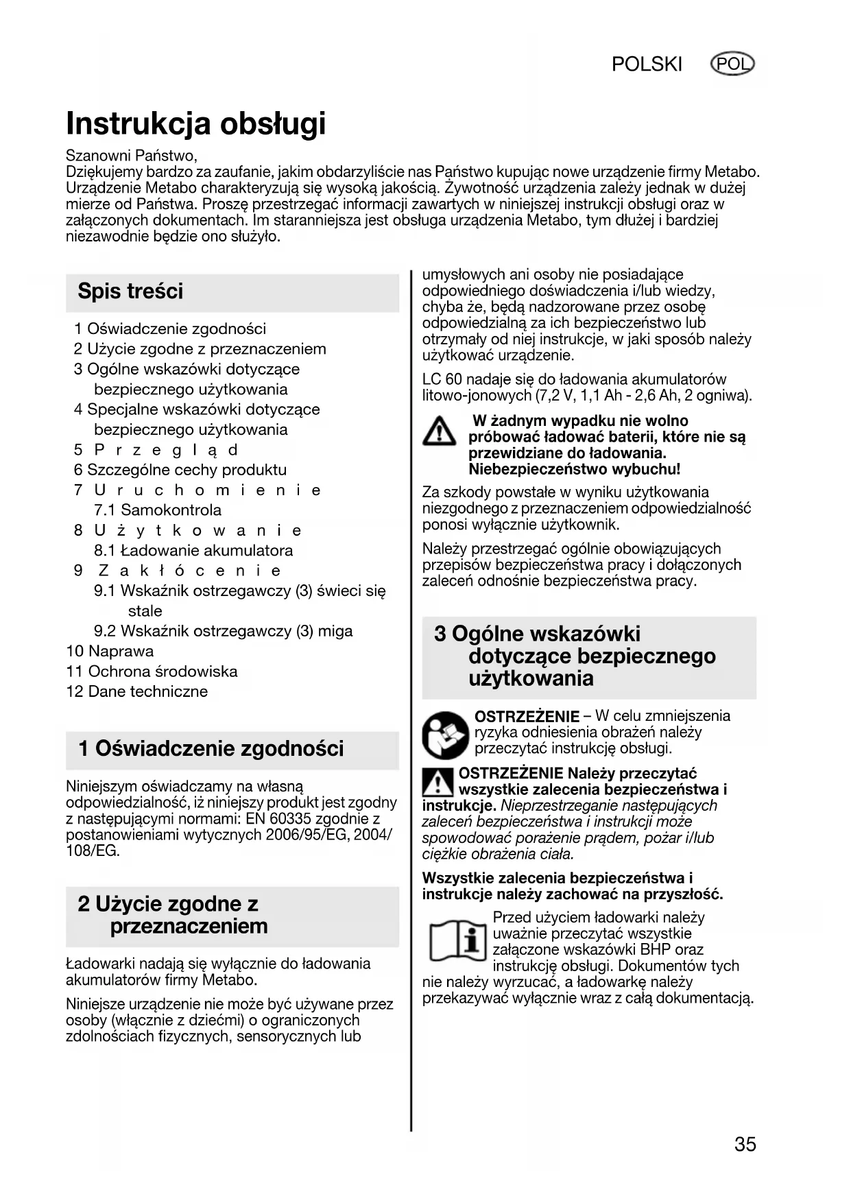 Ładowarki nadają się wyłącznie do ładowania akumulatorów firmy Metabo. Niniejsze urządzenie nie może być używane przez osoby (włącznie z dziećmi) o ograniczonych zdolnościach fizycznych, sensorycznych lub umysłowych ani osoby nie posiadające odpowiedniego doświadczenia i/lub wiedzy, chyba że, będą nadzorowane przez osobę odpowiedzialną za ich bezpieczeństwo lub otrzymały od niej instrukcje, w jaki sposób należy użytkować urządzenie. LC 60 nadaje się do ładowania akumulatorów litowo-jonowych (7,2 V, 1,1 Ah - 2,6 Ah, 2 ogniwa). W żadnym wypadku nie wolno próbować ładować baterii, które nie są przewidziane do ładowania. Niebezpieczeństwo wybuchu! Za szkody powstałe w wyniku użytkowania niezgodnego z przeznaczeniem odpowiedzialność ponosi wyłącznie użytkownik. Należy przestrzegać ogólnie obowiązujących przepisów bezpieczeństwa pracy i dołączonych zaleceń odnośnie bezpieczeństwa pracy. OSTRZEŻENIE – W celu zmniejszenia ryzyka odniesienia obrażeń należy przeczytać instrukcję obsługi. OSTRZEŻENIE Należy przeczytać wszystkie zalecenia bezpieczeństwa i instrukcje. Nieprzestrzeganie następujących zaleceń bezpieczeństwa i instrukcji może spowodować porażenie prądem, pożar i/lub ciężkie obrażenia ciała. Wszystkie zalecenia bezpieczeństwa i instrukcje należy zachować na przyszłość. Przed użyciem ładowarki należy uważnie przeczytać wszystkie załączone wskazówki BHP oraz instrukcję obsługi. Dokumentów tych nie należy wyrzucać, a ładowarkę należy przekazywać wyłącznie wraz z całą dokumentacją. Instrukcja obsługi Szanowni Państwo, Dziękujemy bardzo za zaufanie, jakim obdarzyliście nas Państwo kupując nowe urządzenie firmy Metabo. Urządzenie Metabo charakteryzują się wysoką jakością. Żywotność urządzenia zależy jednak w dużej mierze od Państwa. Proszę przestrzegać informacji zawartych w niniejszej instrukcji obsługi oraz w załączonych dokumentach. Im staranniejsza jest obsługa urządzenia Metabo, tym dłużej i bardziej niezawodnie będzie ono służyło. Spis treści 1 Oświadczenie zgodności 2 Użycie zgodne z przeznaczeniem 3 Ogólne wskazówki dotyczące bezpiecznego użytkowania36 POLSKI POL Należy zwracać uwagę na miejsca w tekście oznaczone tym symbolem i służące bezpieczeństwu osób obsługujących, jak i bezpieczeństwu ładowarki! Ostrzeżenie przed niebezpiecznym napięciem elektrycznym! Z uszkodzonych akumulatorów litowo-jonowych może wyciec lekko kwasowa ciecz palna! W przypadku wydostania się cieczy z akumulatora i przedostania się jej na skórę należy bezzwłocznie spłukać to miejsce dużą ilością wody. W przypadku przedostania się cieczy z akumulatora do oczu należy przepłukać je czystą wodą i bezzwłocznie udać się do lekarza! Całkowicie naładowanego akumulatora nie wolno ponownie ładować! Nadmierne ładowanie uszkadza akumulator i skraca długość okresu użytkowania akumulatora! Ładowarkę należy stosować wyłącznie w pomieszczeniach! Należy chronić ładowarkę przed wilgocią! Dzieci powinny znajdować się pod nadzorem, aby zagwarantować, że nie będą bawiły się tym urządzeniem. Dzieci nie mogą znajdować się w pobliżu ładowarki względnie strefy roboczej! Ładowarkę należy przechowywać w taki sposób, aby nie była dostępna dla dzieci! W przypadku pojawienia się dymu lub ognia w ładowarce należy natychmiast wyciągnąć jej wtyczkę sieciową! Nie wolno używać żadnych uszkodzonych akumulatorów! Patrz strona 1. 1Akumulator * 2 Komora ładowania 3 Wskaźnik ostrzegawczy 4 Wskaźnik pracy